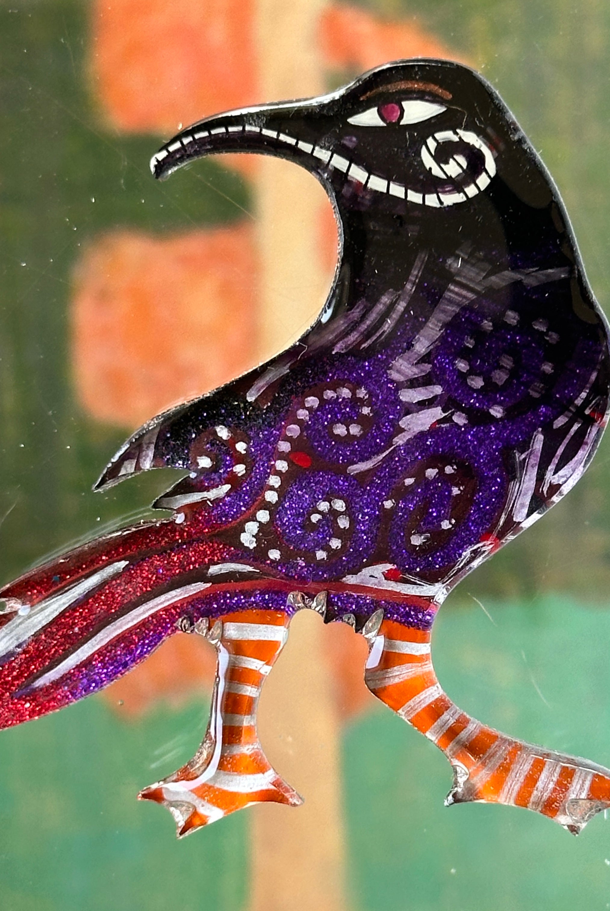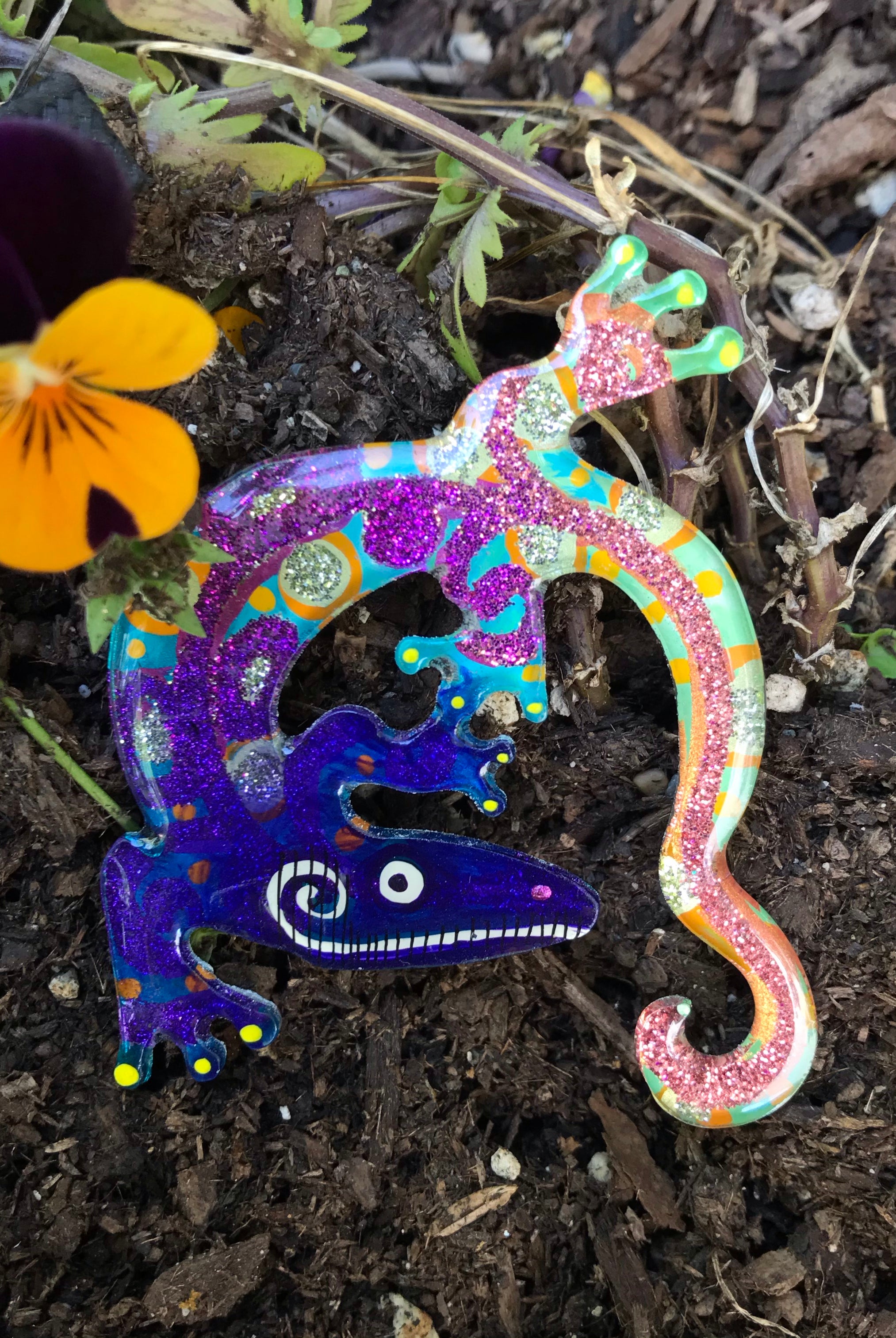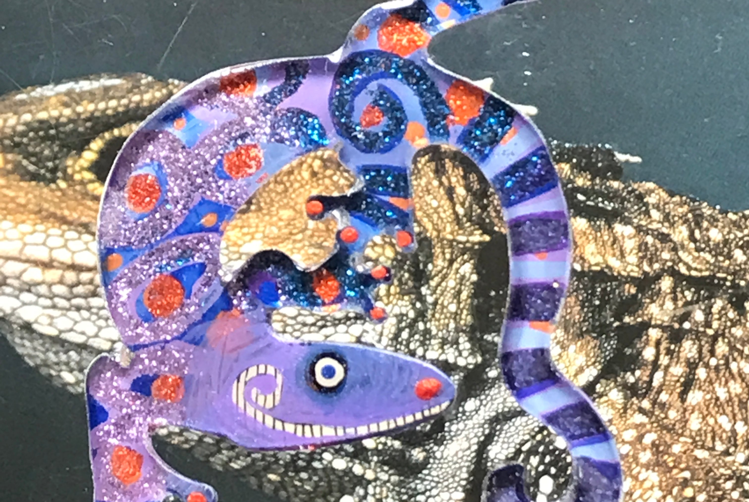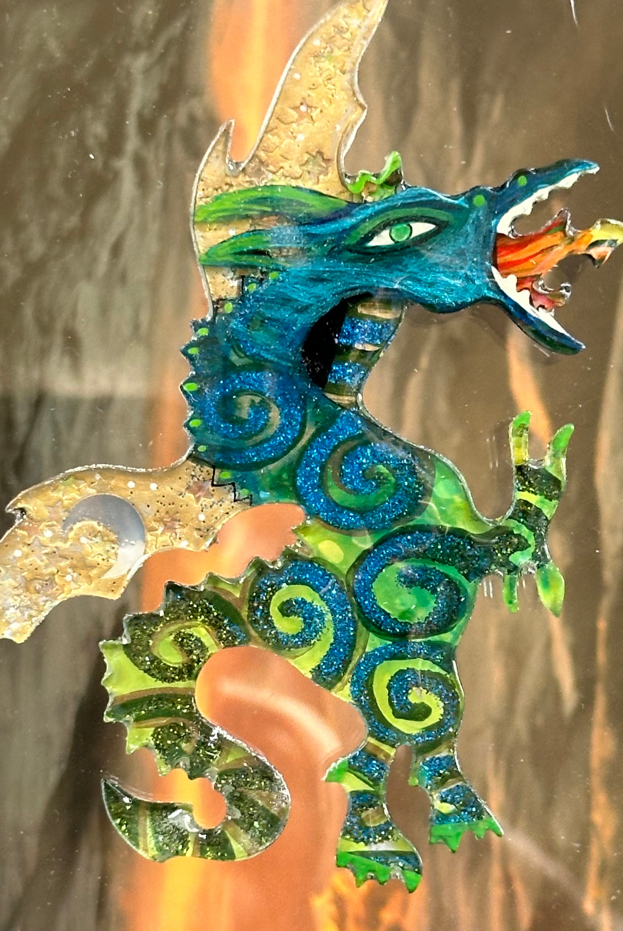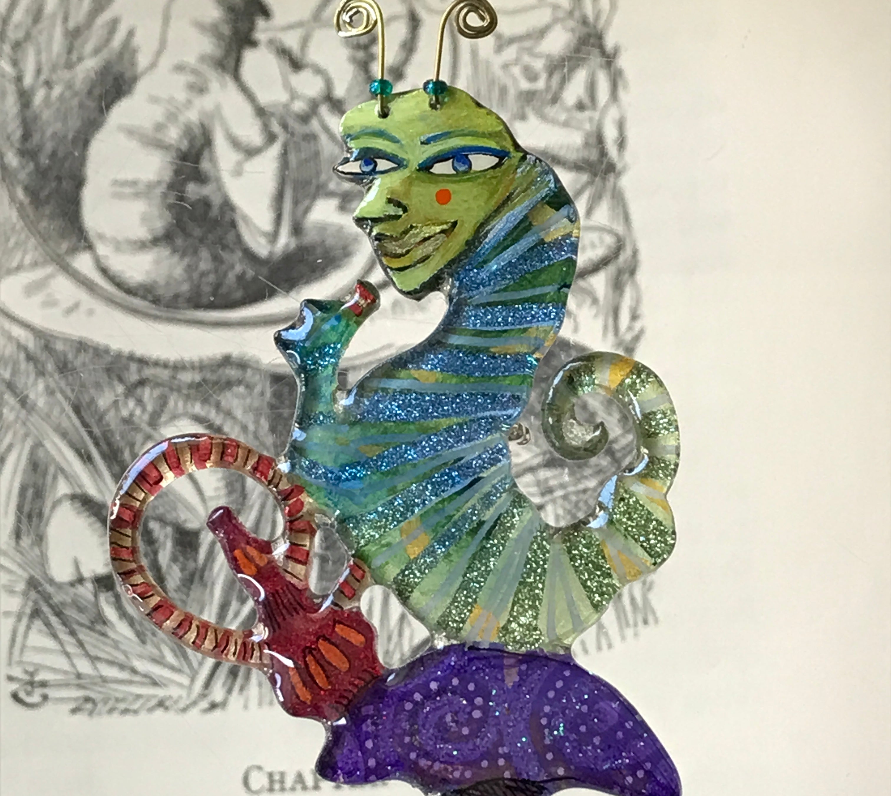 For me, these are little paintings that you can wear. If you are thinking of shrinky-dinks, I'm sure that was in my mind when I came up with lasercutting the shapes and then painting with the same paints I use on canvas. It's a multi layered process that takes a long time. The painting takes the longest, but it is the most rewarding. They are coated with a thick and sturdy glaze that brings out the depth and color.