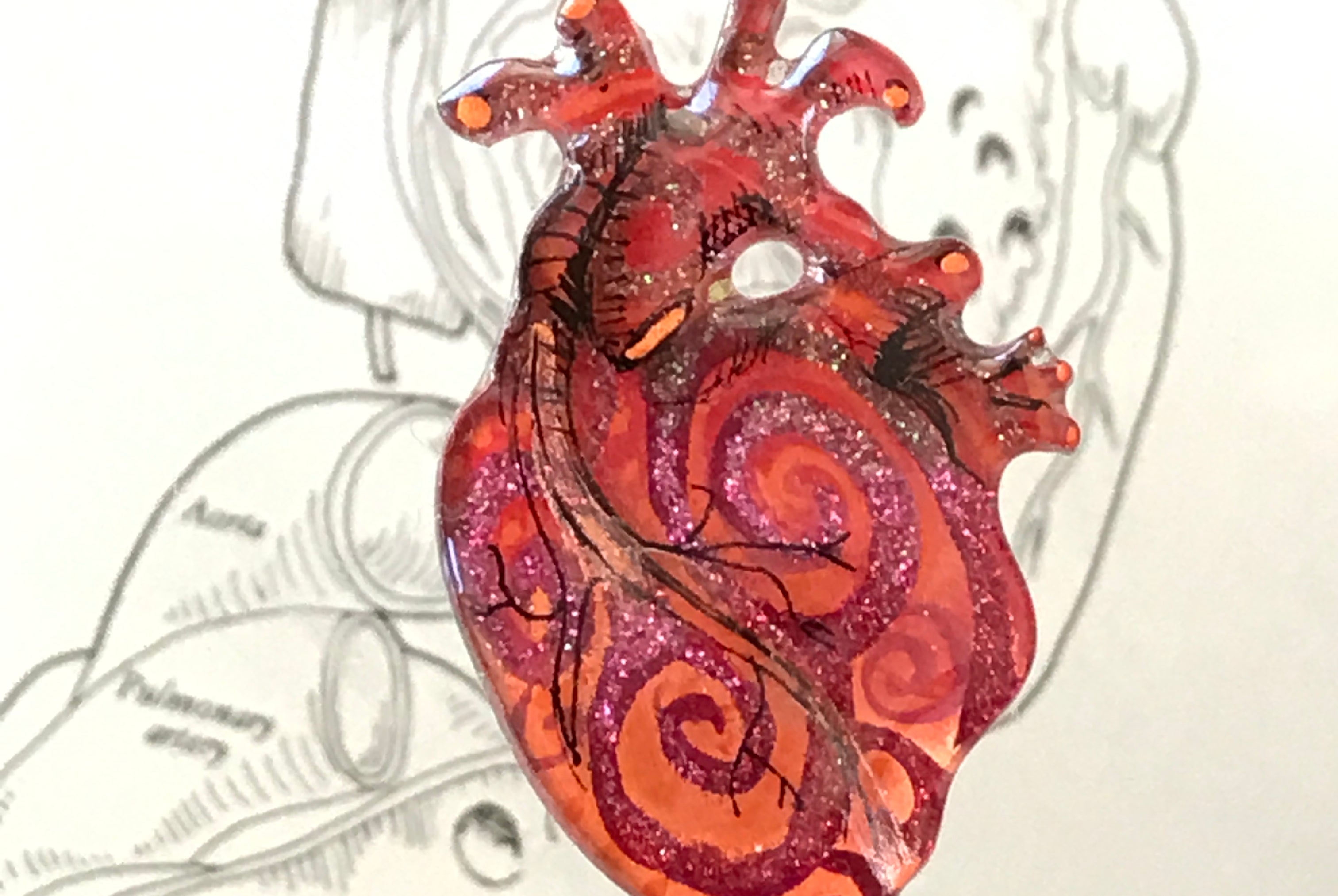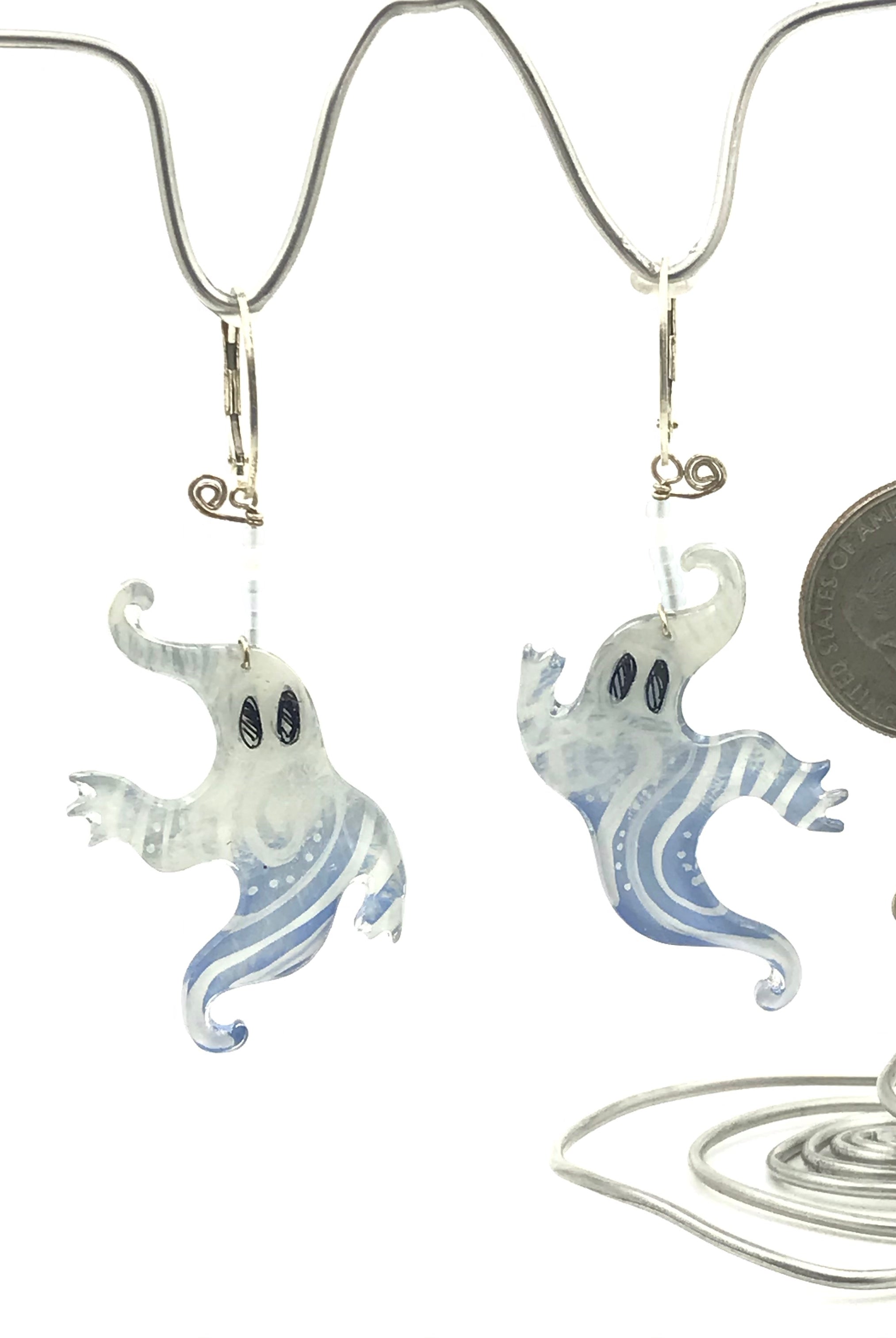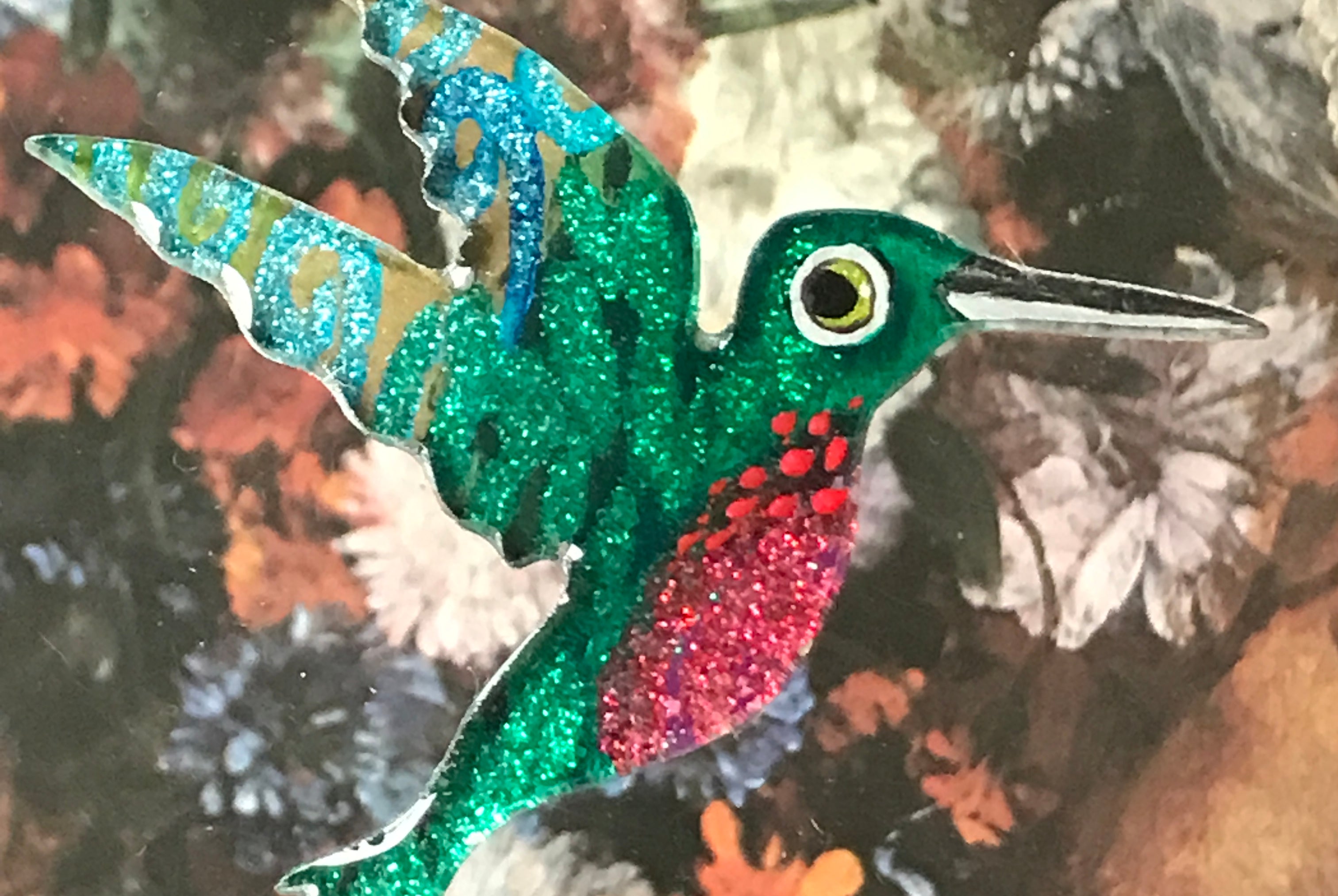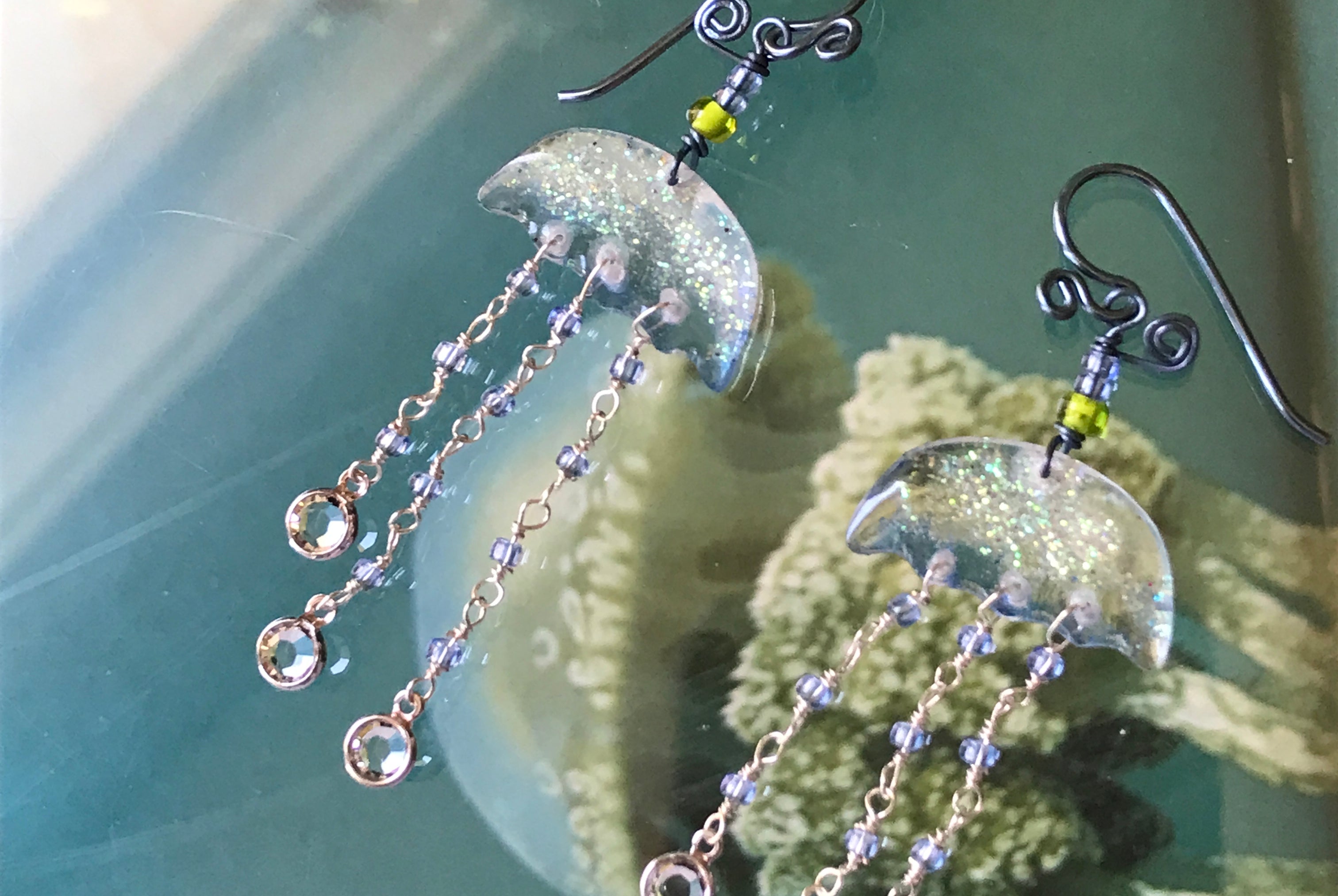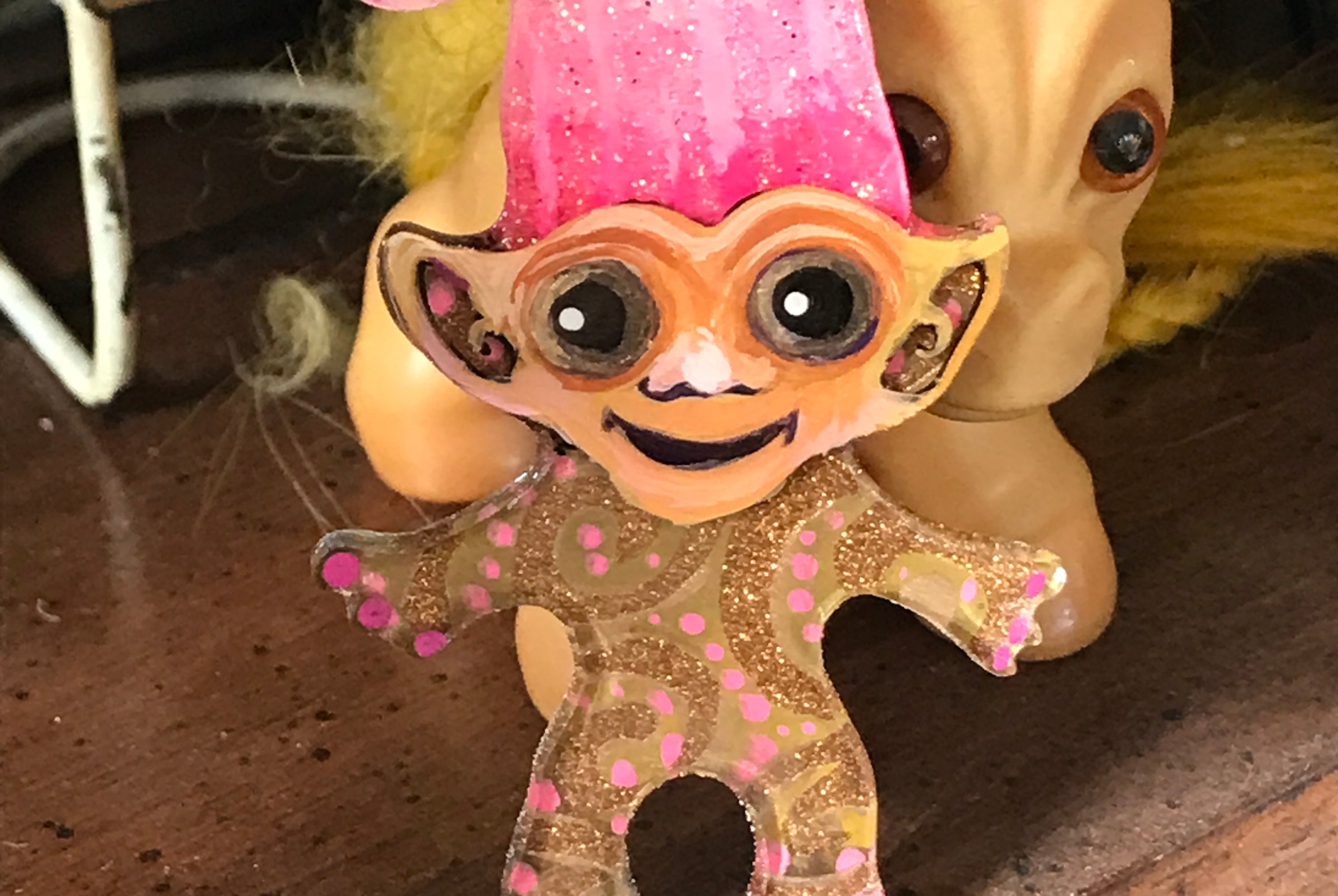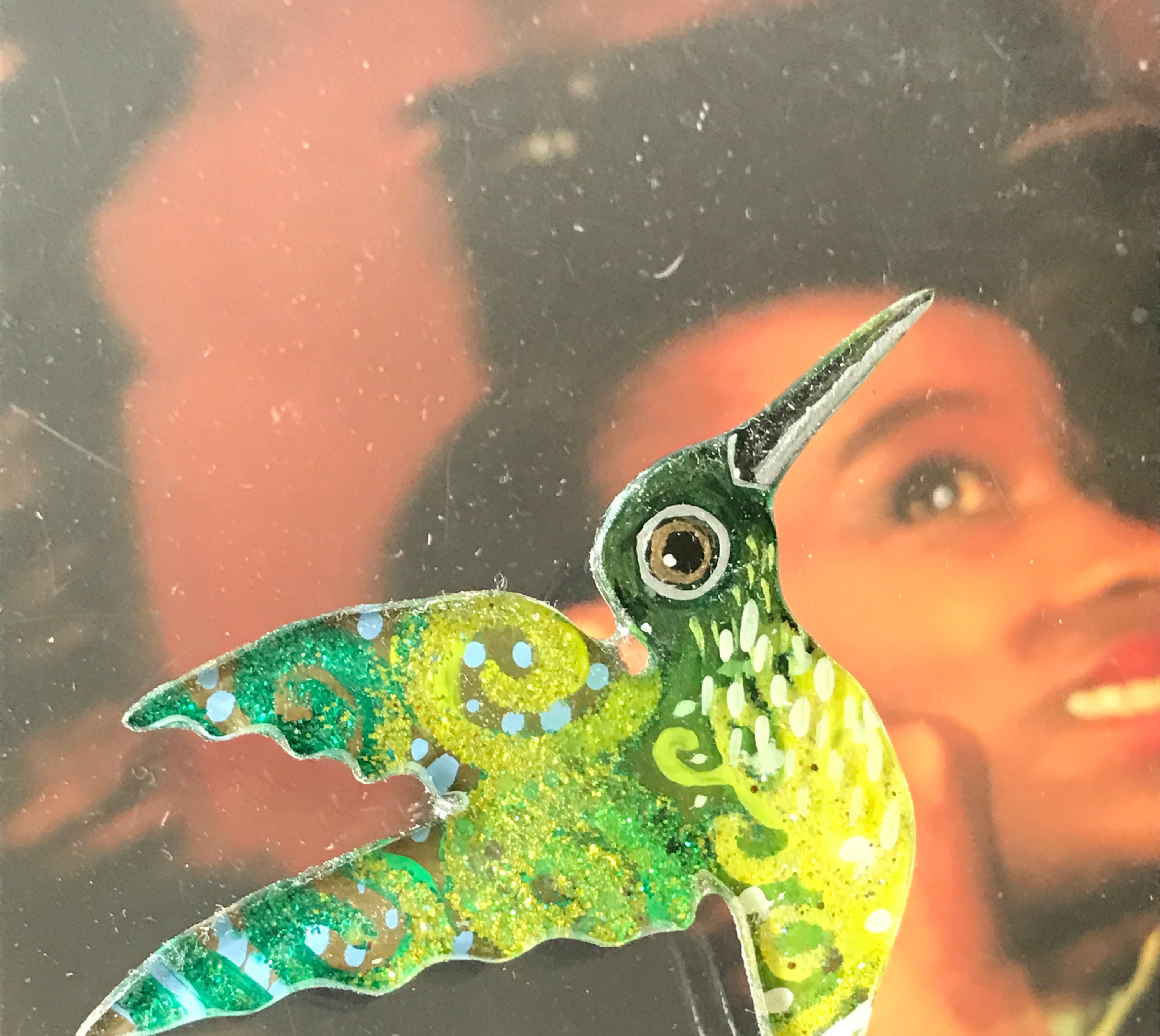 For me, these are little paintings that you can wear. If you are thinking of shrinky-dinks, I'm sure that was in my mind when I came up with lasercutting the shapes and then painting with the same paints I use on canvas. It's a multi layered process that takes a long time. The painting takes the longest, but it is the most rewarding. They are coated with a thick and sturdy glaze that brings out the depth and color.