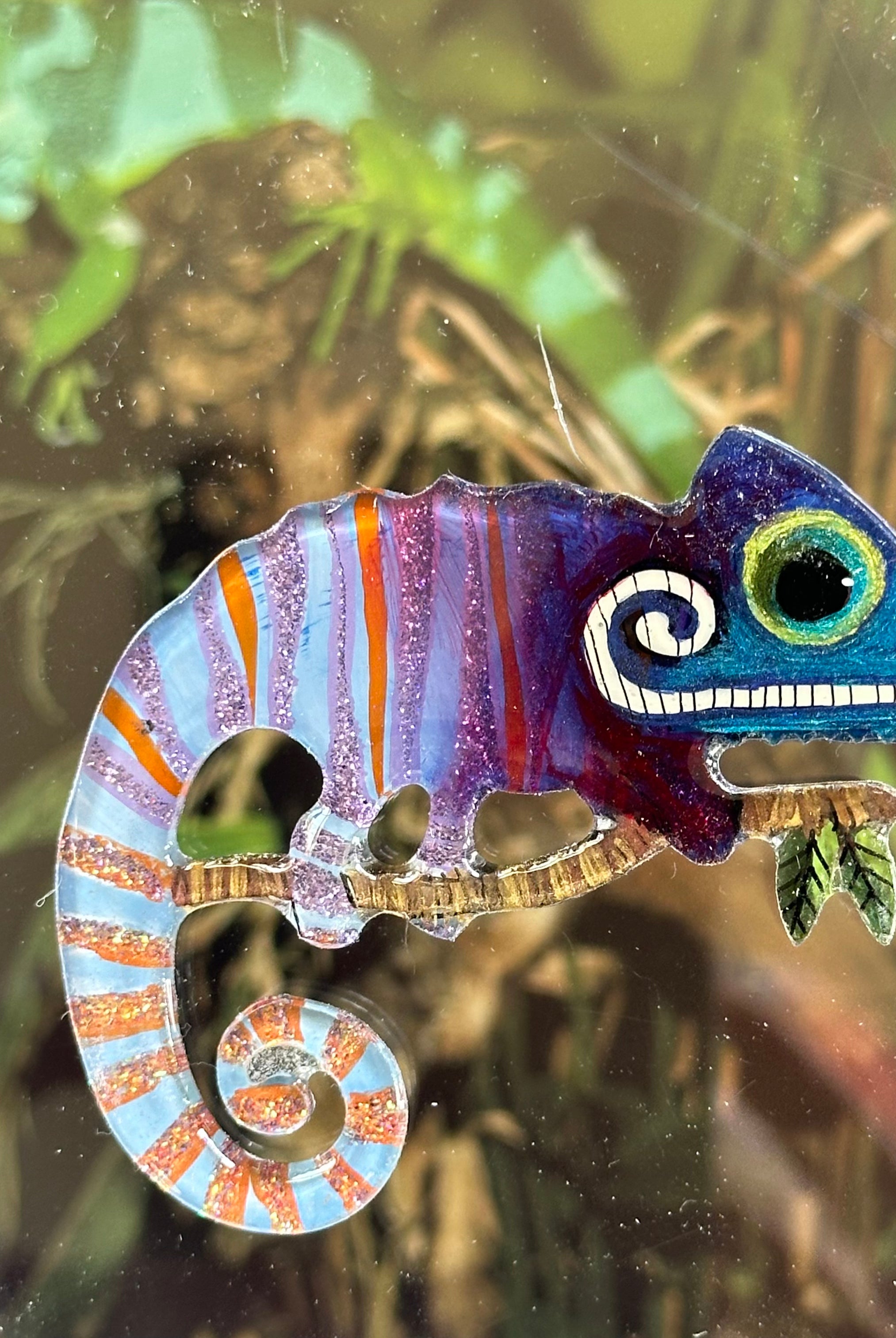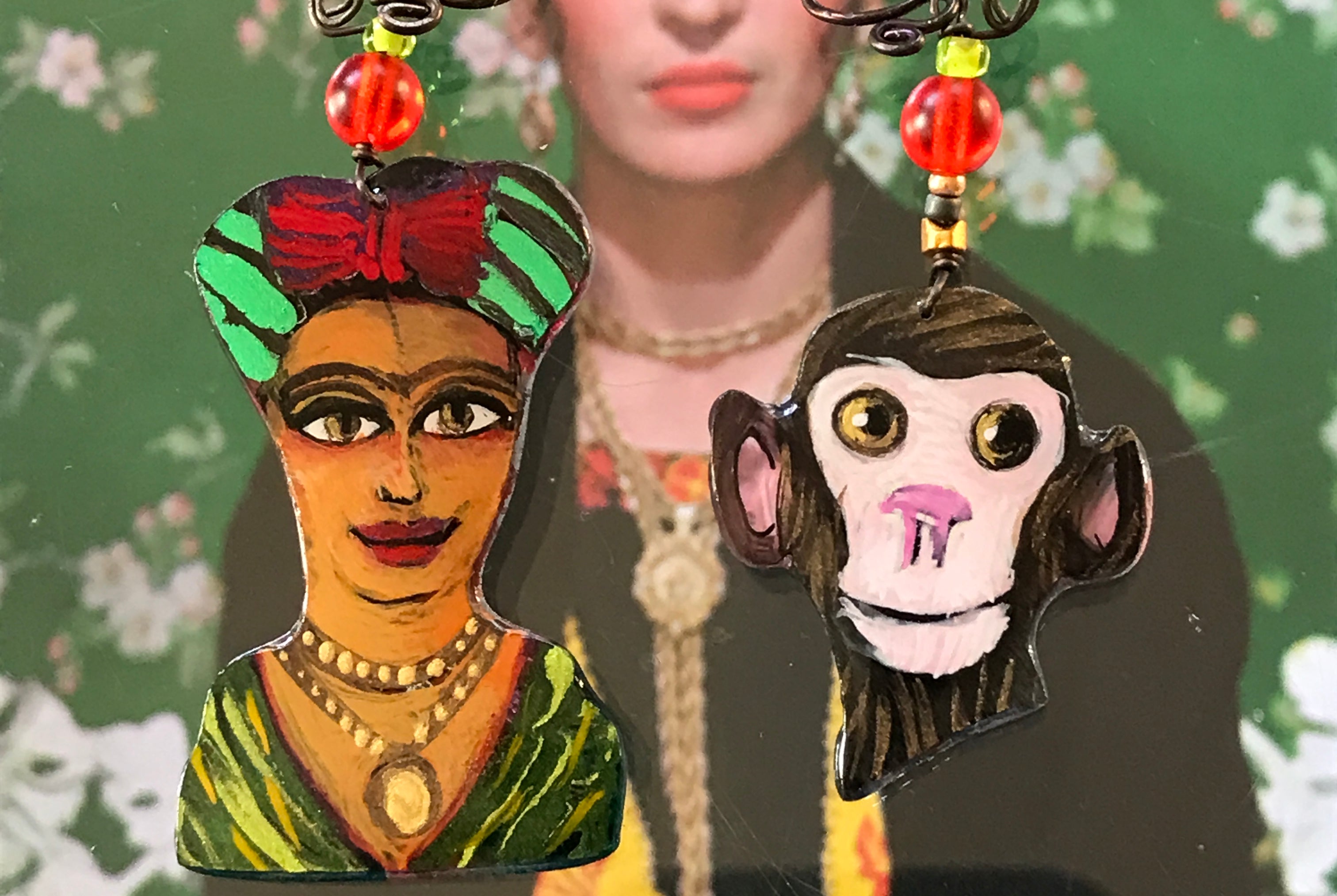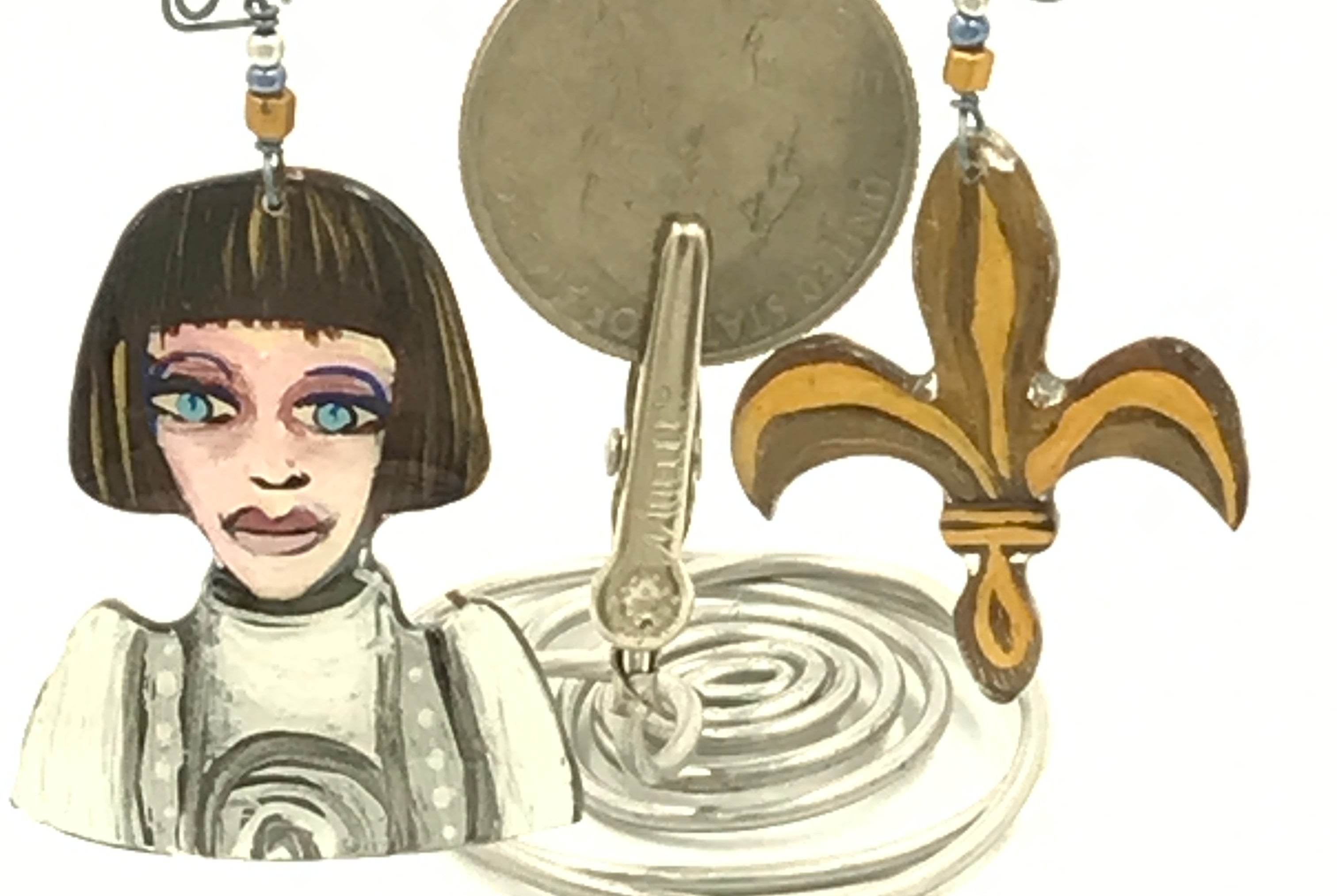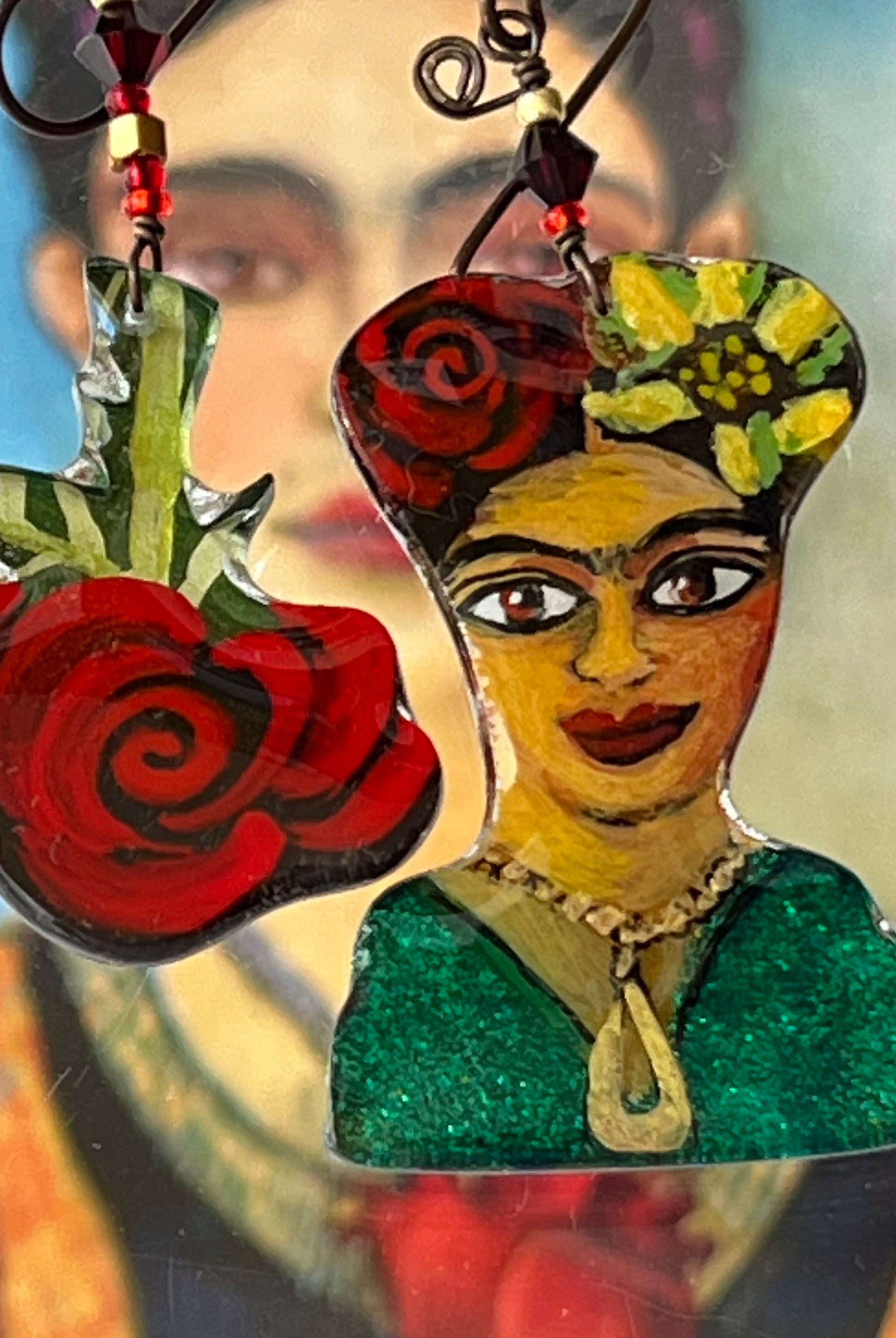For me, these are little paintings that you can wear. If you are thinking of shrinky-dinks, I'm sure that was in my mind when I came up with lasercutting the shapes and then painting with the same paints I use on canvas. It's a multi layered process that takes a long time. The painting takes the longest, but it is the most rewarding. They are coated with a thick and sturdy glaze that brings out the depth and color.