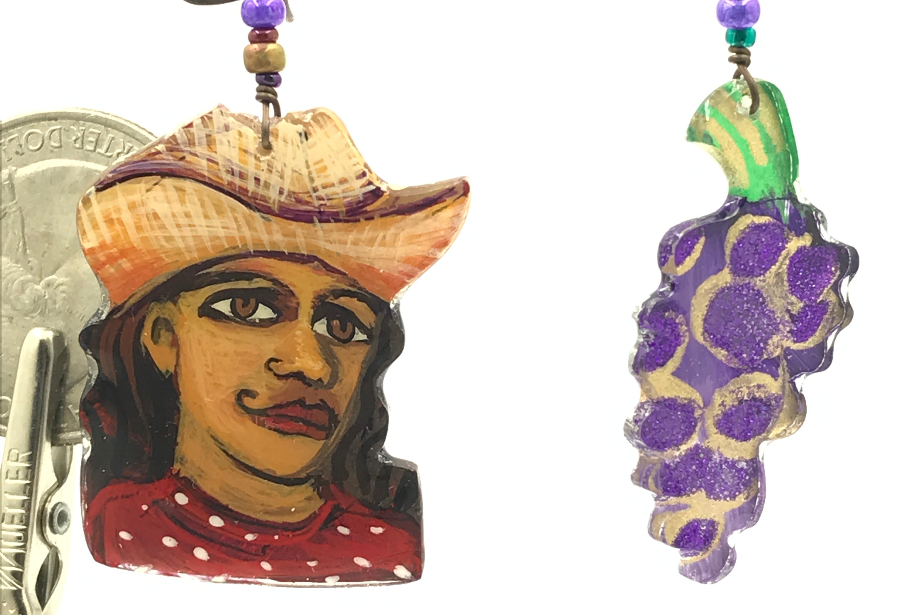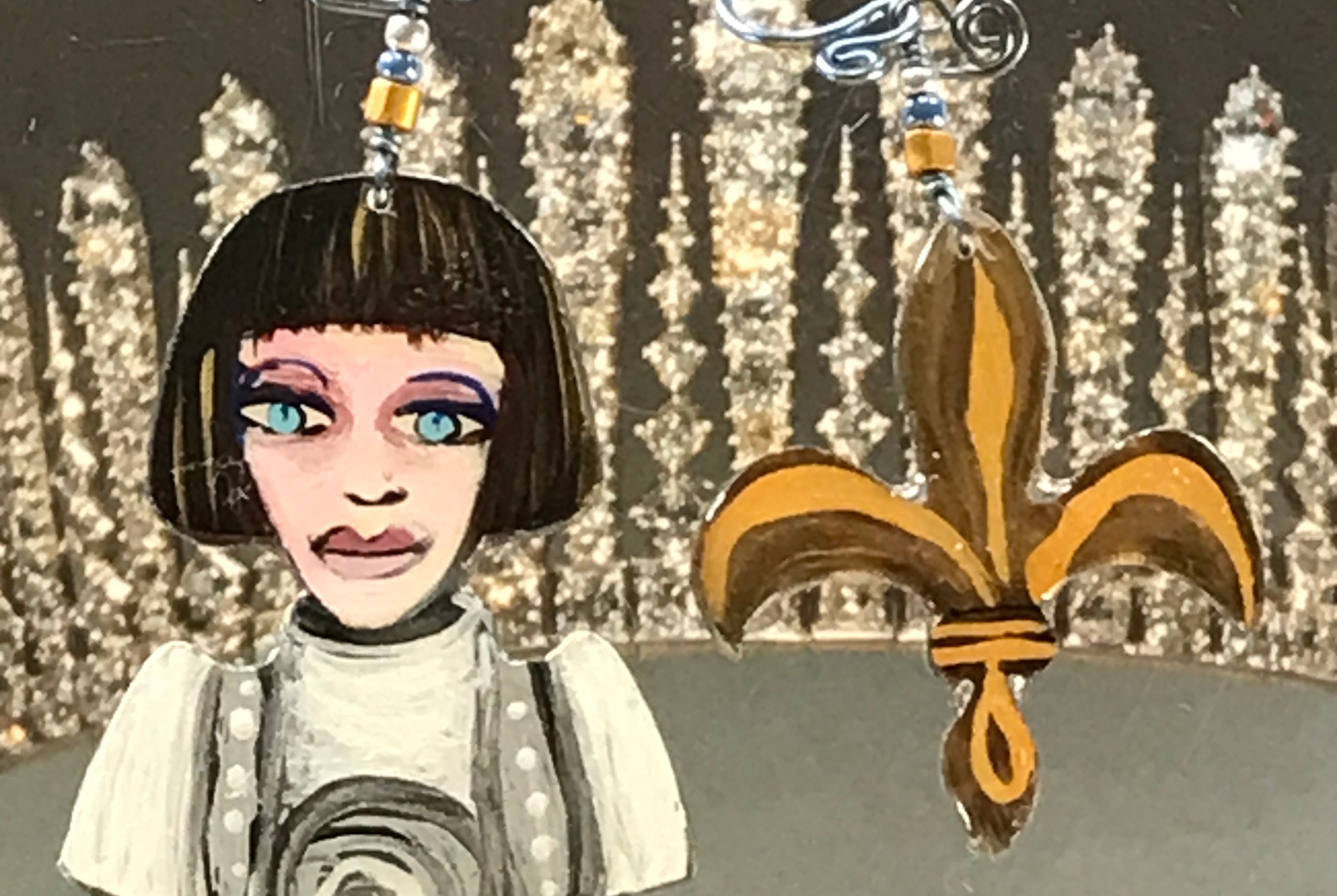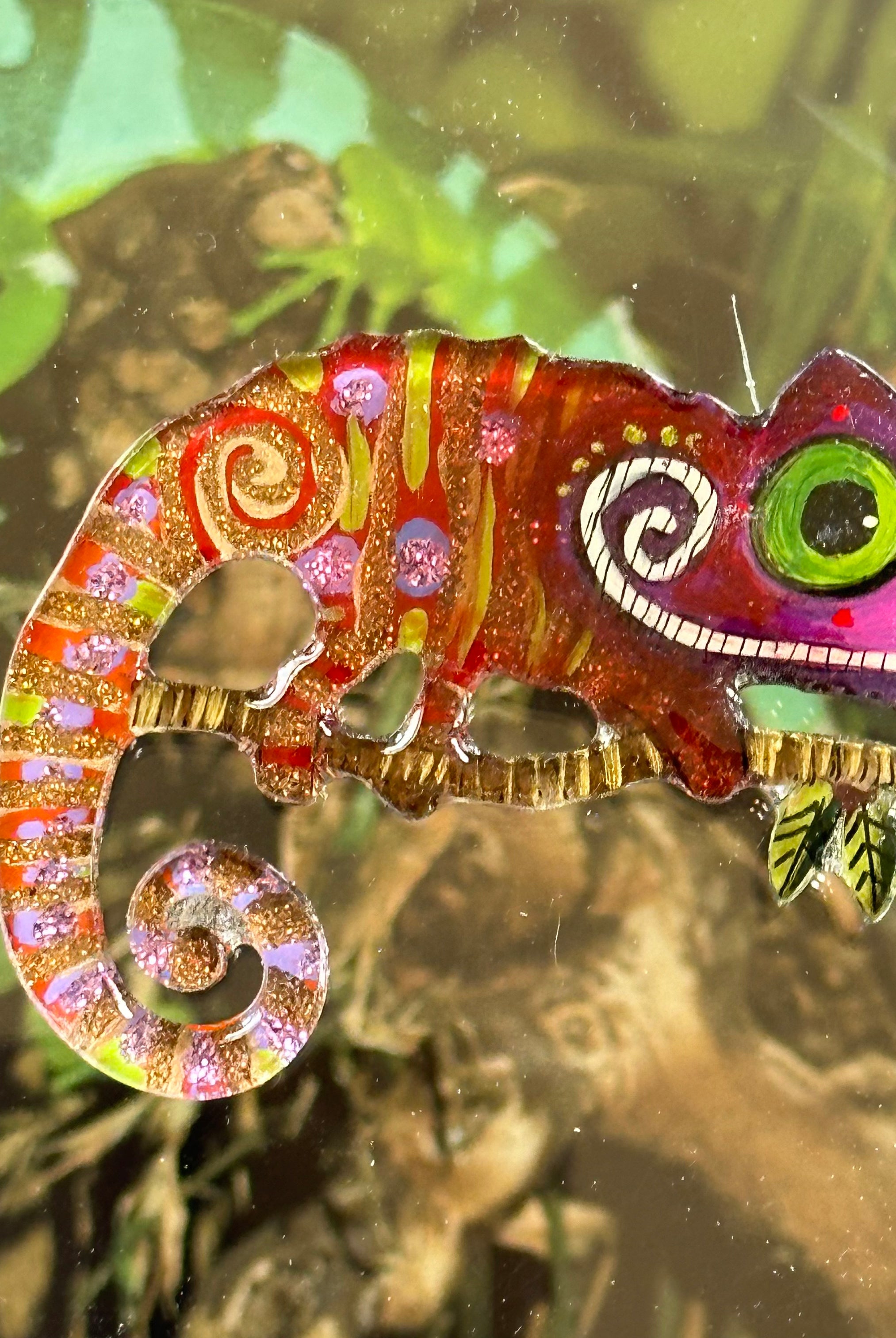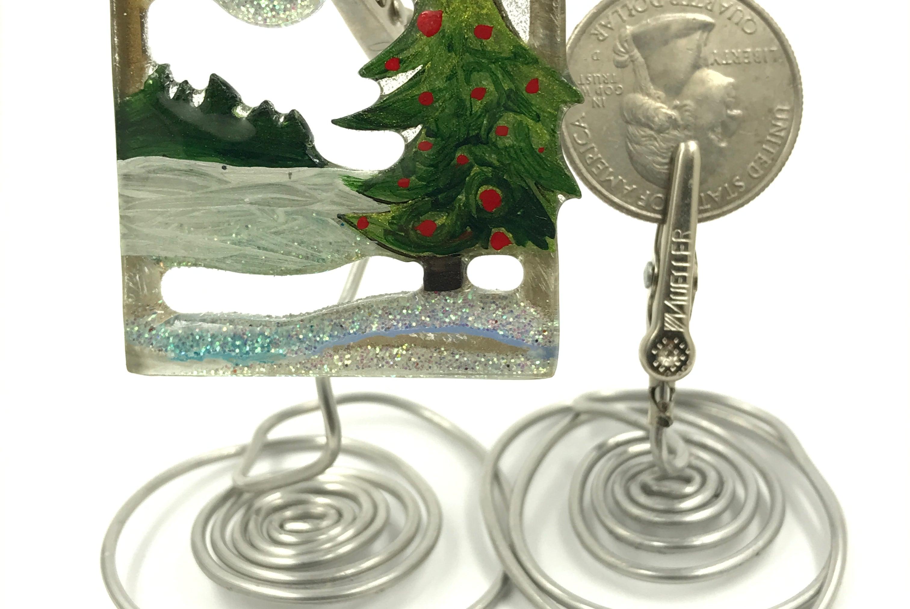 For me, these are little paintings that you can wear. If you are thinking of shrinky-dinks, I'm sure that was in my mind when I came up with lasercutting the shapes and then painting with the same paints I use on canvas. It's a multi layered process that takes a long time. The painting takes the longest, but it is the most rewarding. They are coated with a thick and sturdy glaze that brings out the depth and color.