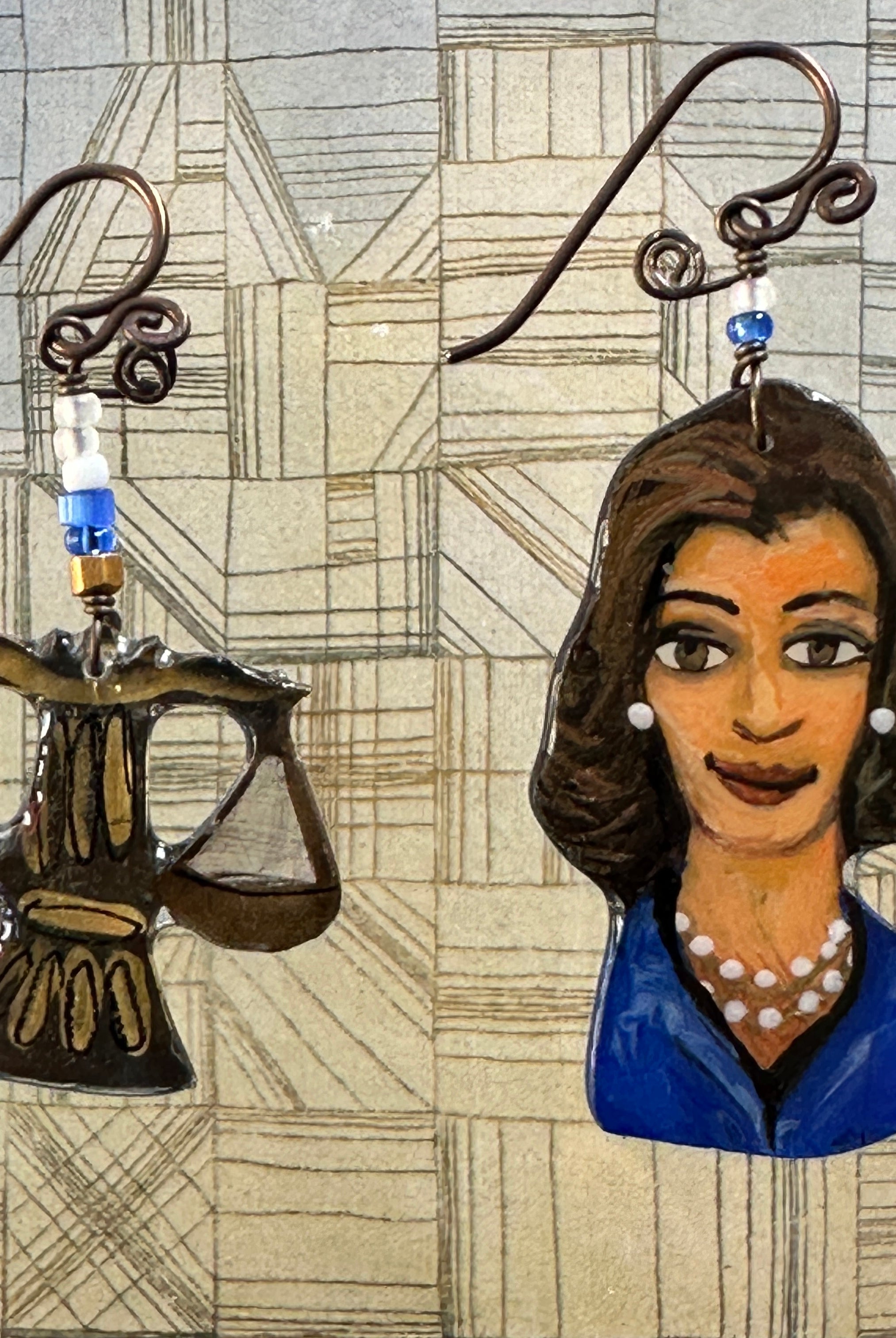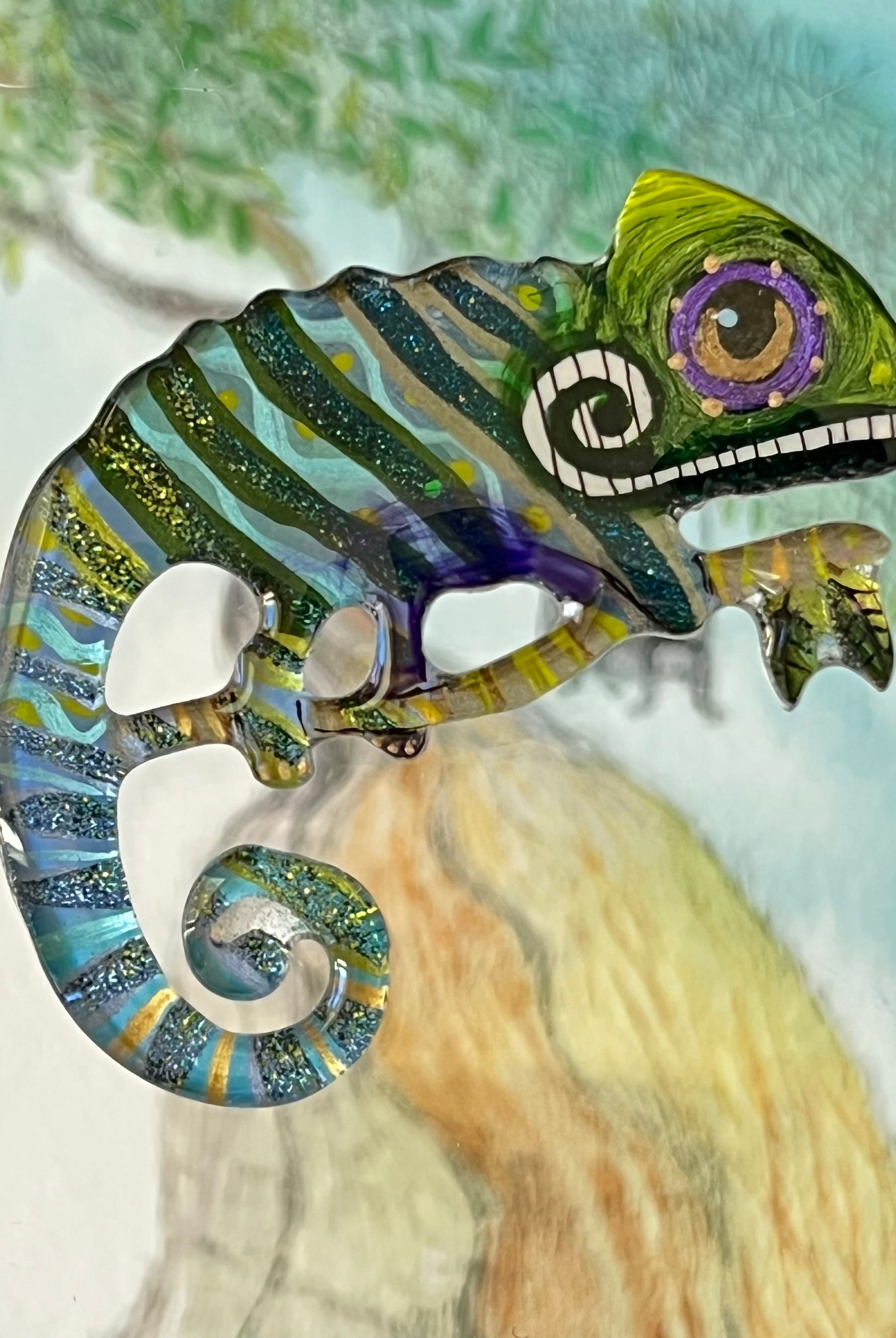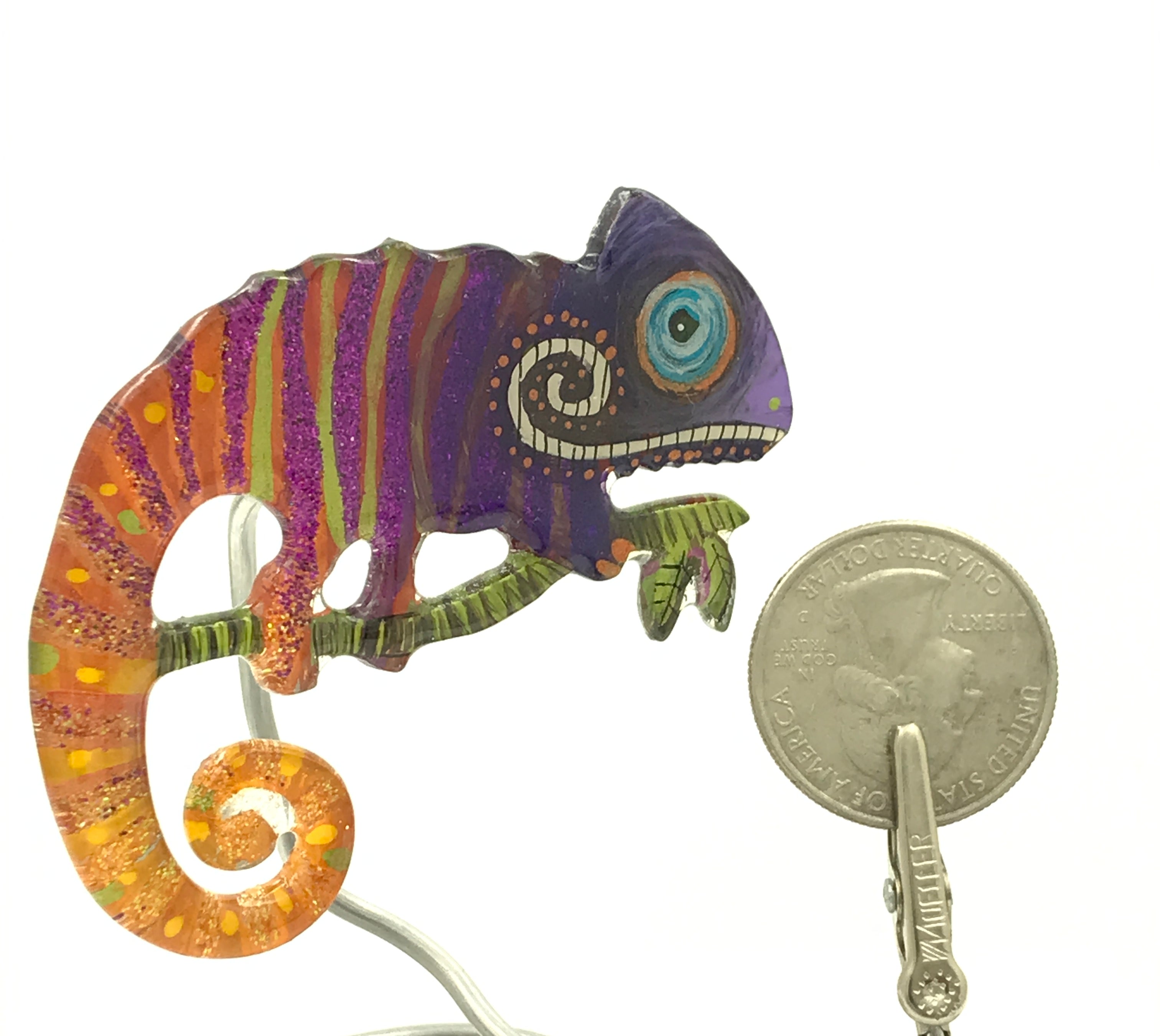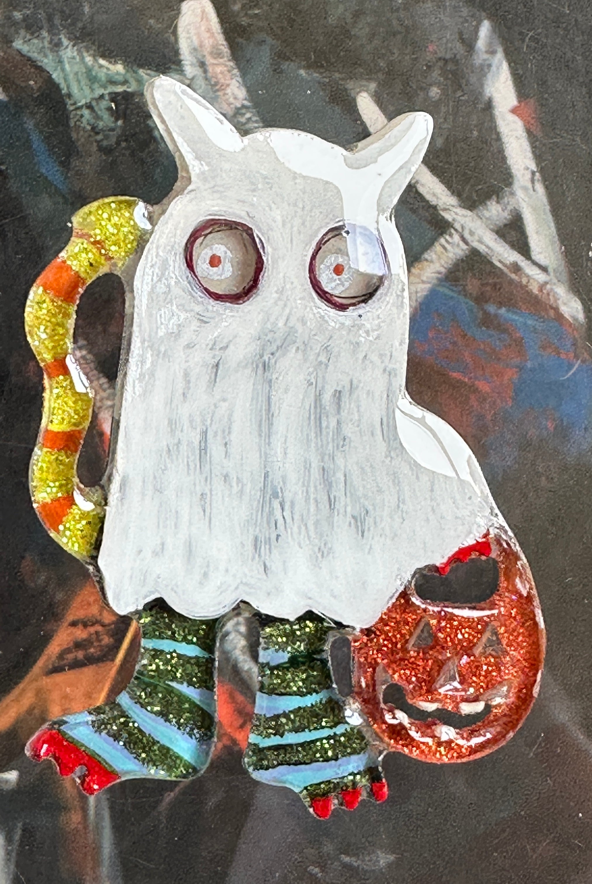 For me, these are little paintings that you can wear. If you are thinking of shrinky-dinks, I'm sure that was in my mind when I came up with lasercutting the shapes and then painting with the same paints I use on canvas. It's a multi layered process that takes a long time. The painting takes the longest, but it is the most rewarding. They are coated with a thick and sturdy glaze that brings out the depth and color.