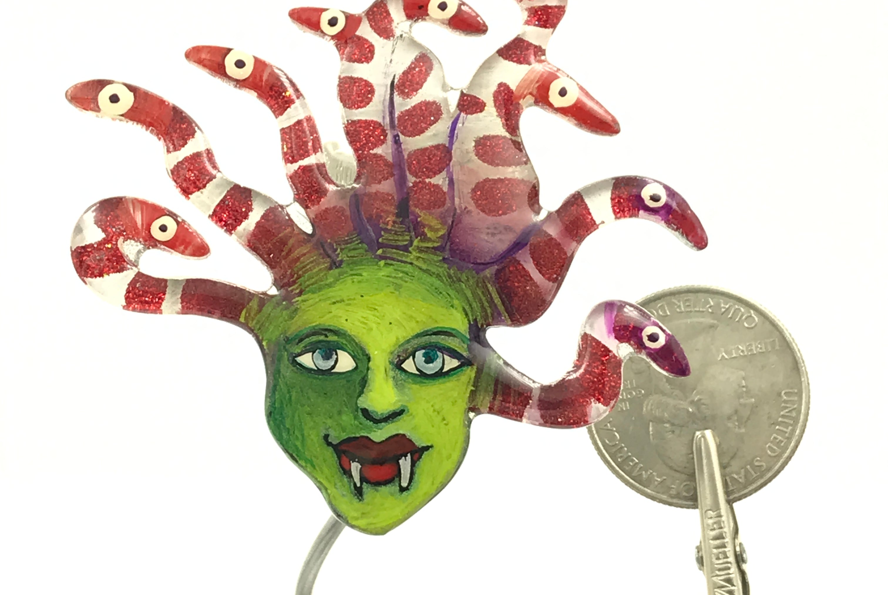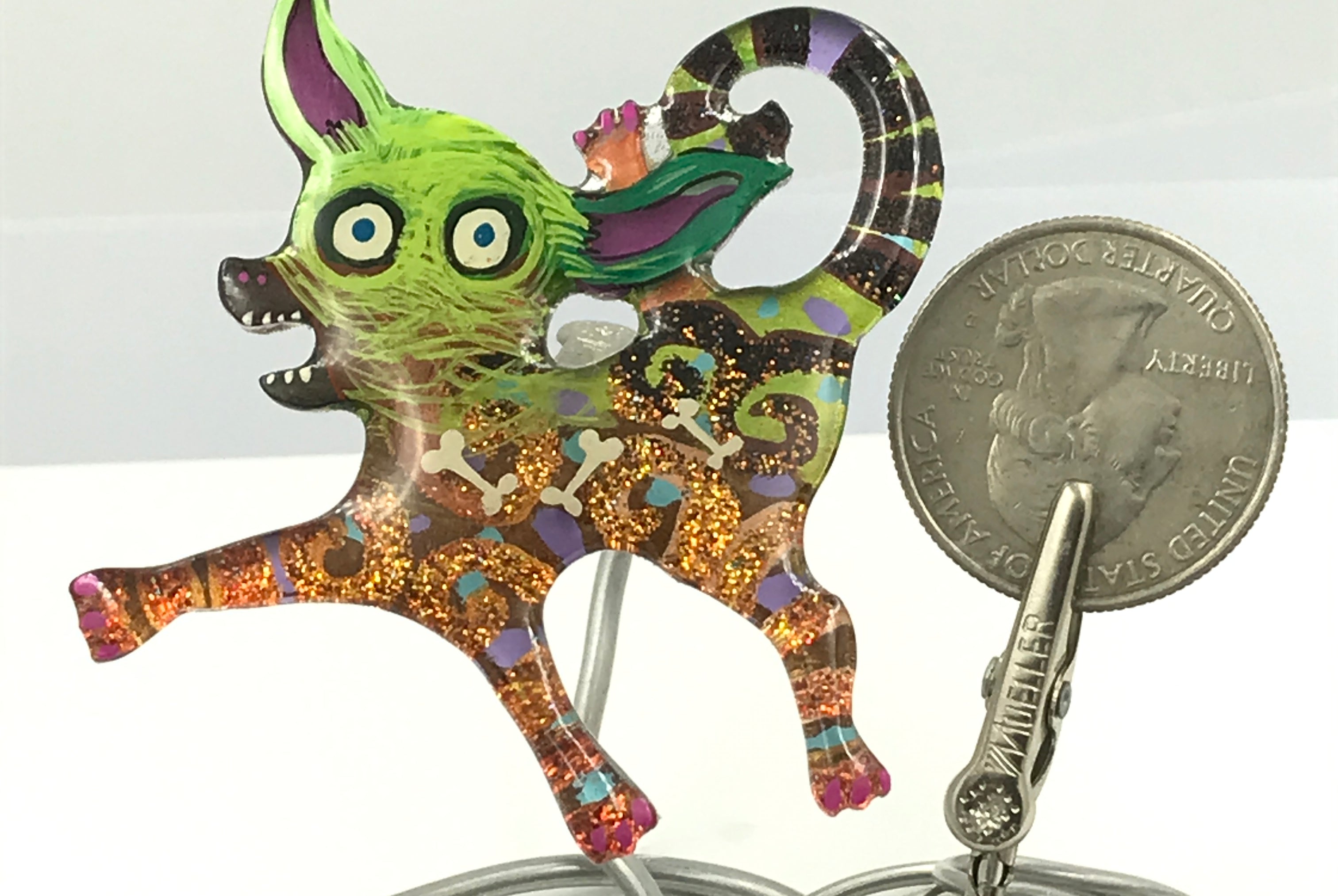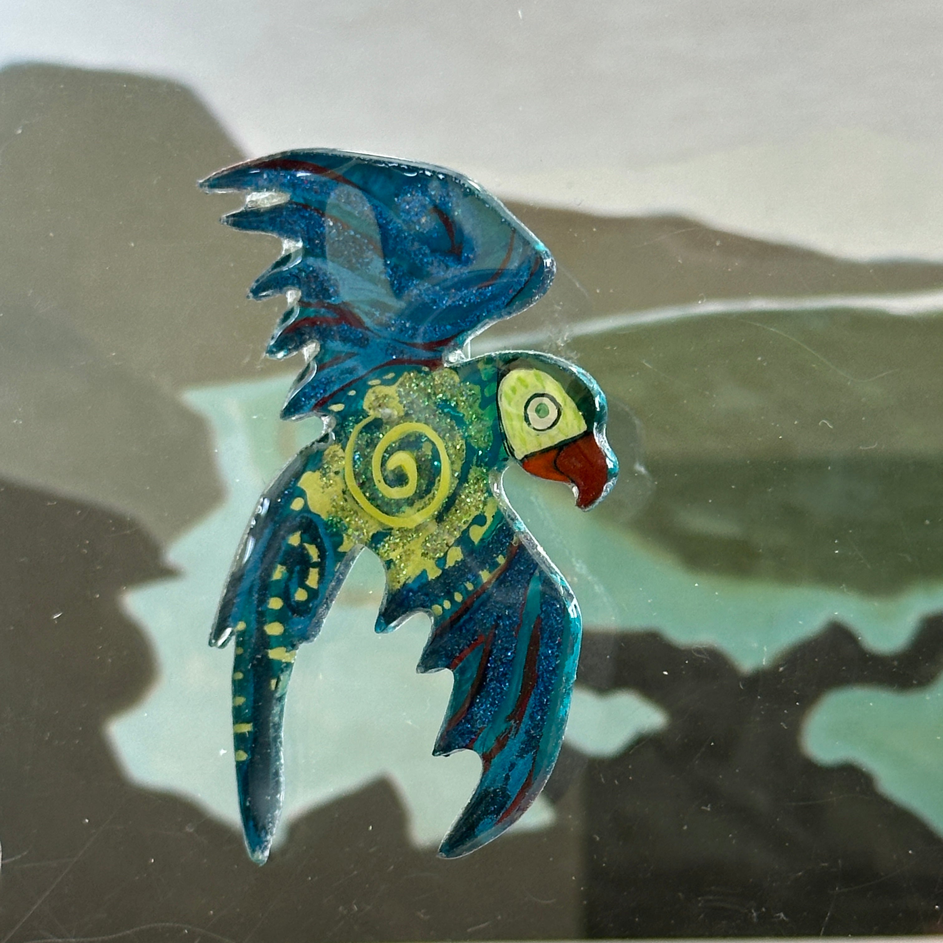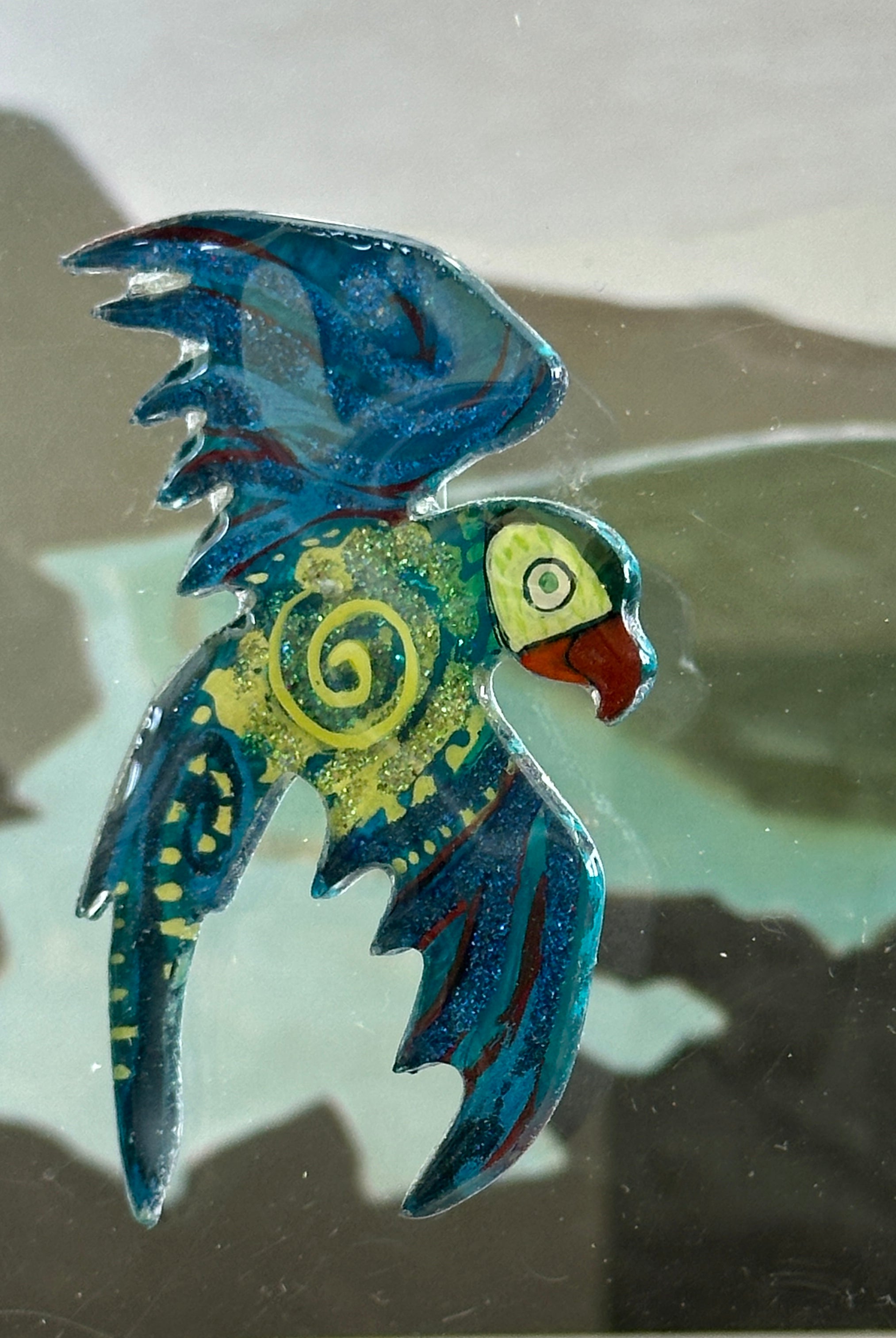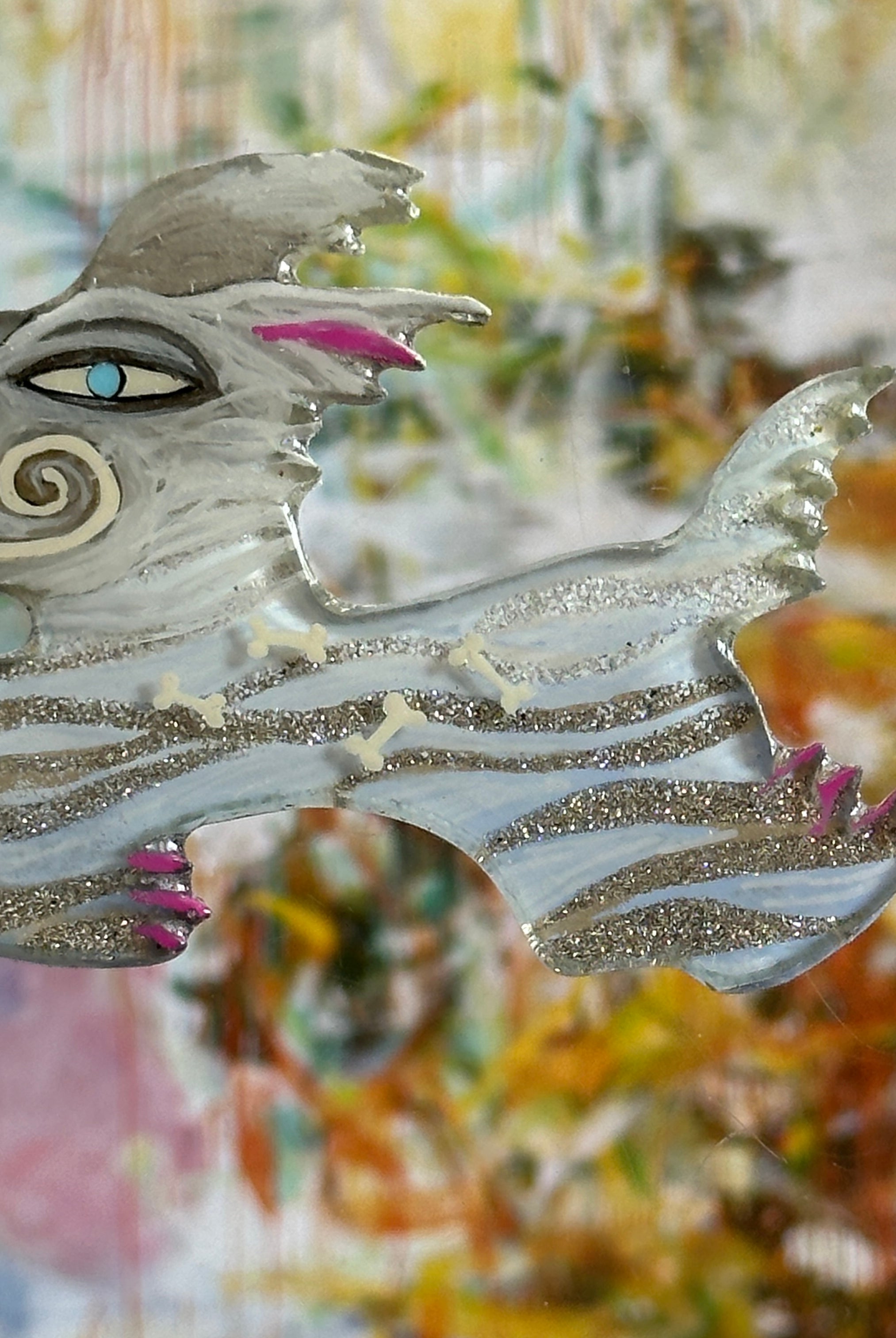 For me, these are little paintings that you can wear. If you are thinking of shrinky-dinks, I'm sure that was in my mind when I came up with lasercutting the shapes and then painting with the same paints I use on canvas. It's a multi layered process that takes a long time. The painting takes the longest, but it is the most rewarding. They are coated with a thick and sturdy glaze that brings out the depth and color.