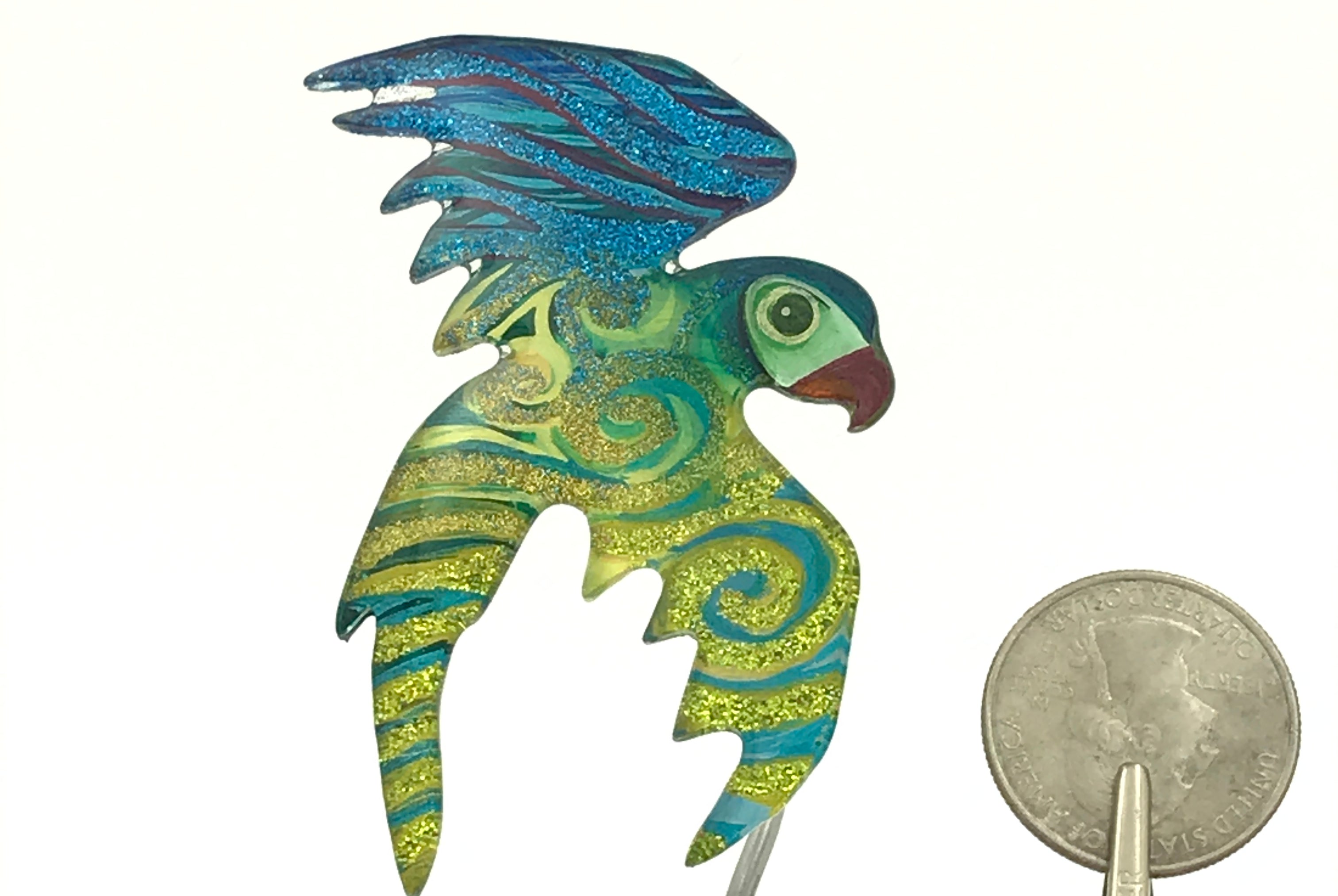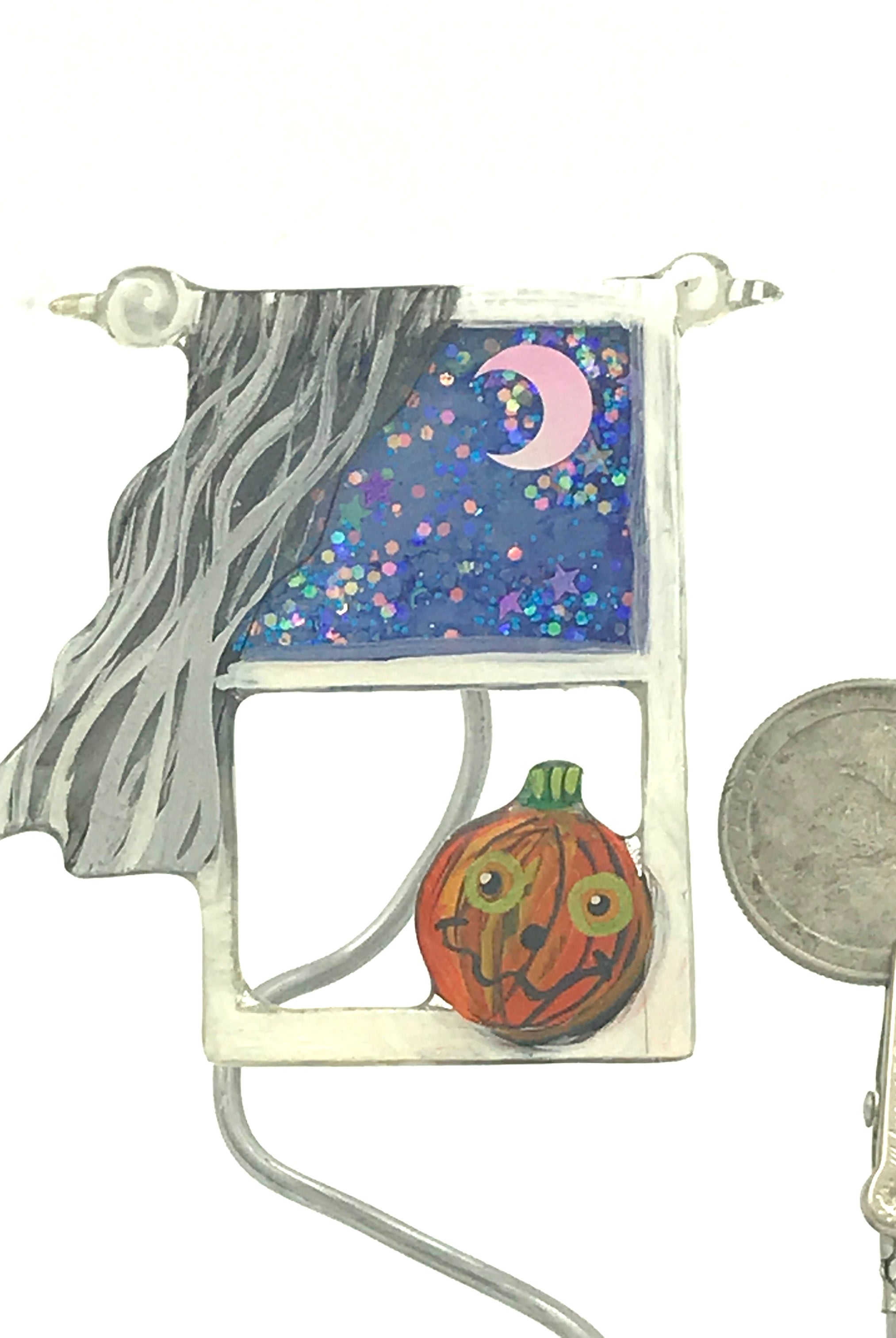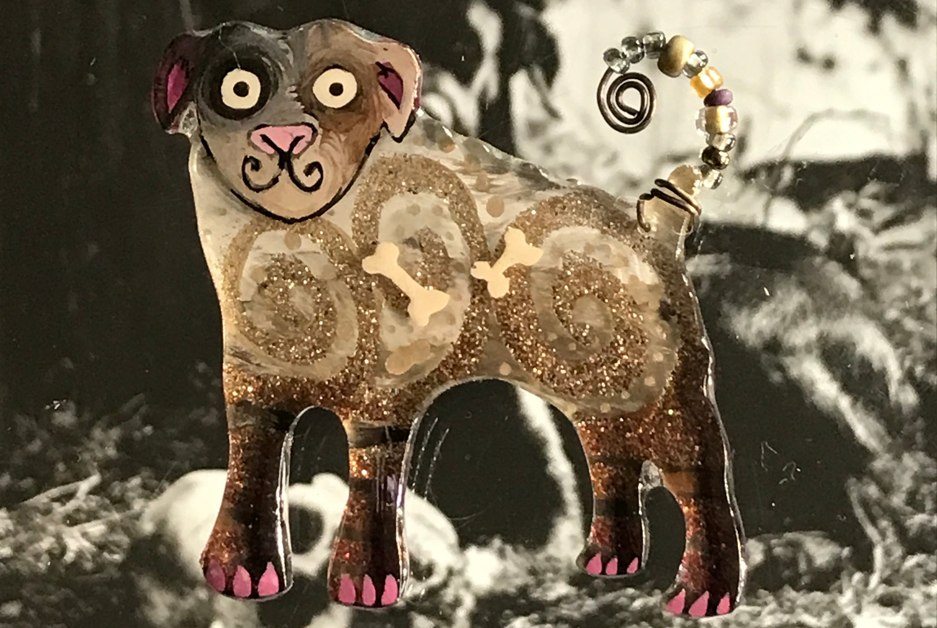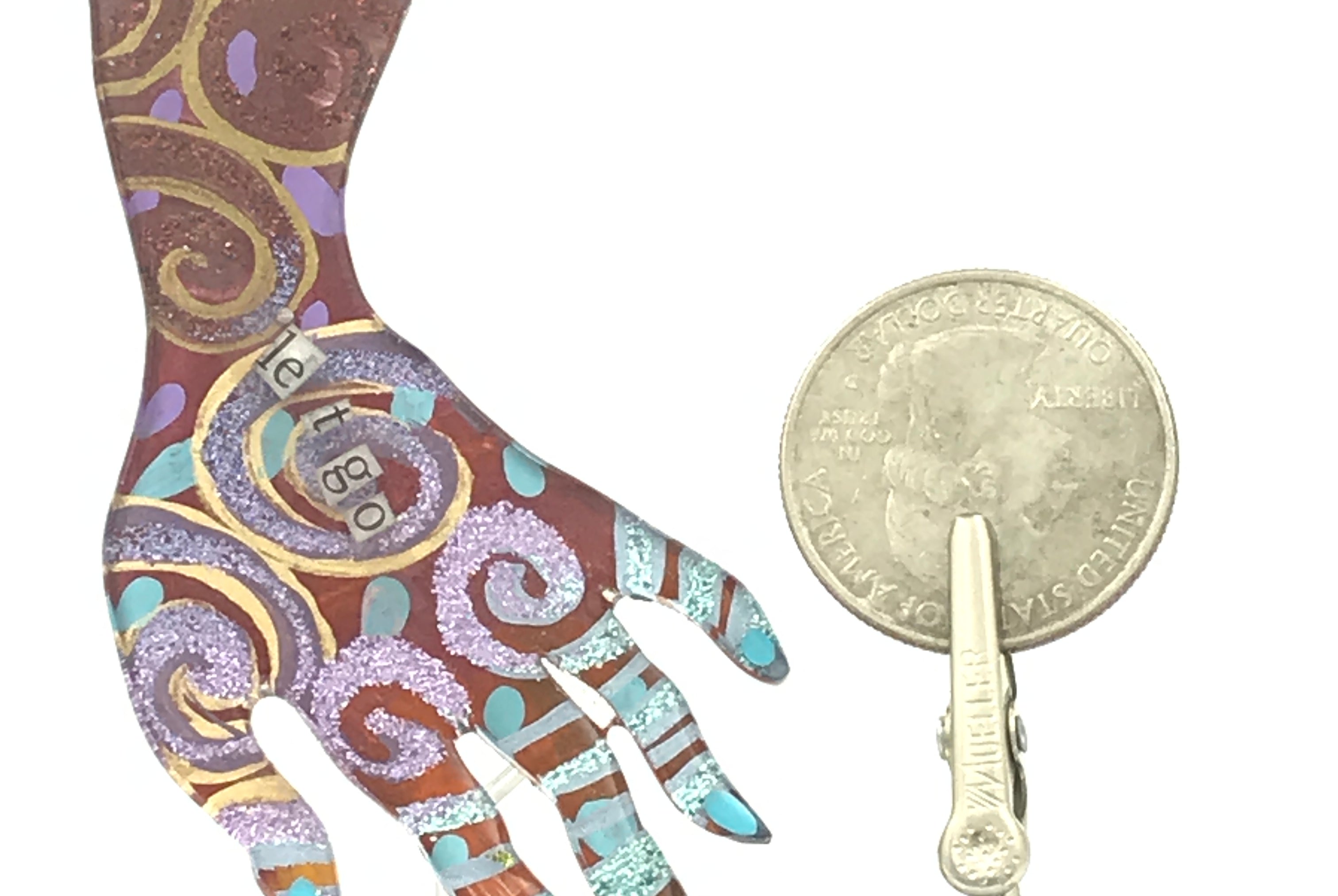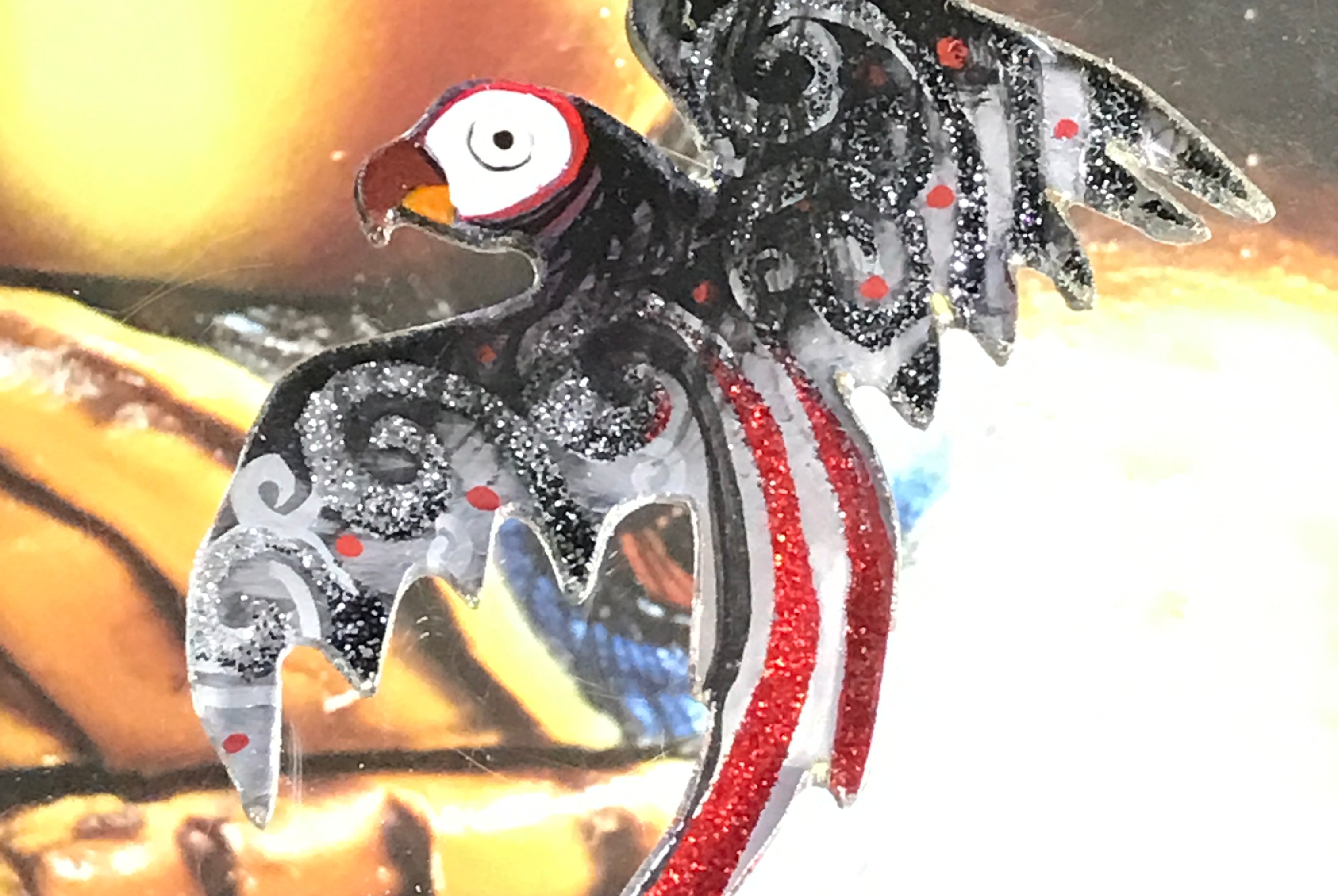 For me, these are little paintings that you can wear. If you are thinking of shrinky-dinks, I'm sure that was in my mind when I came up with lasercutting the shapes and then painting with the same paints I use on canvas. It's a multi layered process that takes a long time. The painting takes the longest, but it is the most rewarding. They are coated with a thick and sturdy glaze that brings out the depth and color.