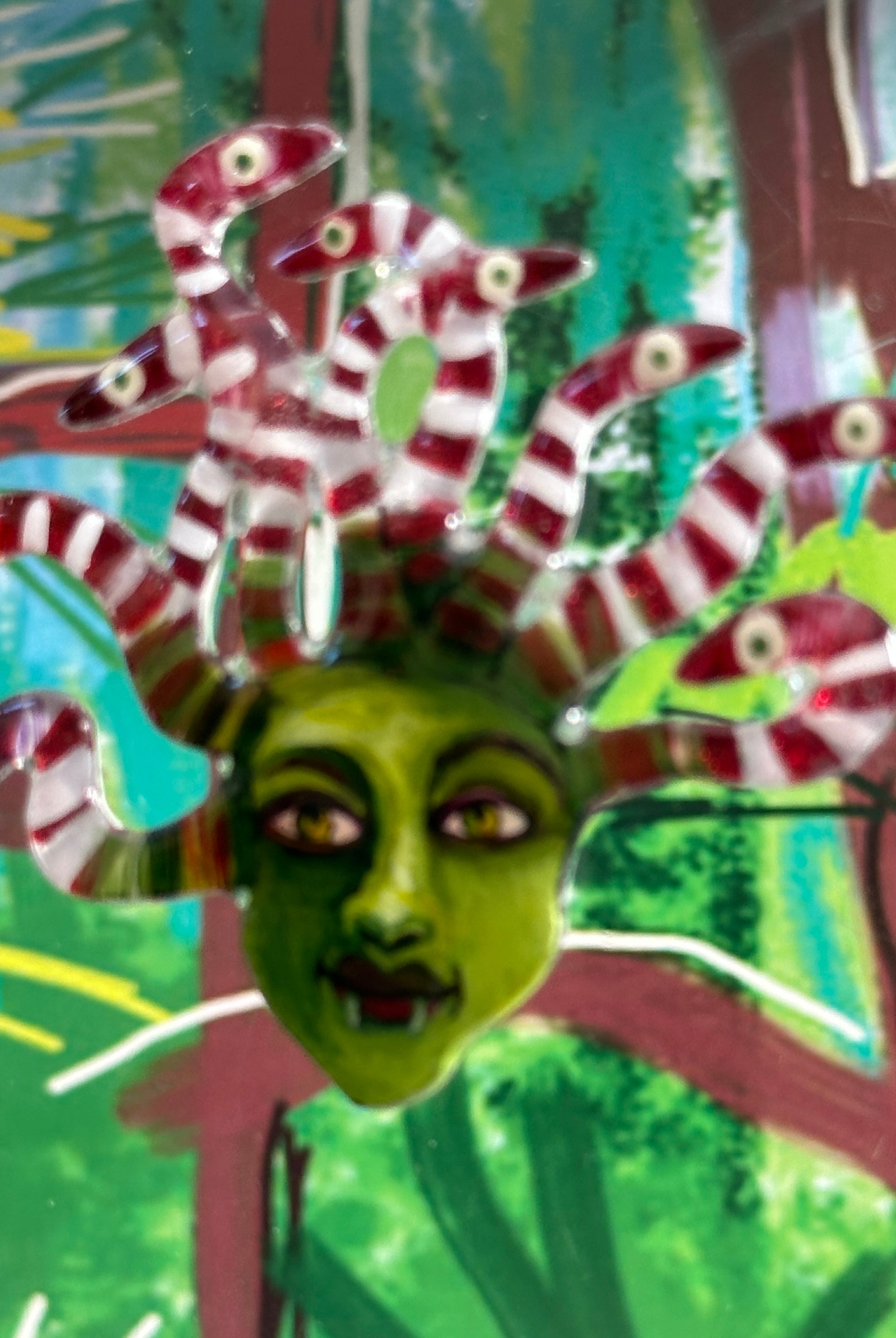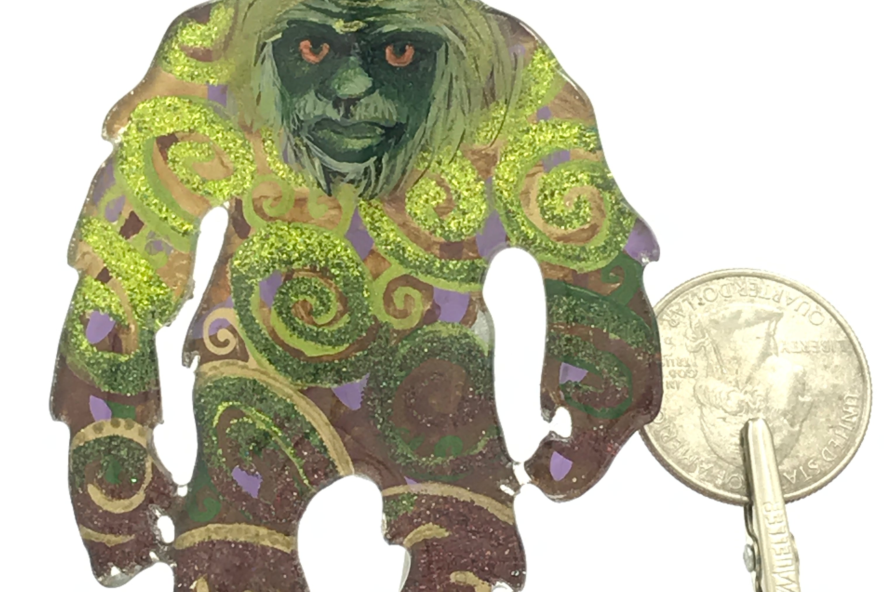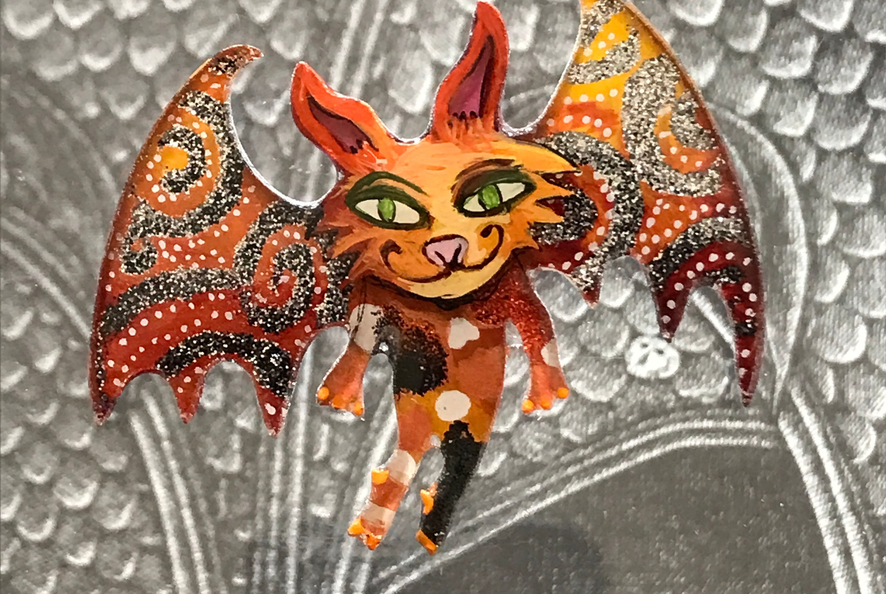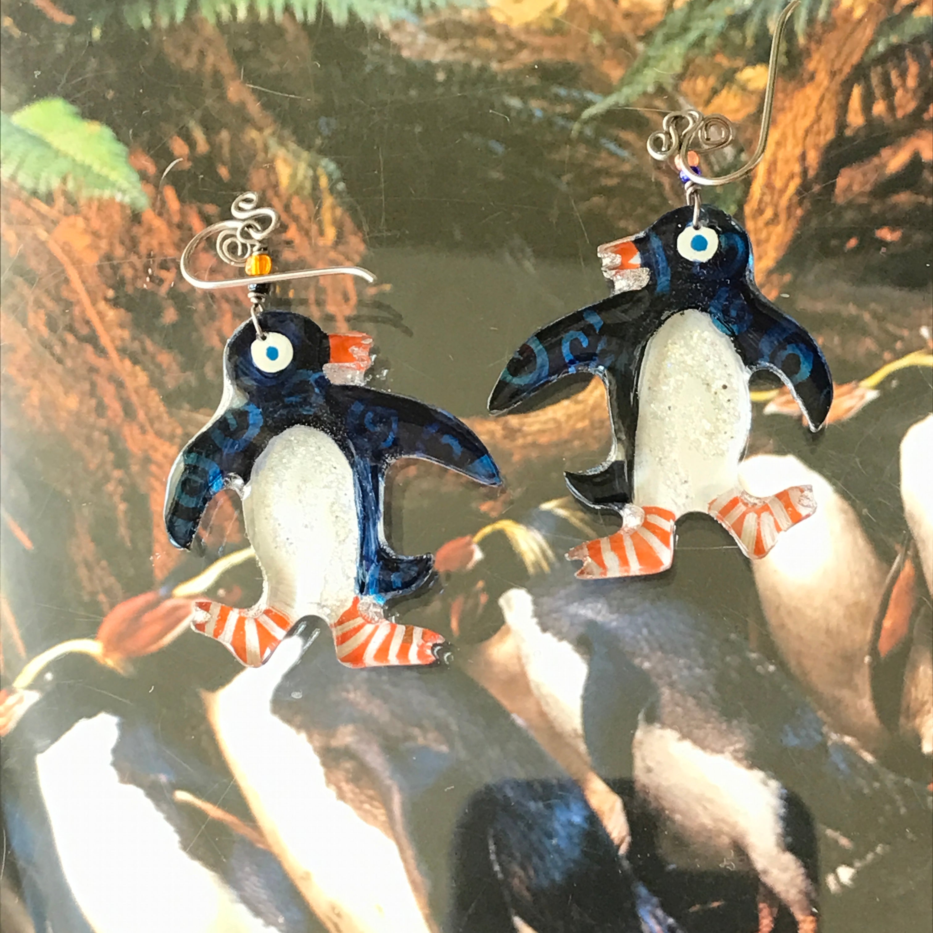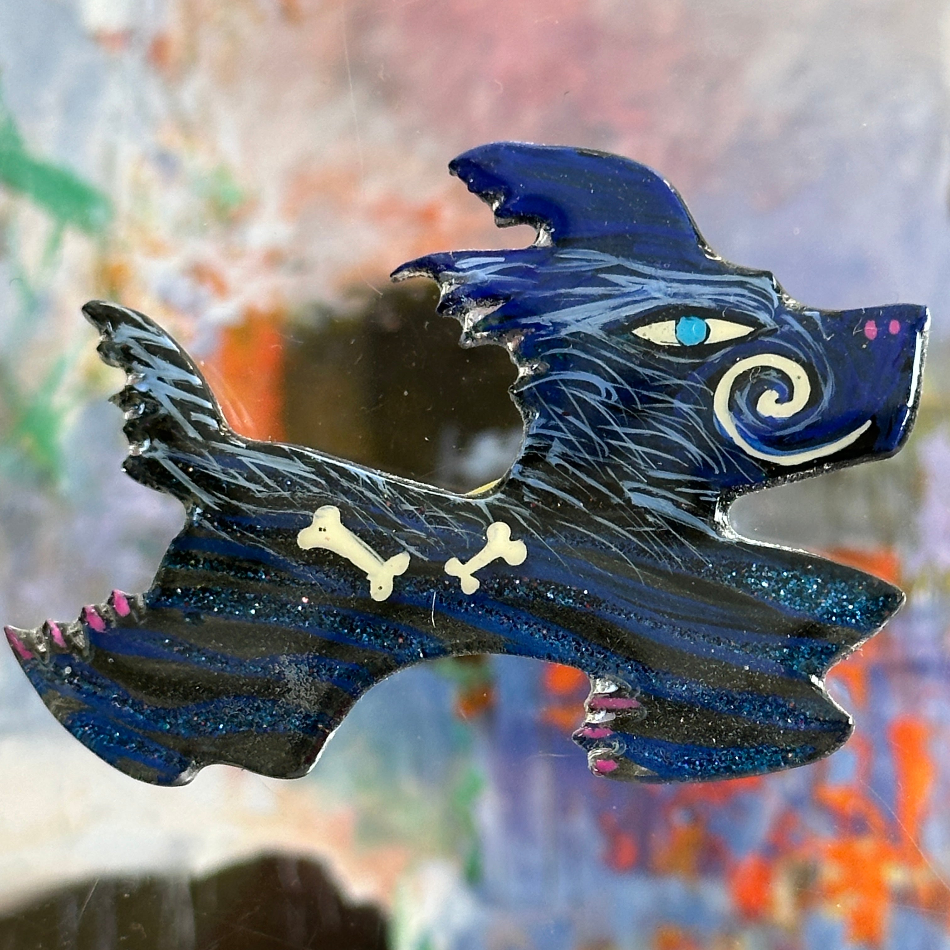For me, these are little paintings that you can wear. If you are thinking of shrinky-dinks, I'm sure that was in my mind when I came up with lasercutting the shapes and then painting with the same paints I use on canvas. It's a multi layered process that takes a long time. The painting takes the longest, but it is the most rewarding. They are coated with a thick and sturdy glaze that brings out the depth and color.