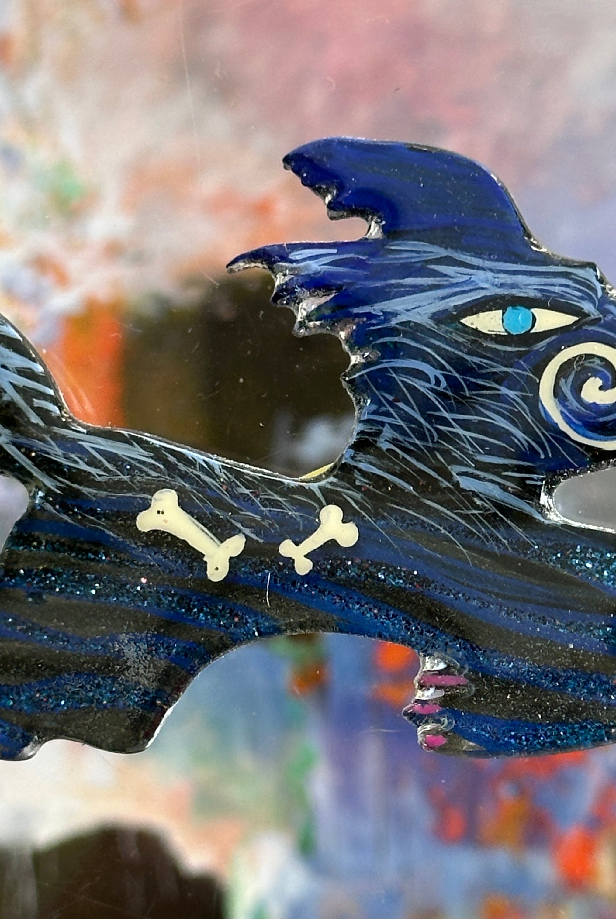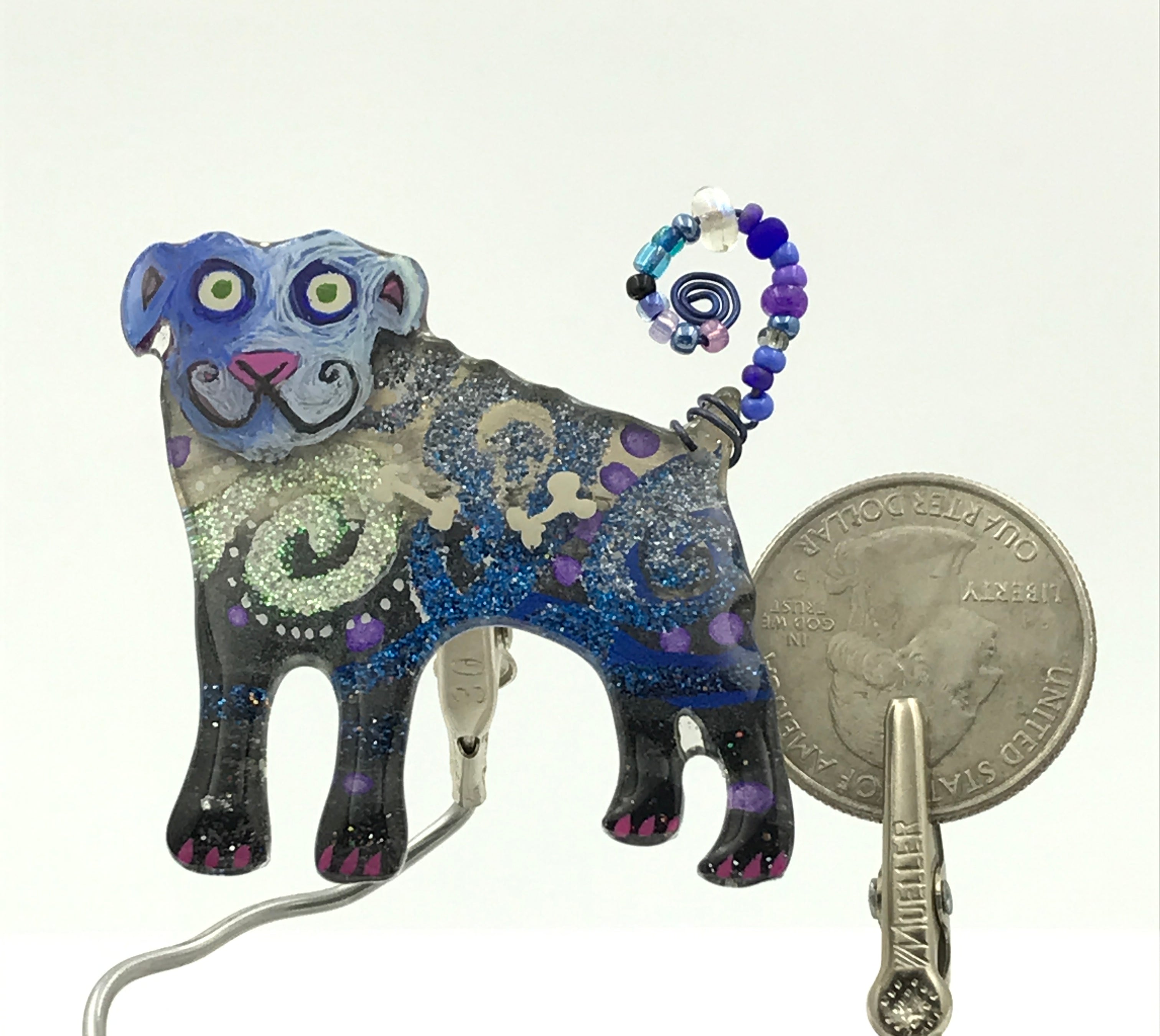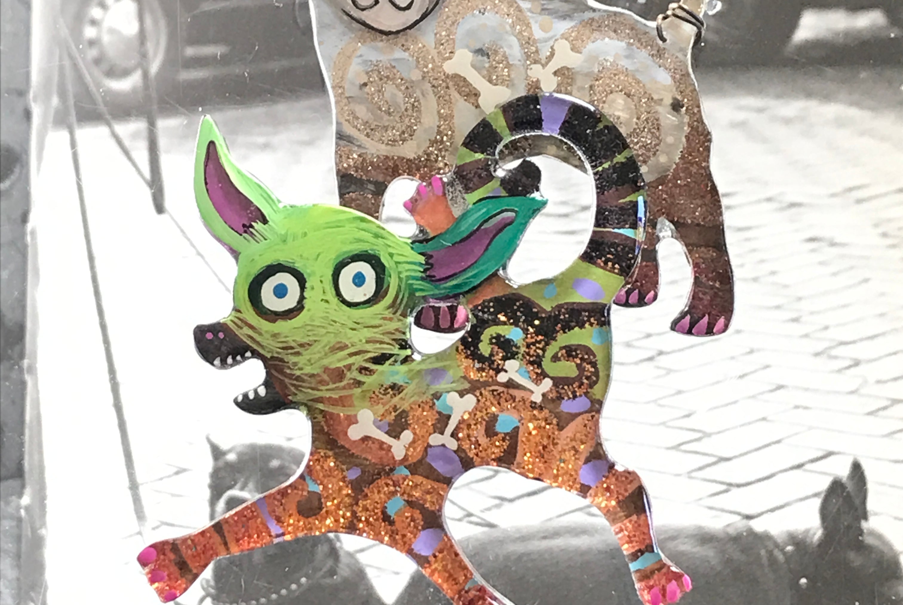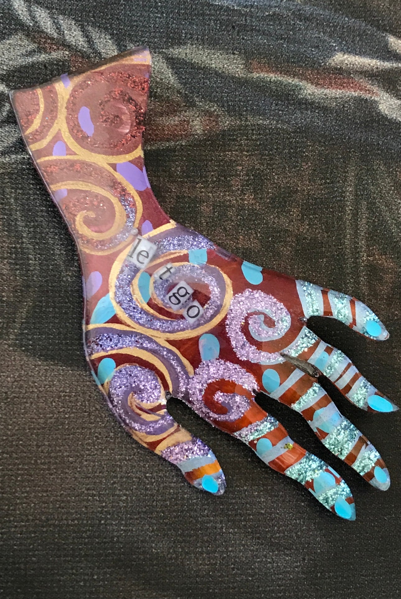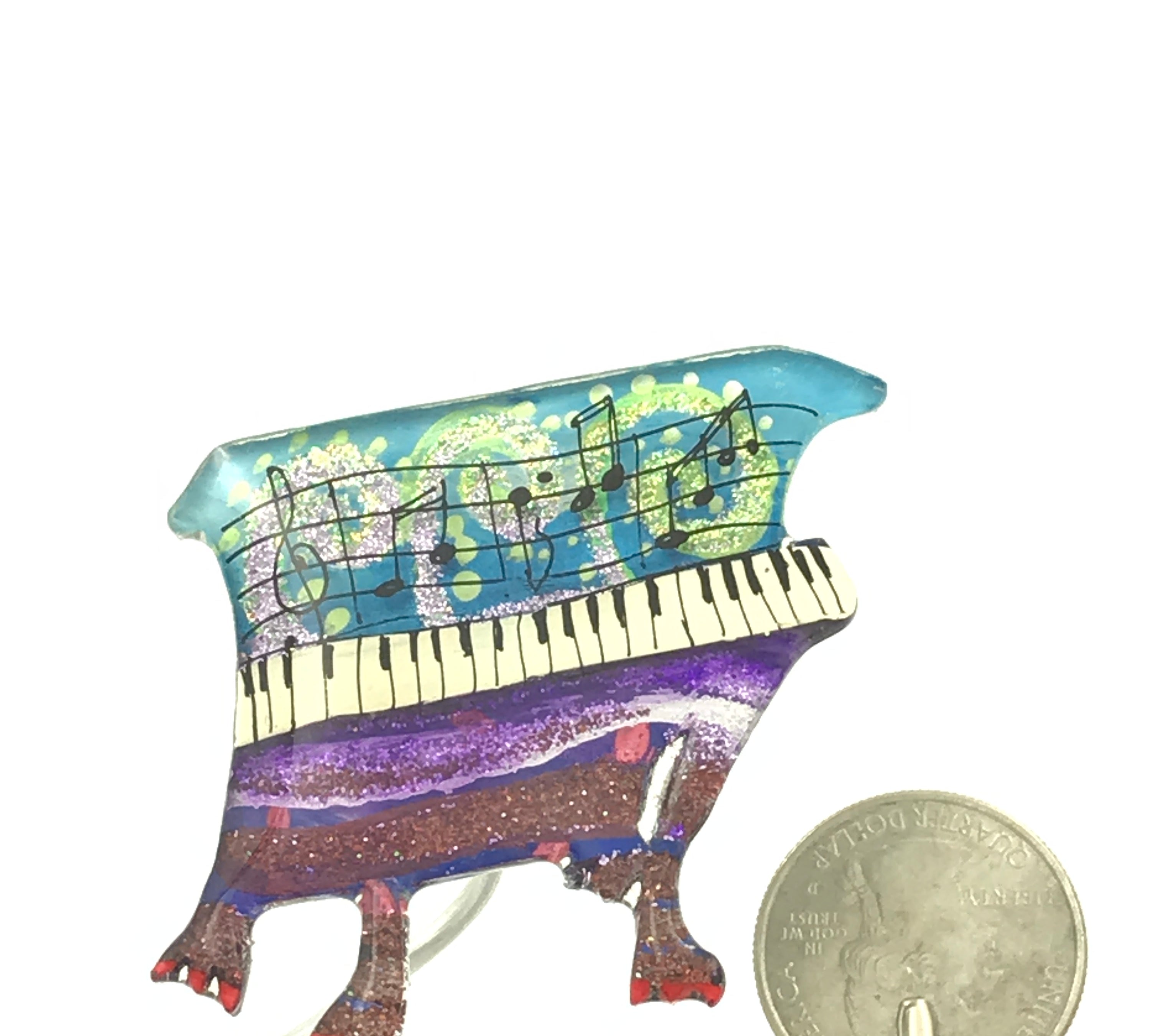 For me, these are little paintings that you can wear. If you are thinking of shrinky-dinks, I'm sure that was in my mind when I came up with lasercutting the shapes and then painting with the same paints I use on canvas. It's a multi layered process that takes a long time. The painting takes the longest, but it is the most rewarding. They are coated with a thick and sturdy glaze that brings out the depth and color.