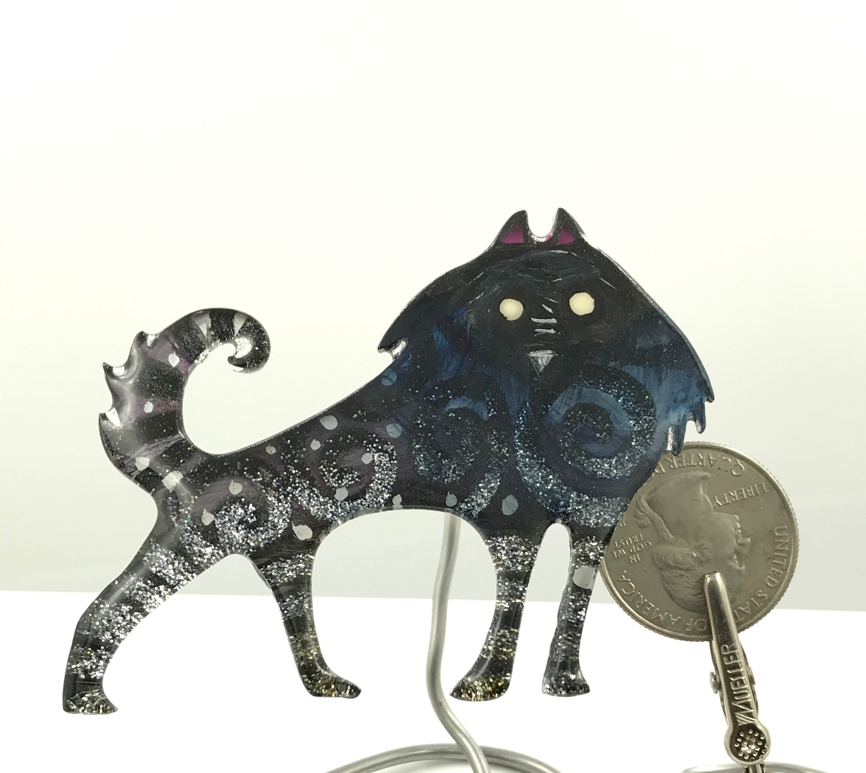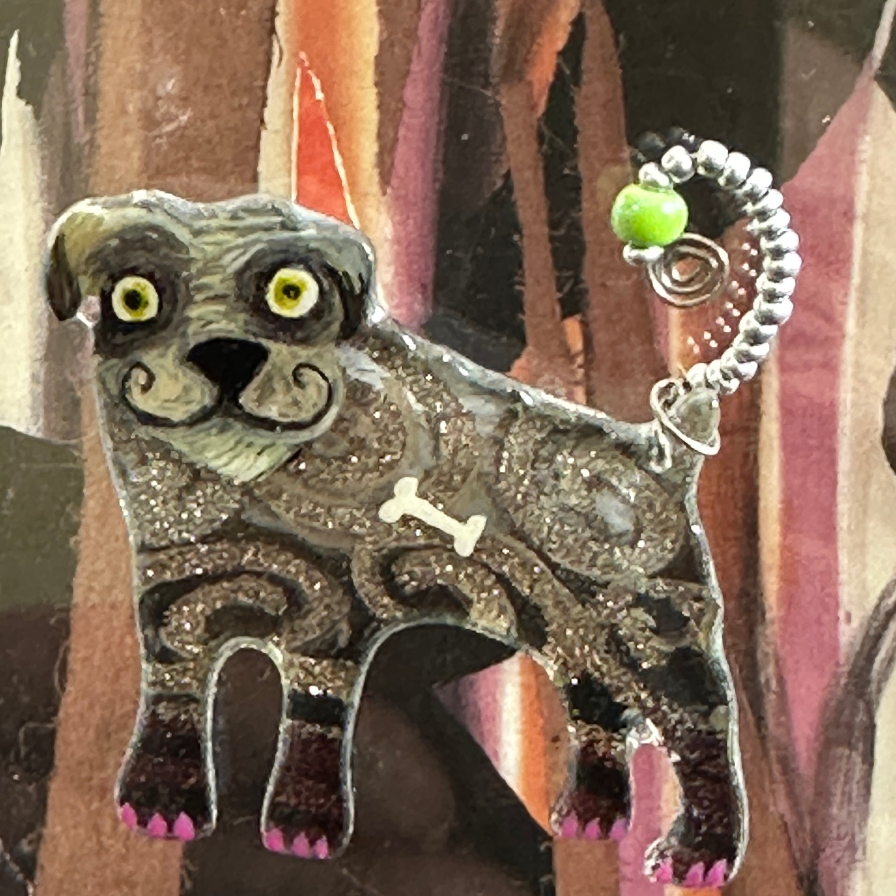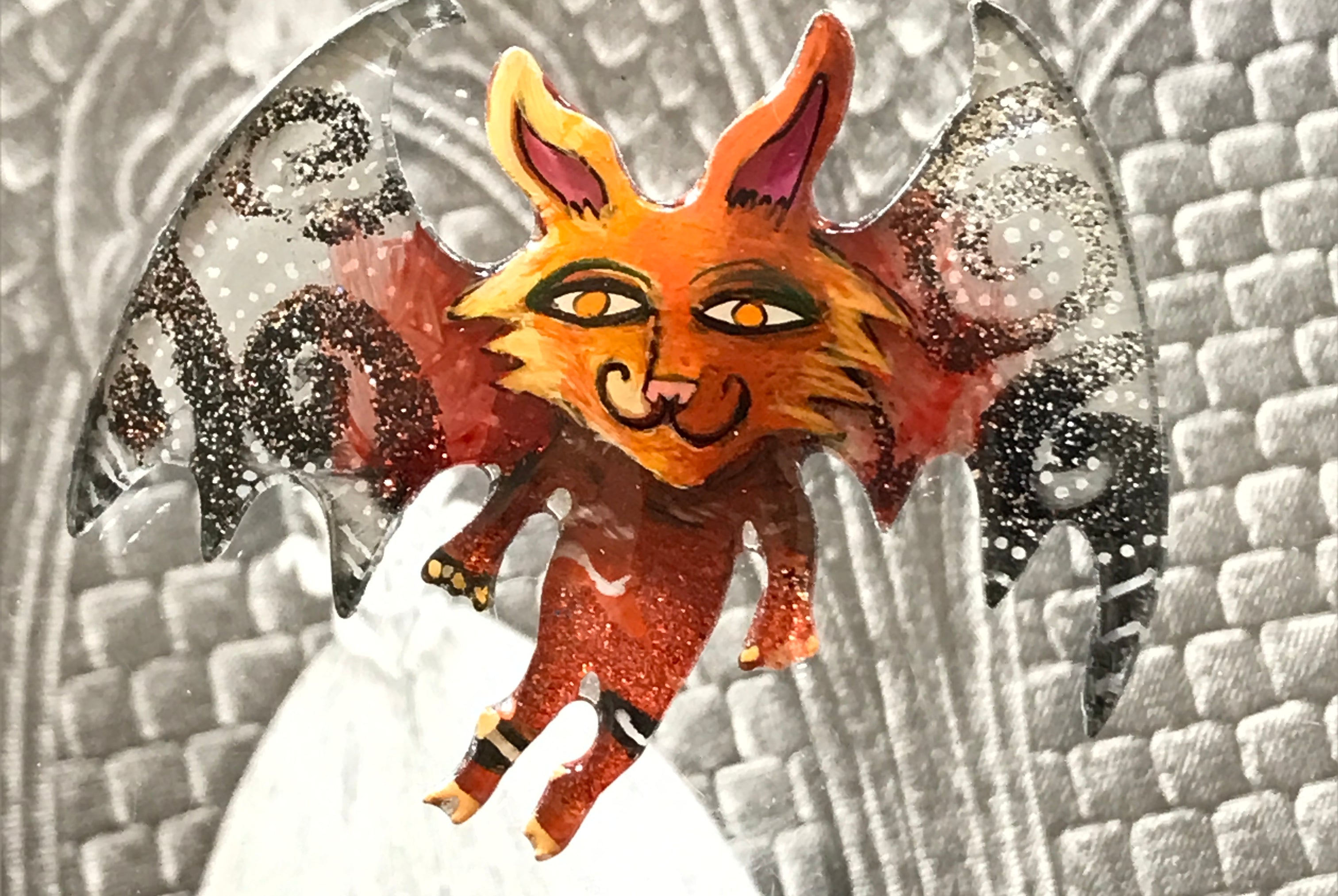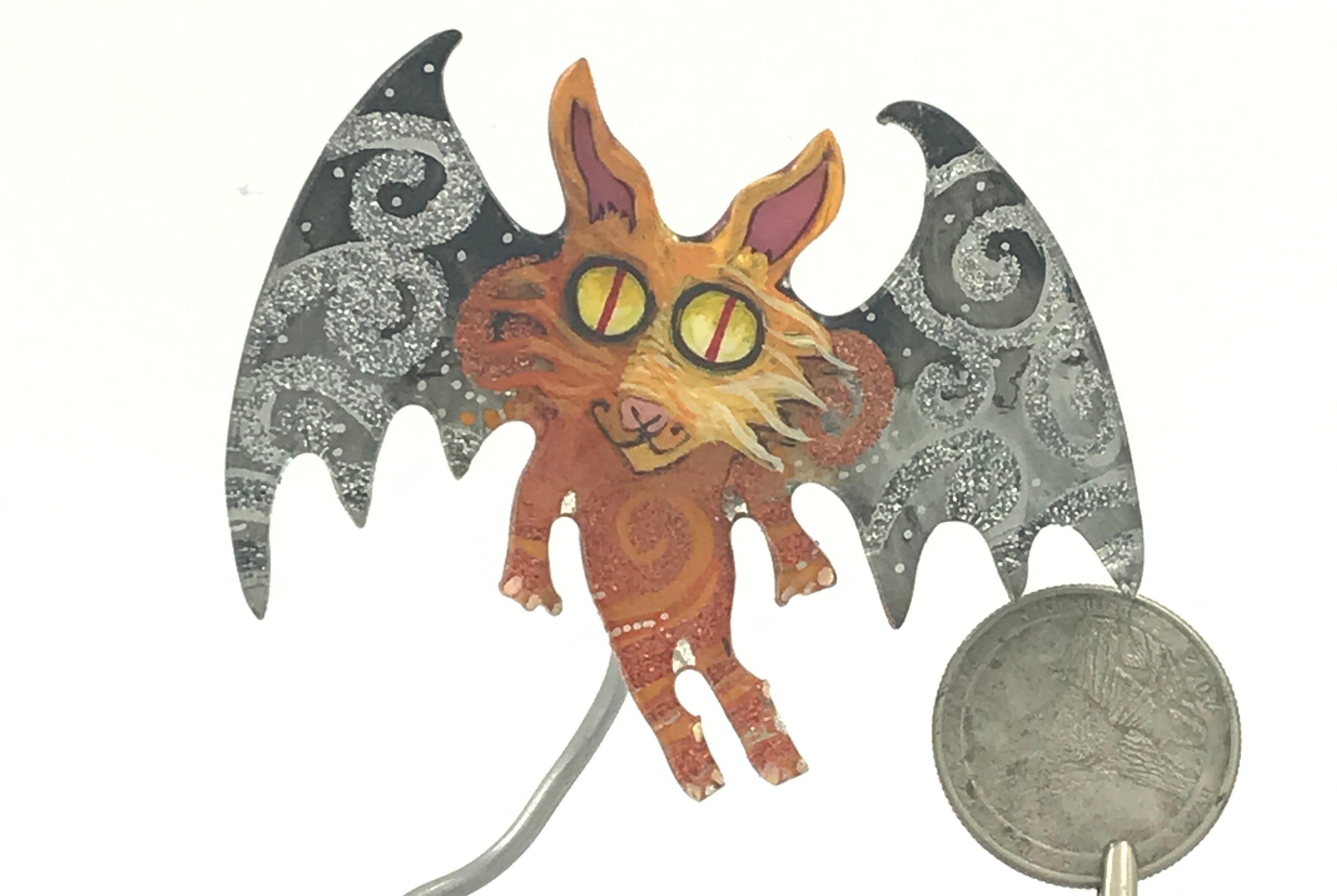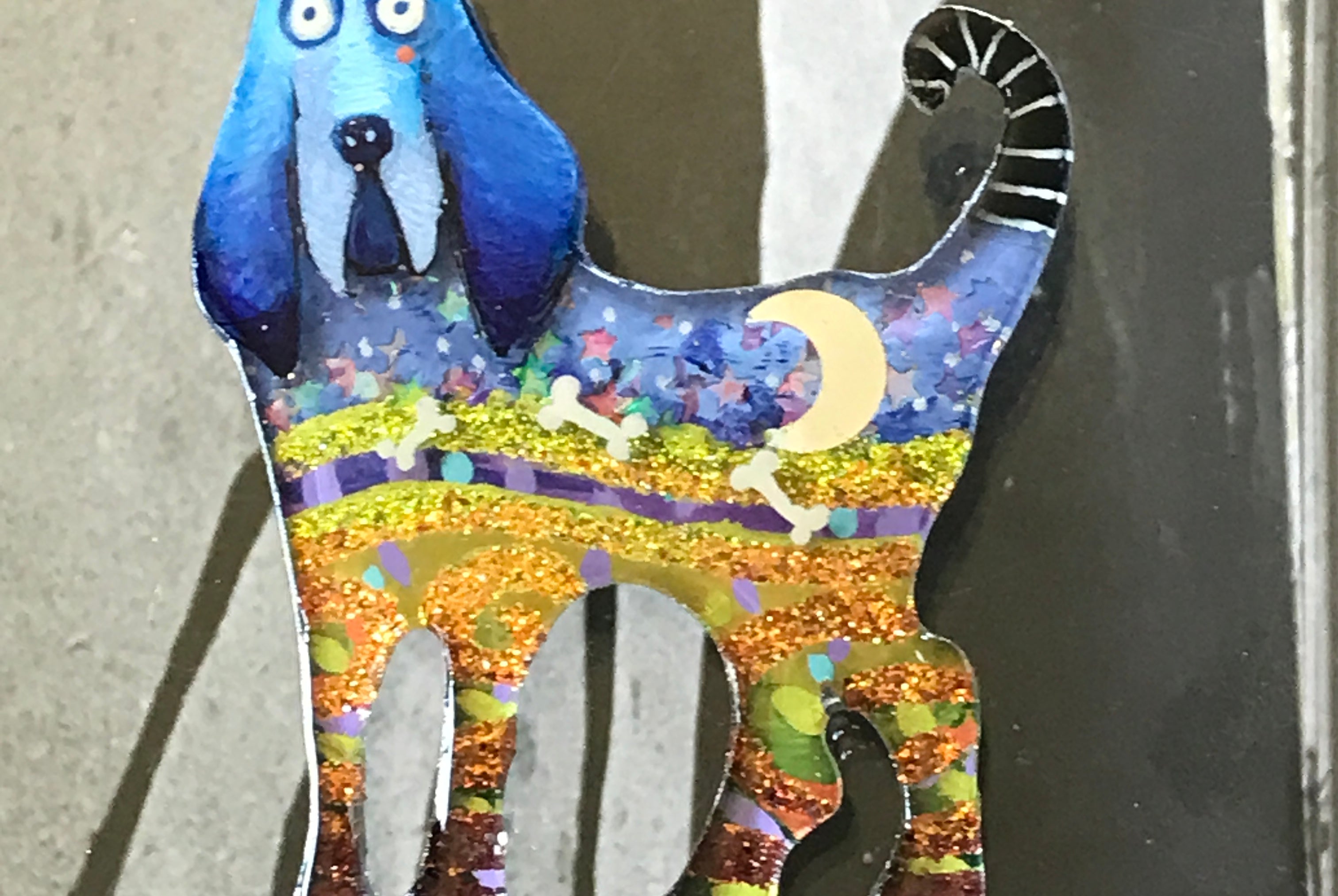 For me, these are little paintings that you can wear. If you are thinking of shrinky-dinks, I'm sure that was in my mind when I came up with lasercutting the shapes and then painting with the same paints I use on canvas. It's a multi layered process that takes a long time. The painting takes the longest, but it is the most rewarding. They are coated with a thick and sturdy glaze that brings out the depth and color.