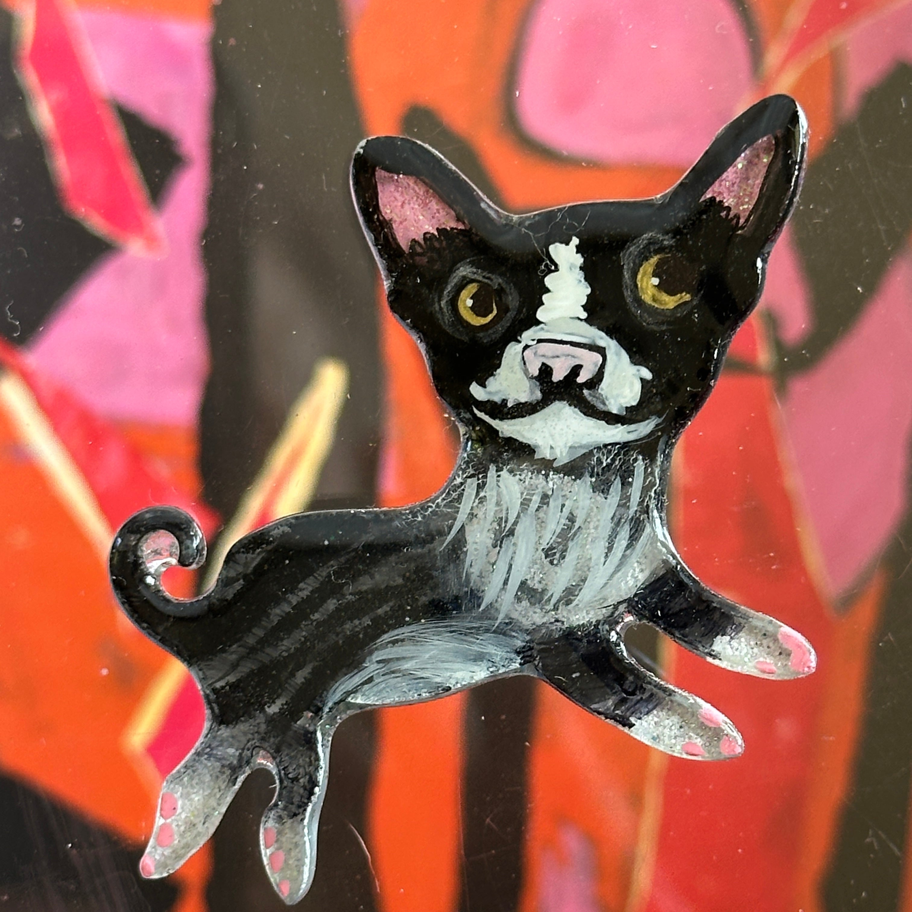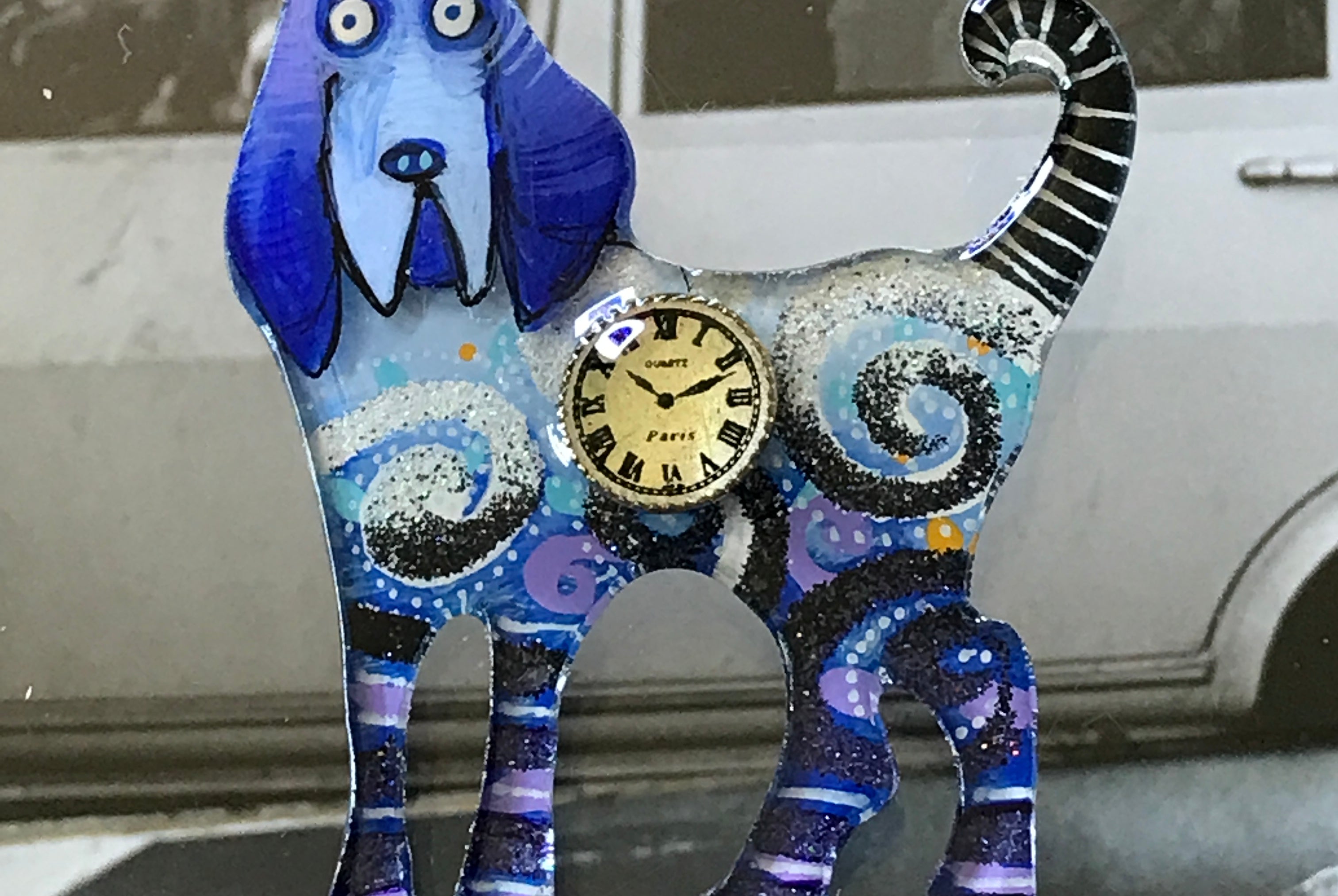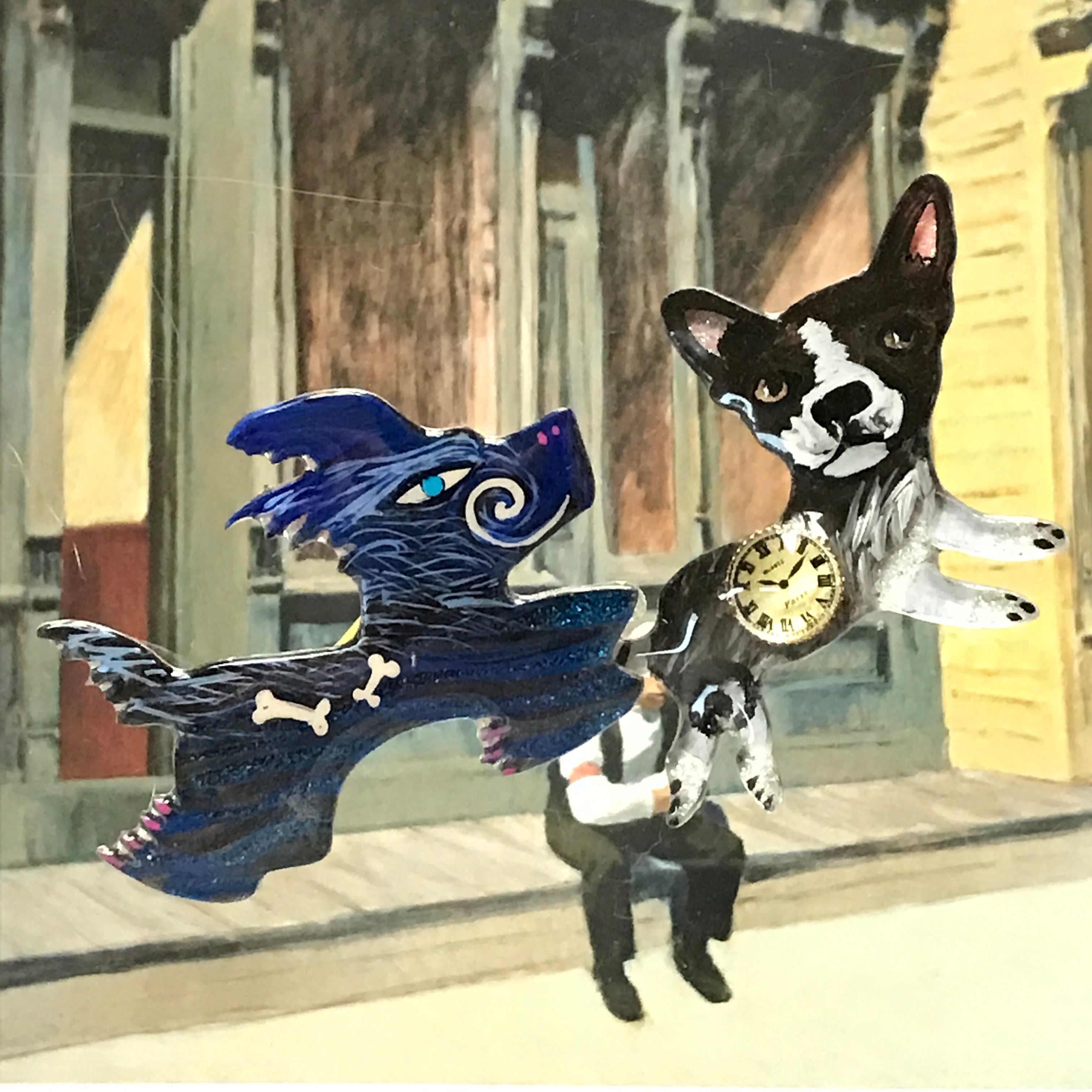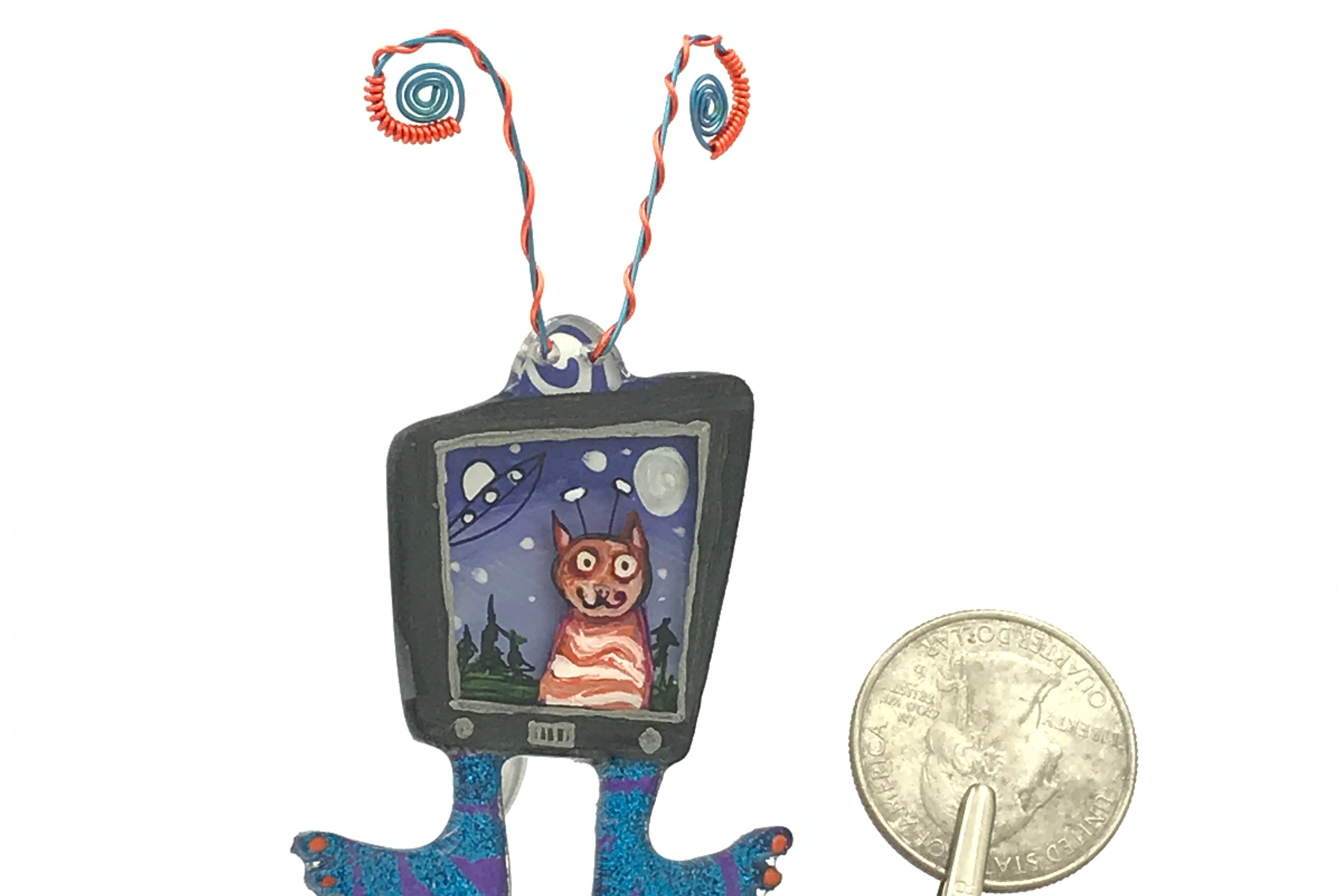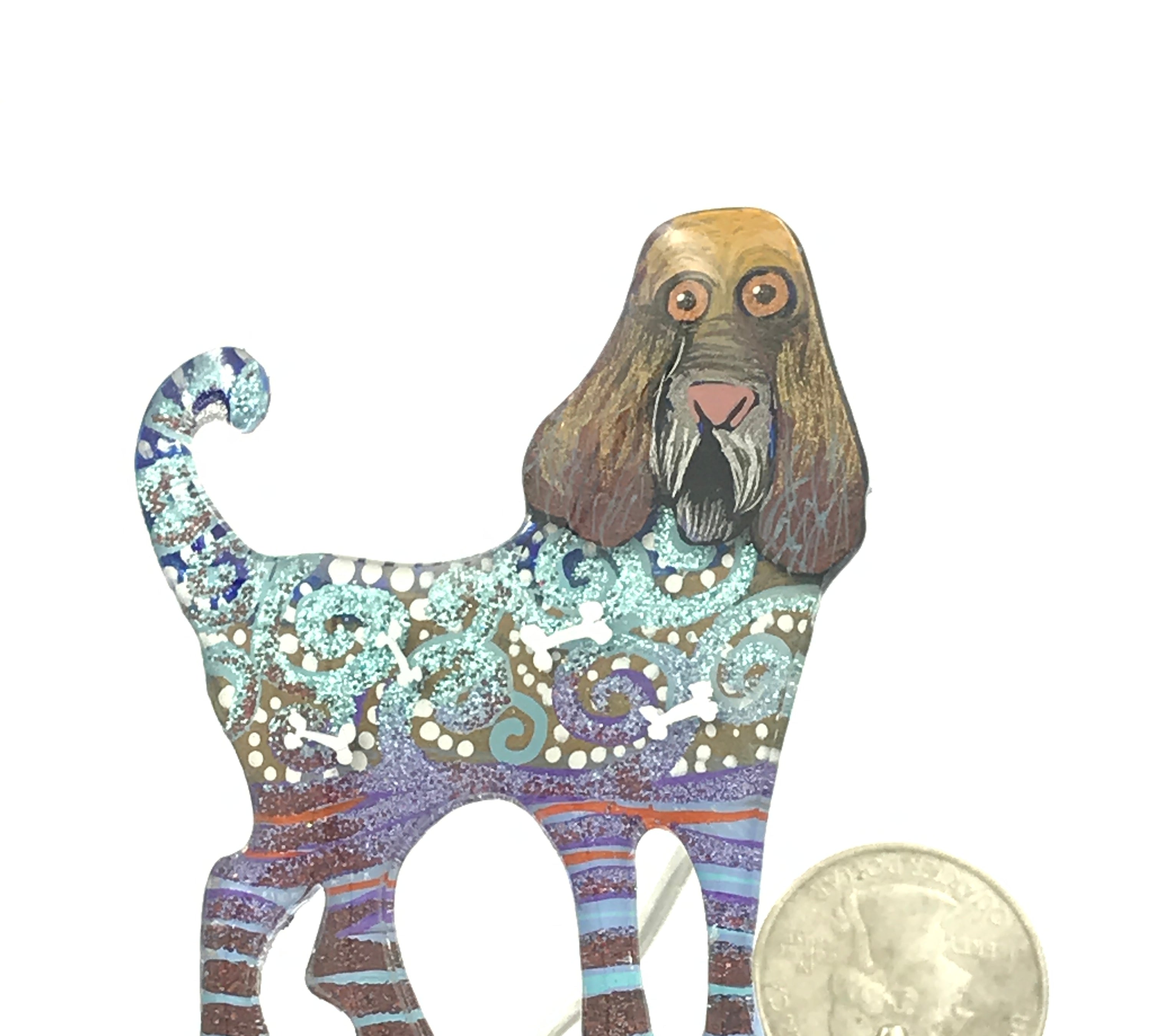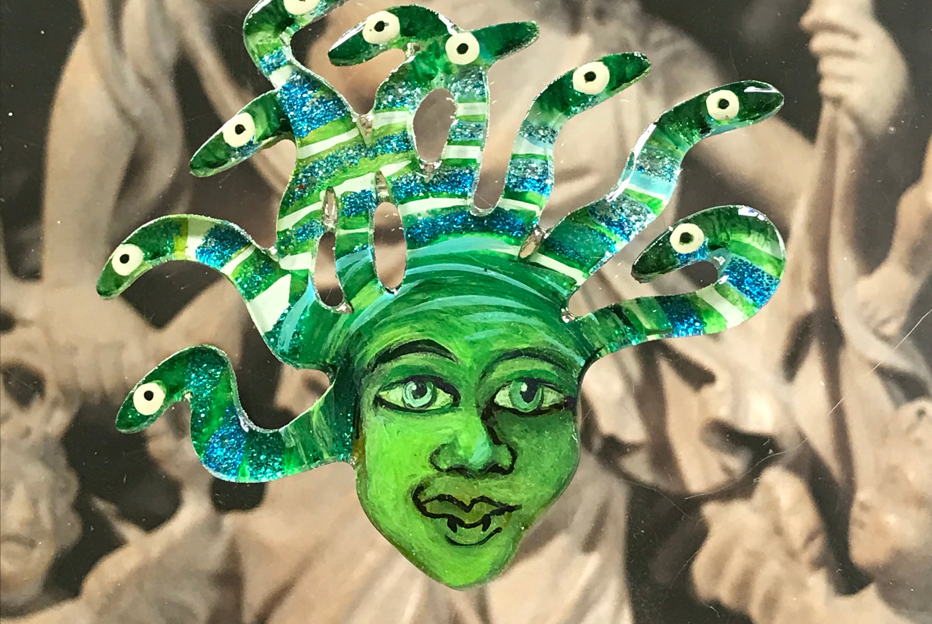 For me, these are little paintings that you can wear. If you are thinking of shrinky-dinks, I'm sure that was in my mind when I came up with lasercutting the shapes and then painting with the same paints I use on canvas. It's a multi layered process that takes a long time. The painting takes the longest, but it is the most rewarding. They are coated with a thick and sturdy glaze that brings out the depth and color.
