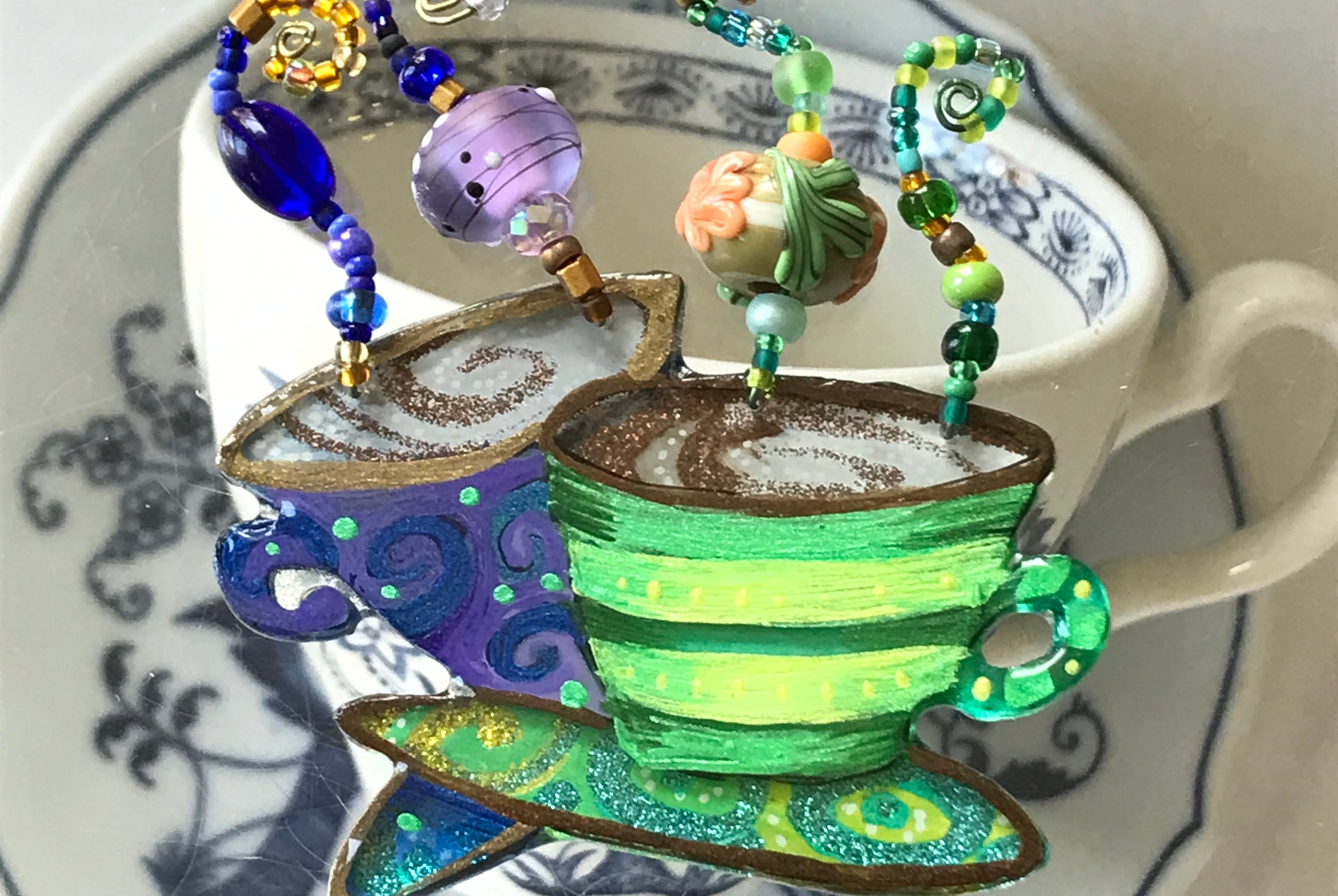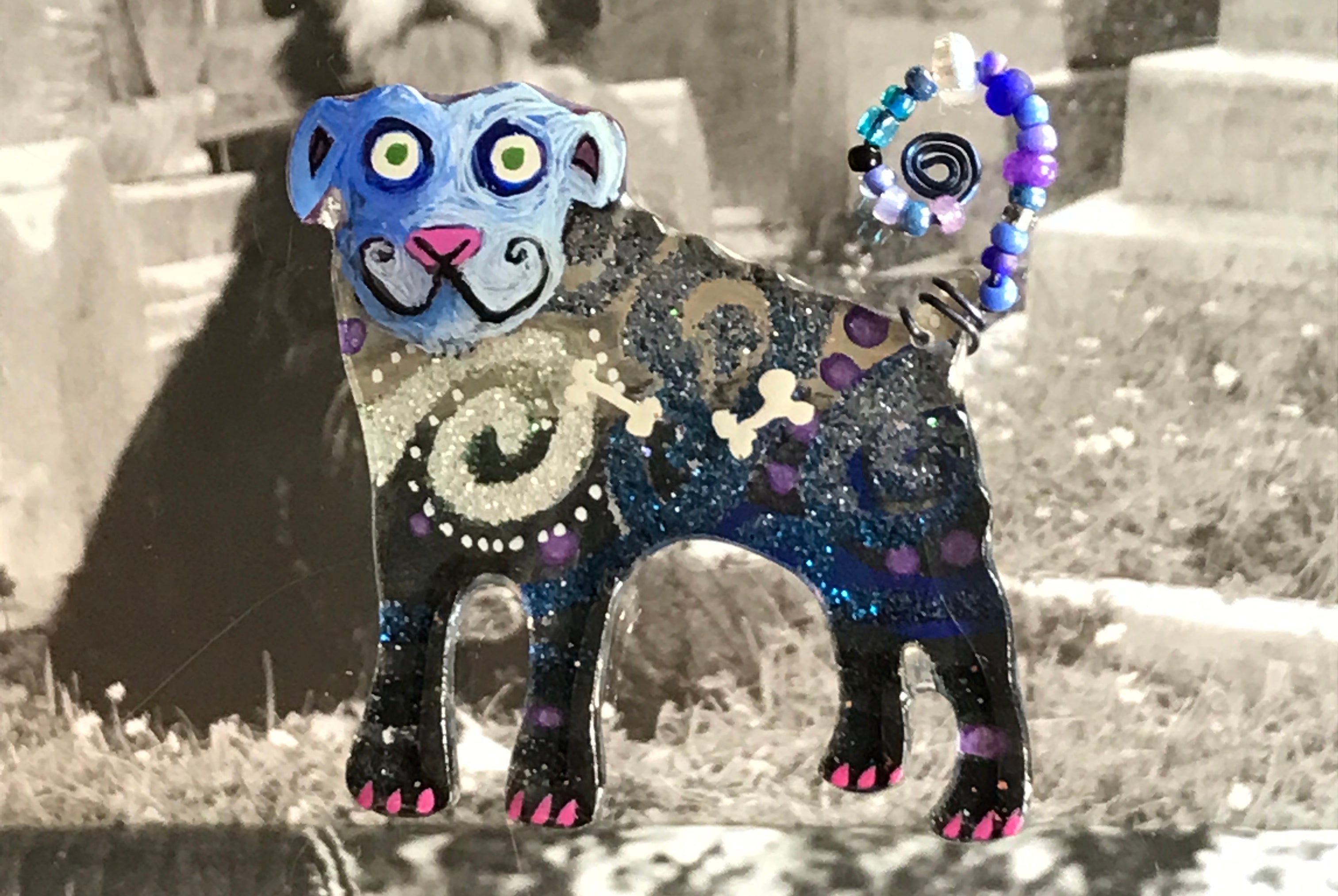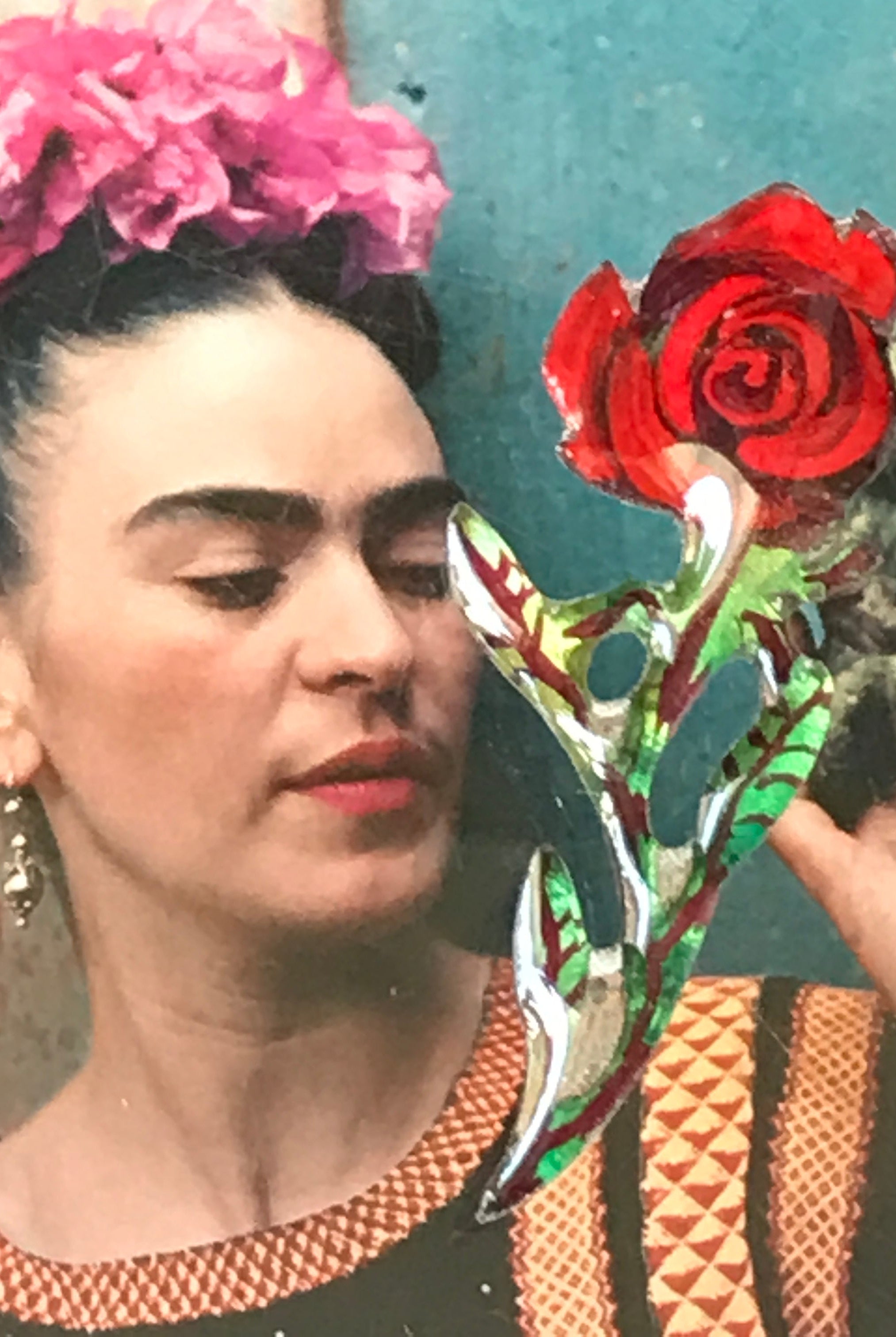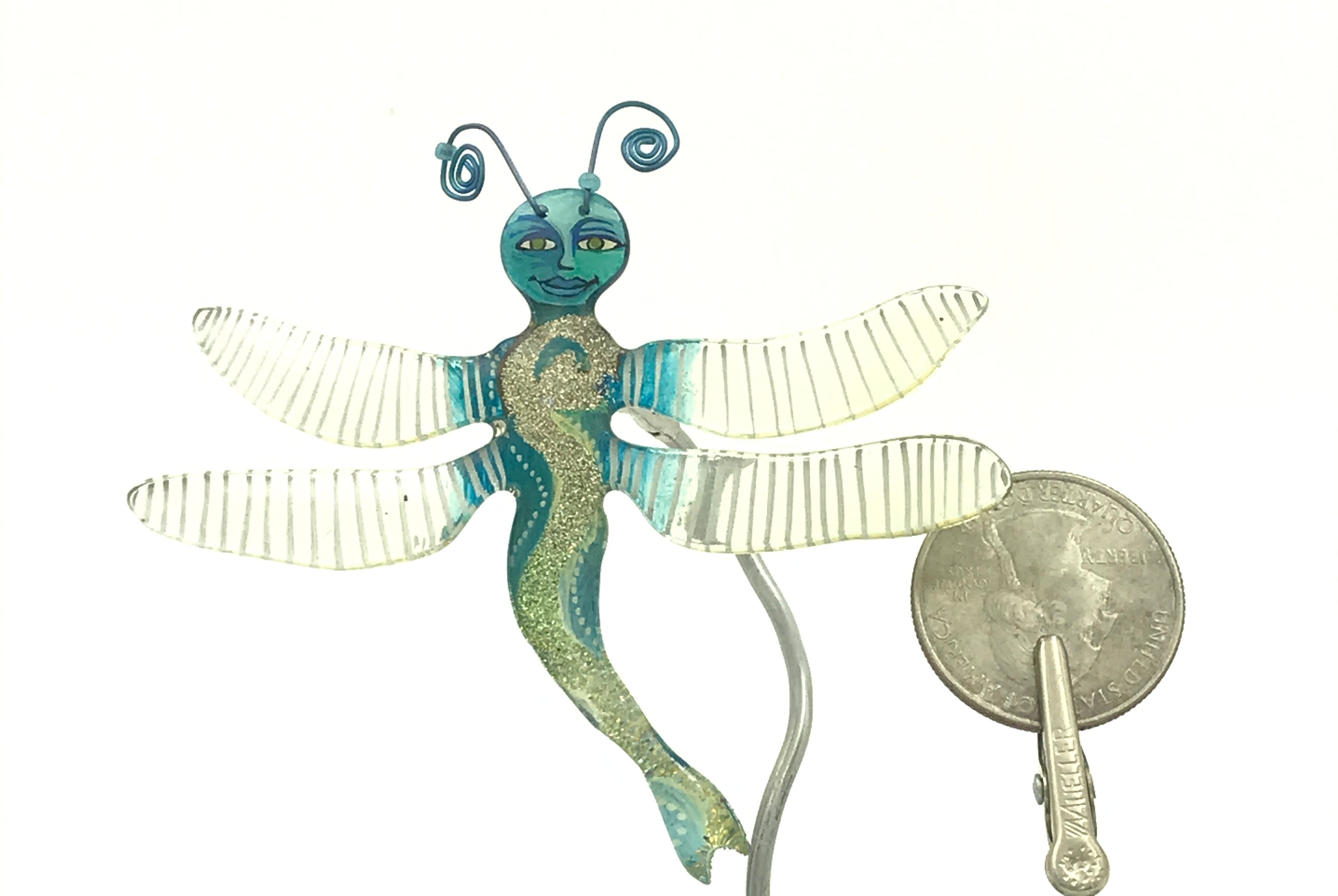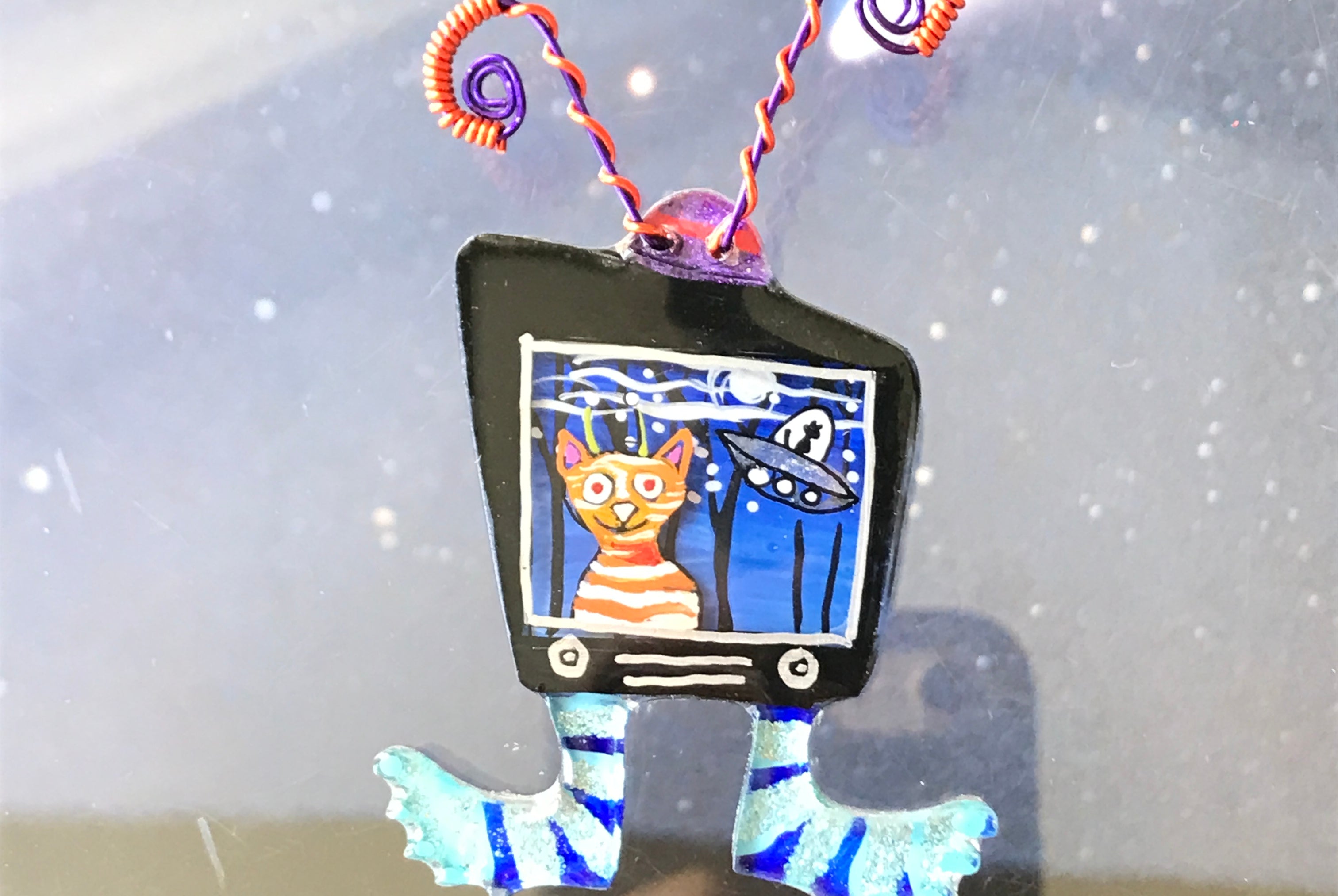 For me, these are little paintings that you can wear. If you are thinking of shrinky-dinks, I'm sure that was in my mind when I came up with lasercutting the shapes and then painting with the same paints I use on canvas. It's a multi layered process that takes a long time. The painting takes the longest, but it is the most rewarding. They are coated with a thick and sturdy glaze that brings out the depth and color.