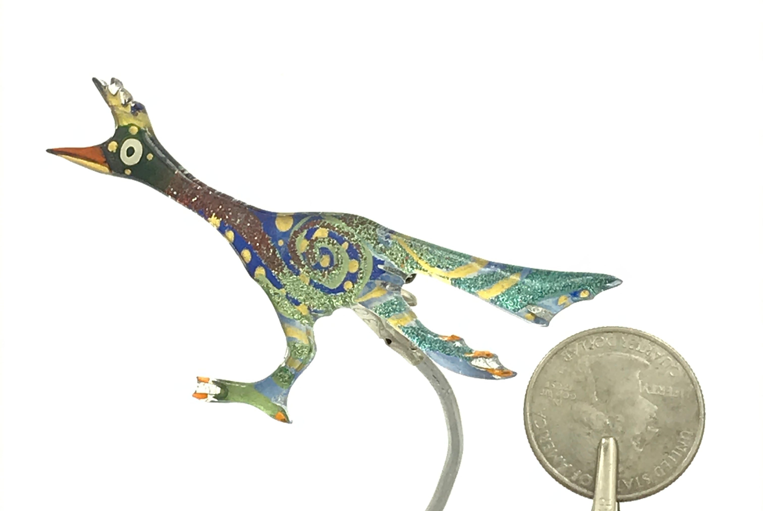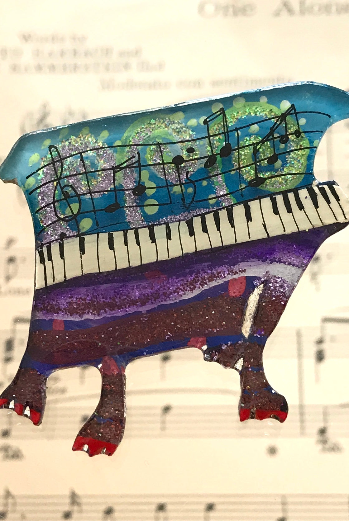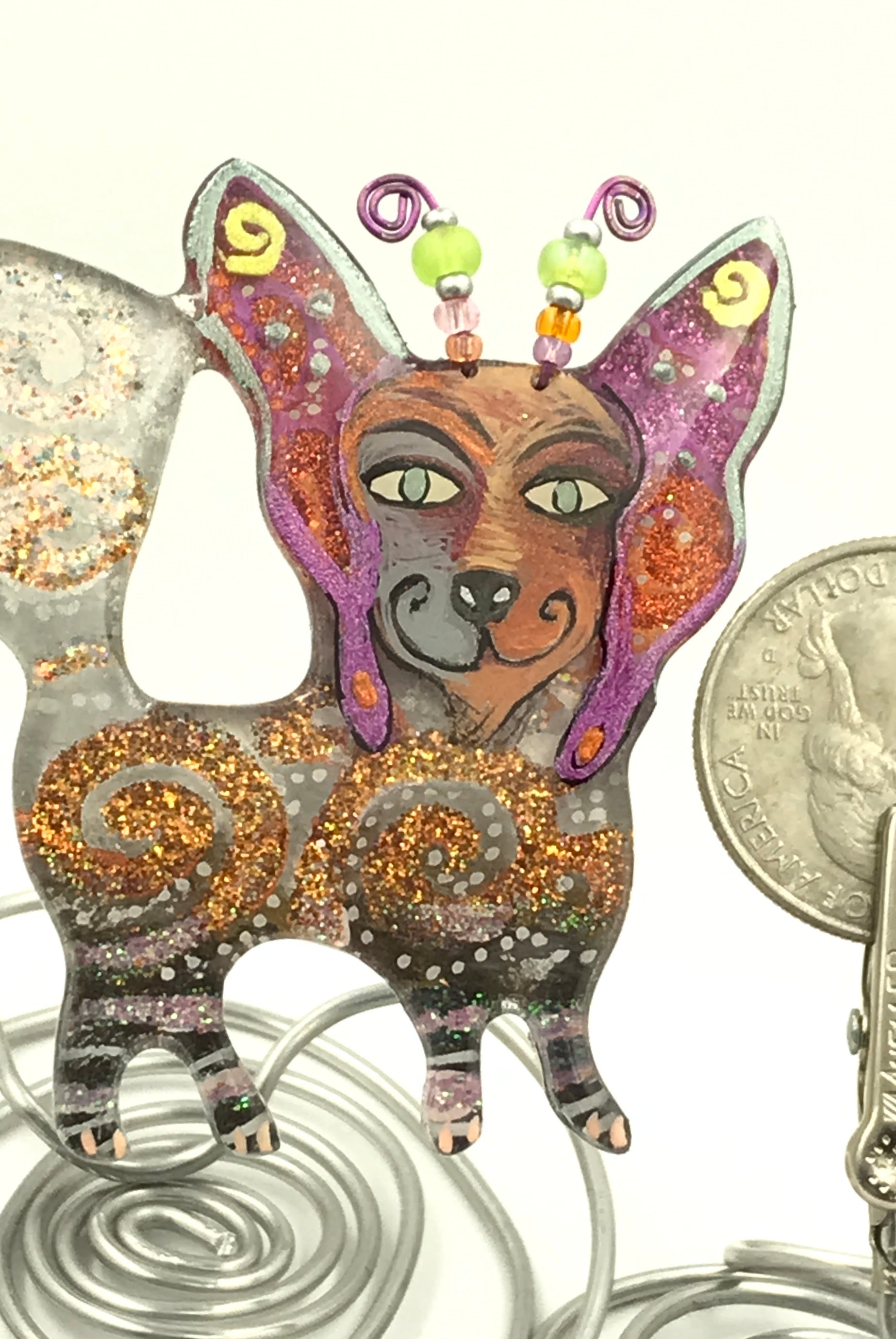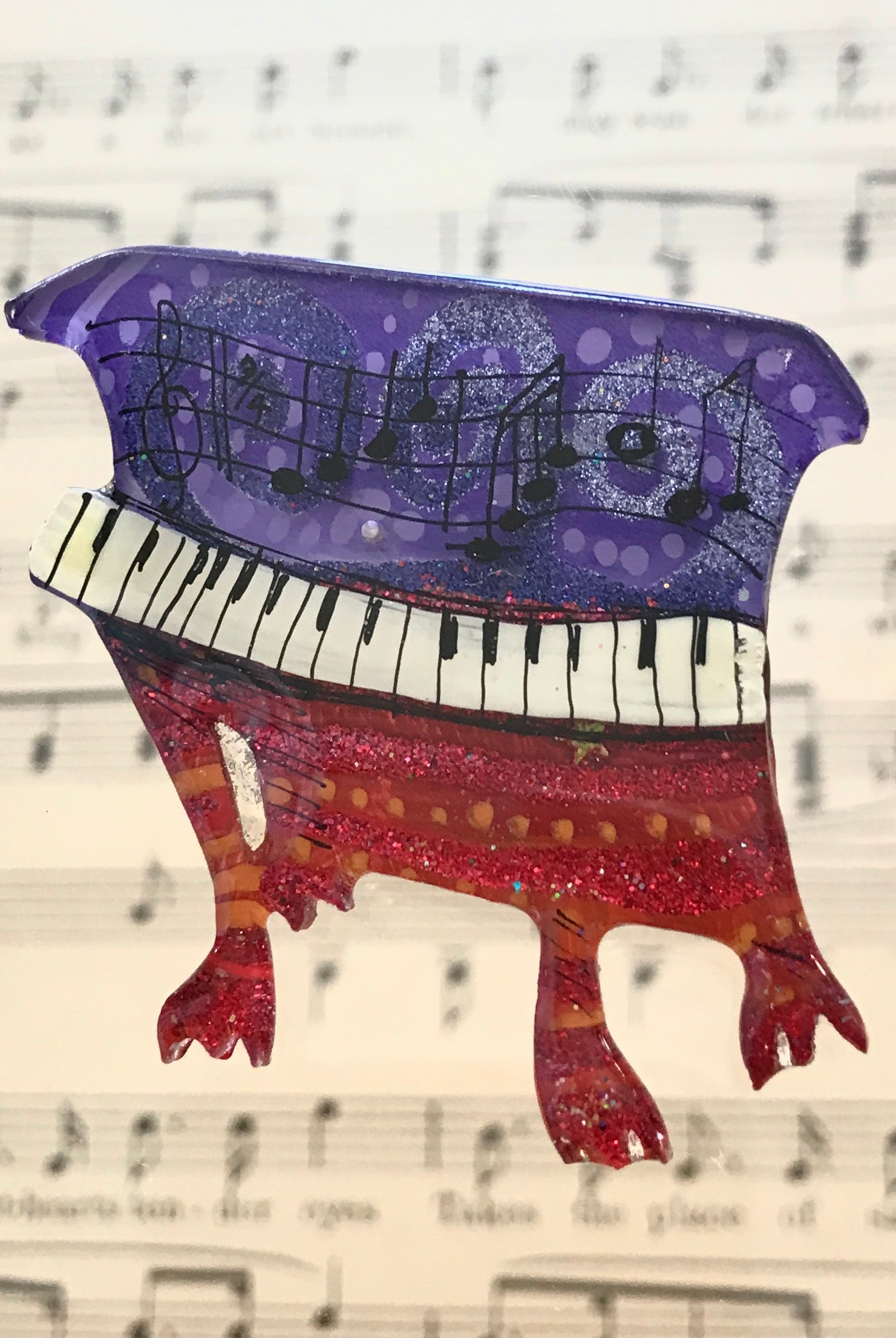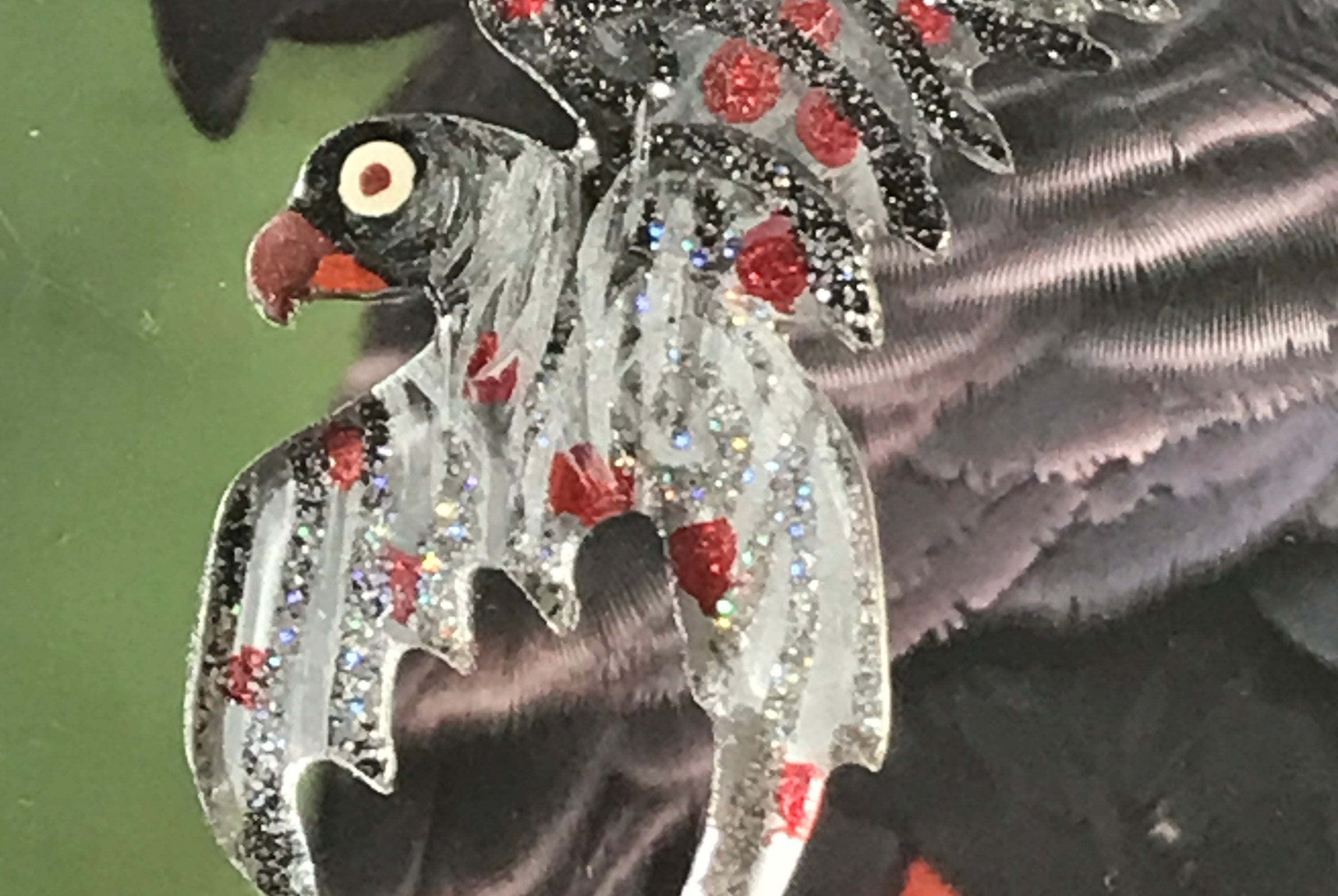 For me, these are little paintings that you can wear. If you are thinking of shrinky-dinks, I'm sure that was in my mind when I came up with lasercutting the shapes and then painting with the same paints I use on canvas. It's a multi layered process that takes a long time. The painting takes the longest, but it is the most rewarding. They are coated with a thick and sturdy glaze that brings out the depth and color.