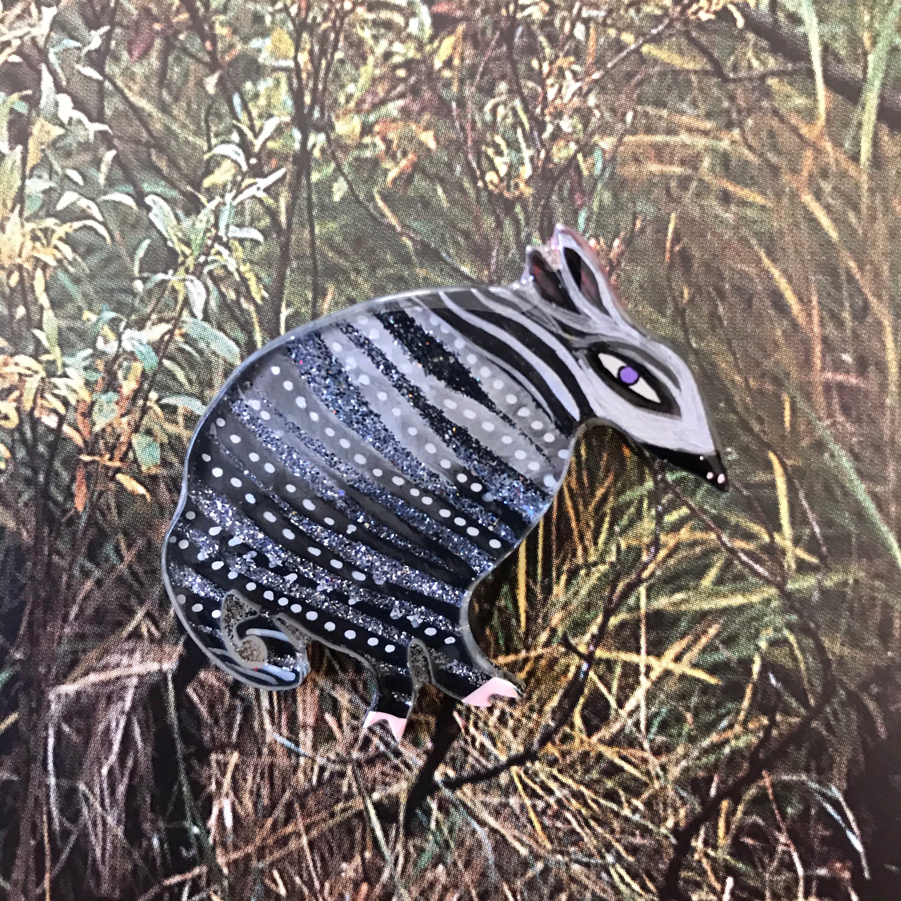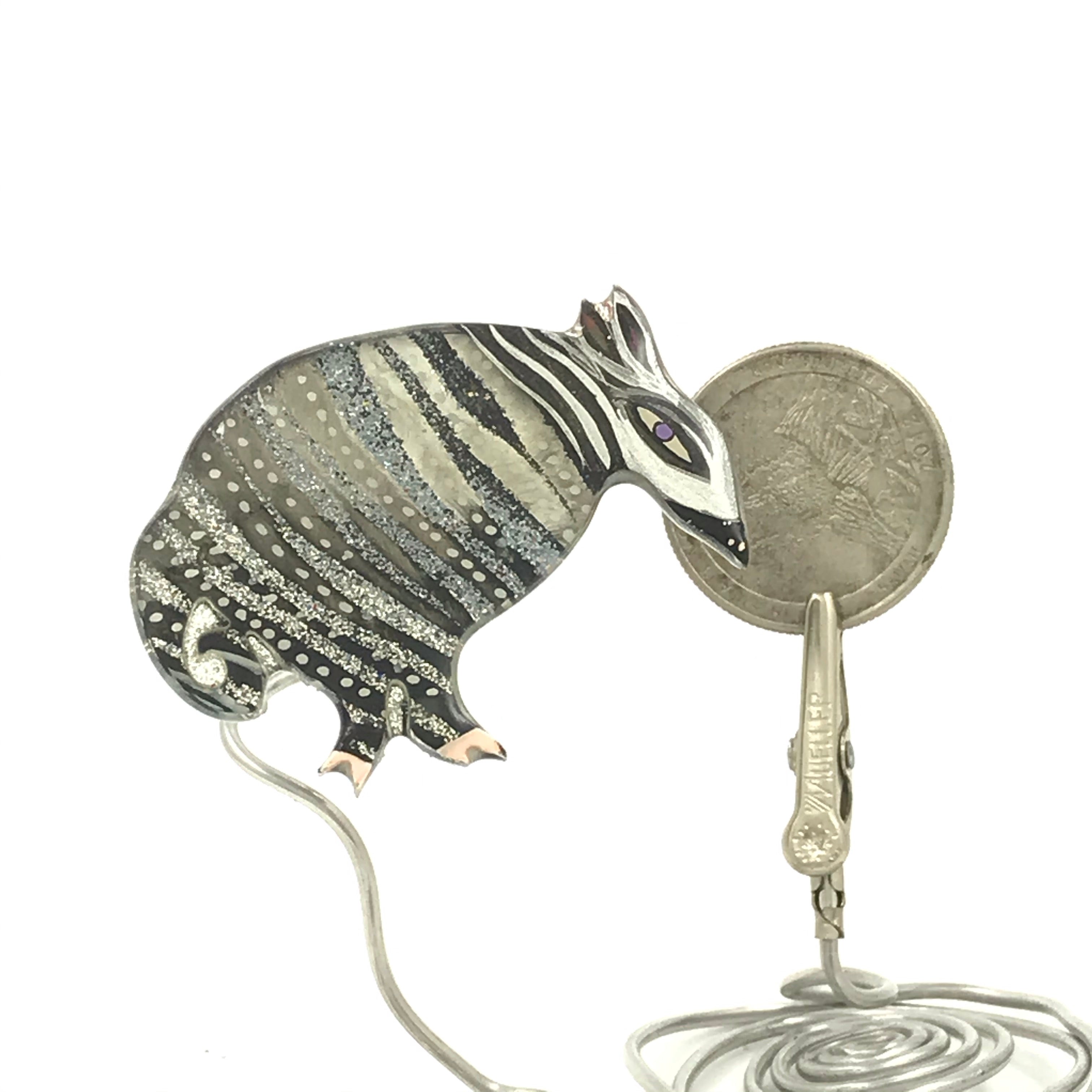 If you are pin challenged, you can have a complimentary stand that will clip on the pinback, just indicate in your special instructions. It’s a little work of art, there are lots of ways to display it.