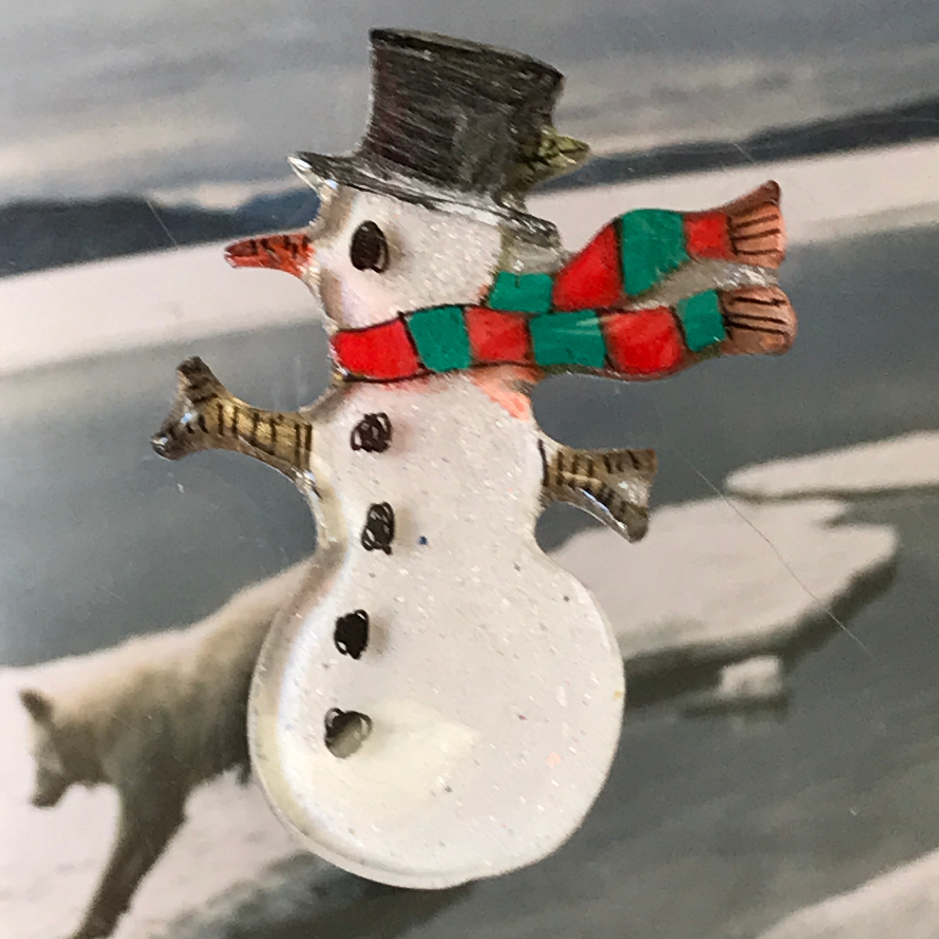 A tiny snowperson enjoying the sunny winter day with no worries of melting as he is made of lucite:).