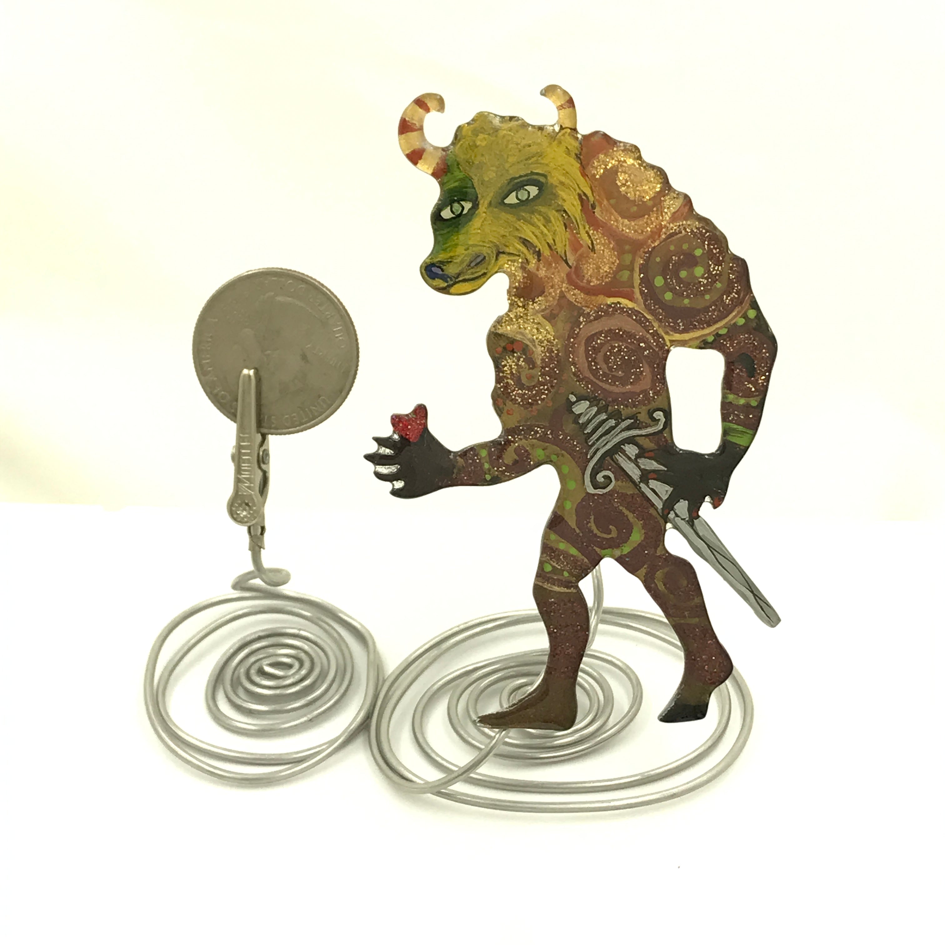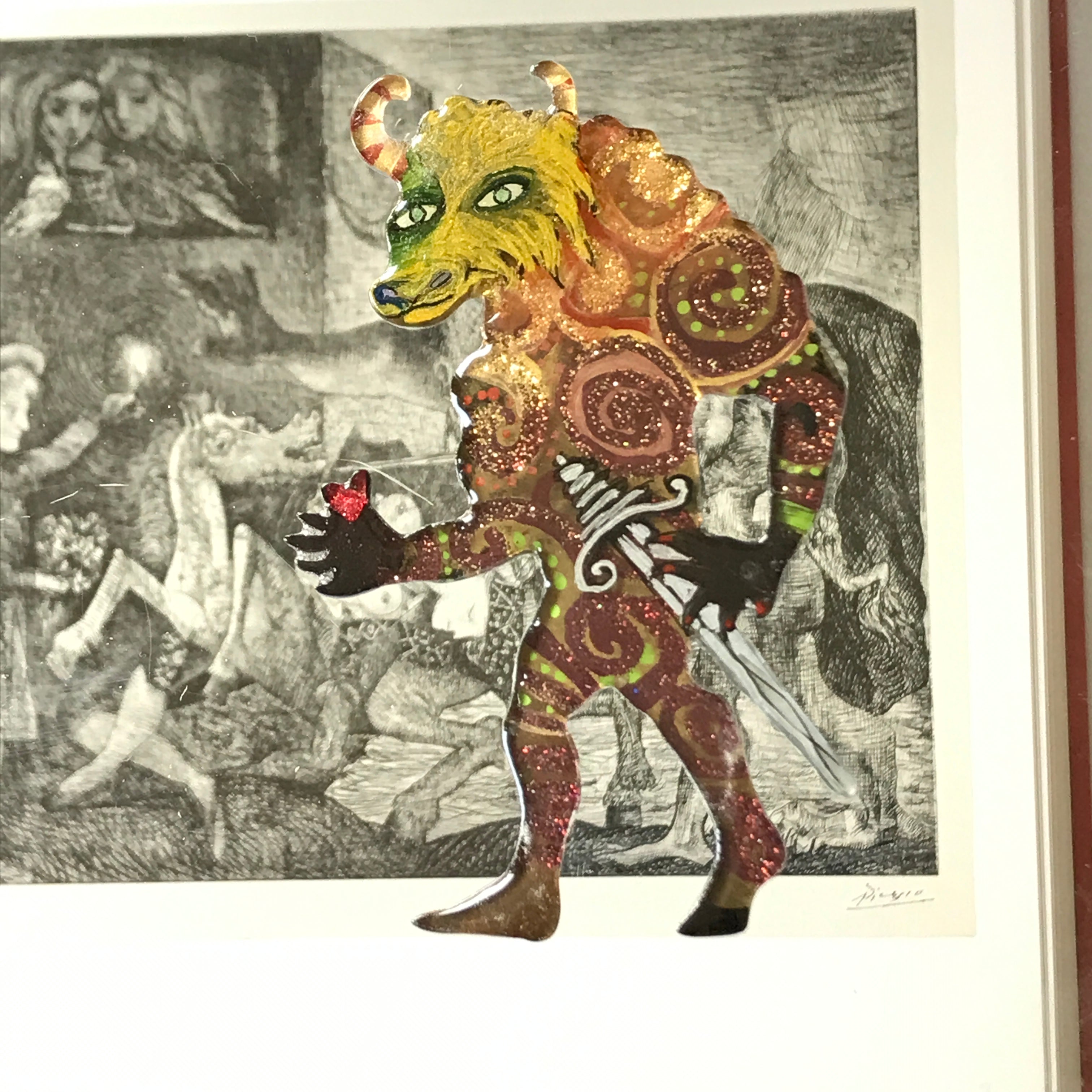 The story of the minotaur is as varied as any ancient myth, told over and over down through human existence. Usually he is depicted as a murderous monster slaying any who dare to make it to the center of King Midas' labyrinth; where he guards the king's gold. The Minotaur, in this representation, is from Picasso's version: Theseus only blinds the Minotaur, after which he becomes a symbol of peace and wanders the world with a young girl (representing innocence and the light of peace) speaking words of love.