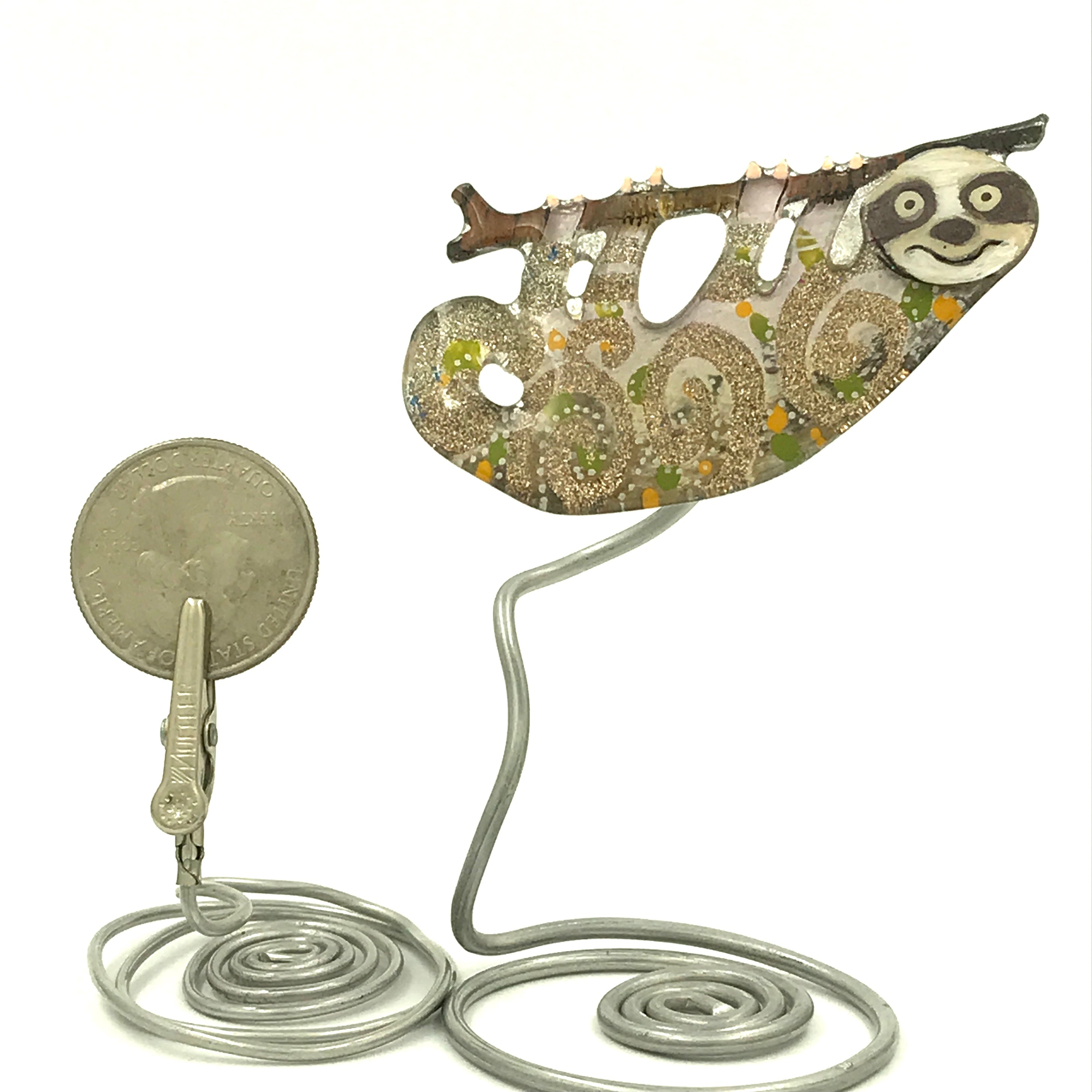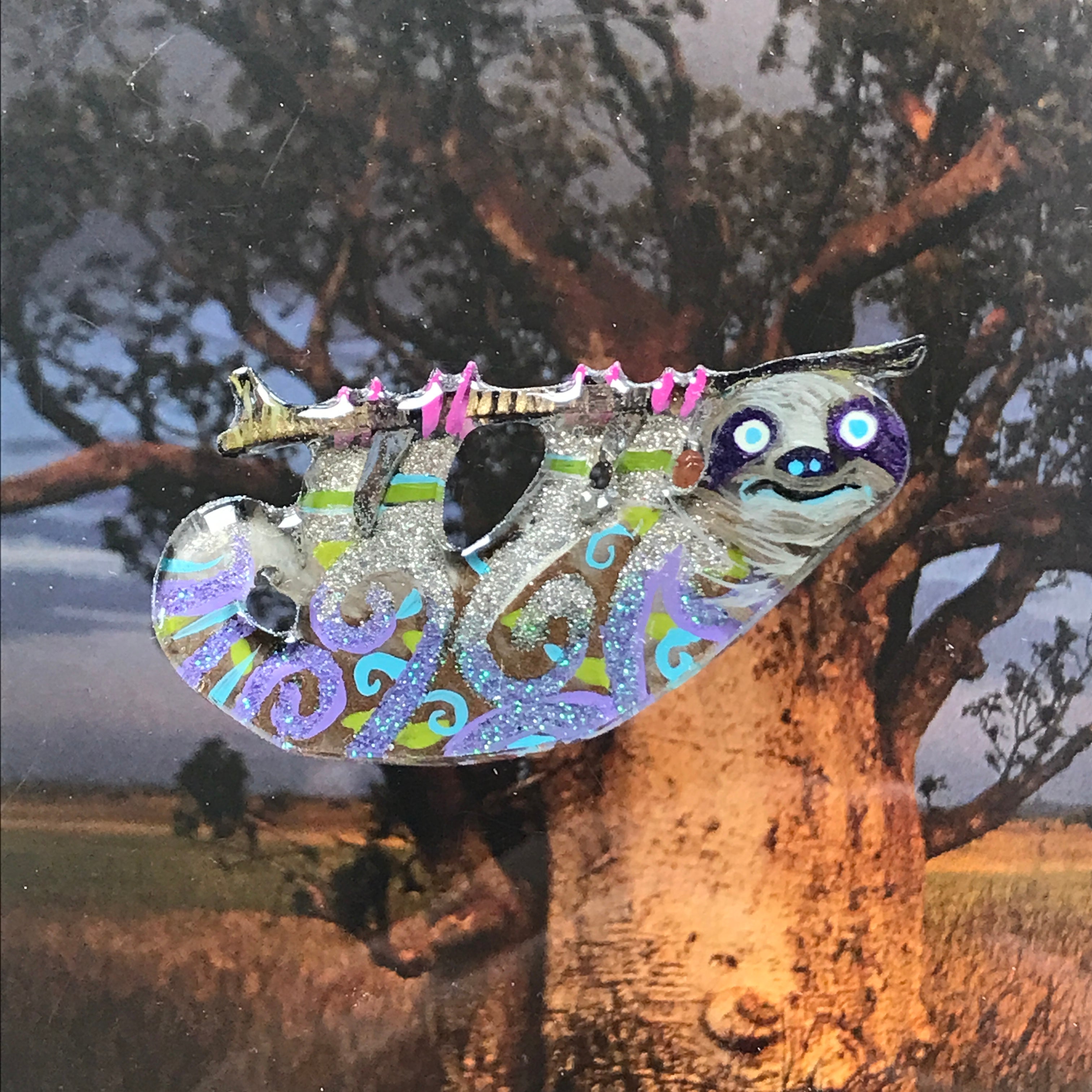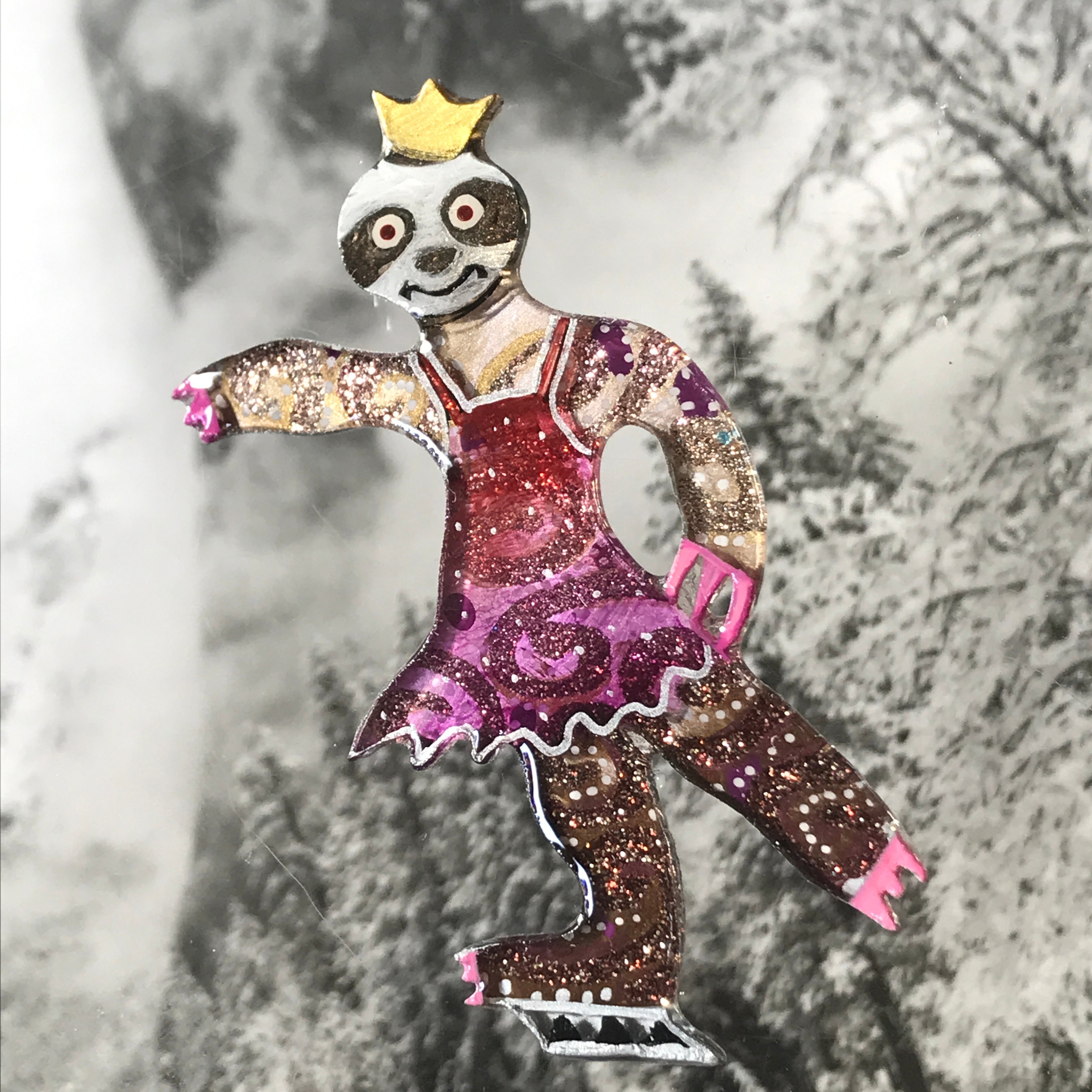 Sloths have fascinated me for awhile now, but when a customer at a show asked me if I had any iceskater pins, and I said that's a great idea, do you have an animal in mind that would be iceskating?  She was looking on her phone for a picture of an iceskater shape to show me, so she didn't answer right away.  With the speed of thought I saw a sloth as the iceskater because I thought what a great contrast that would be.  My customer was thinking a bird, but the die was cast, an iceskating sloth was born.