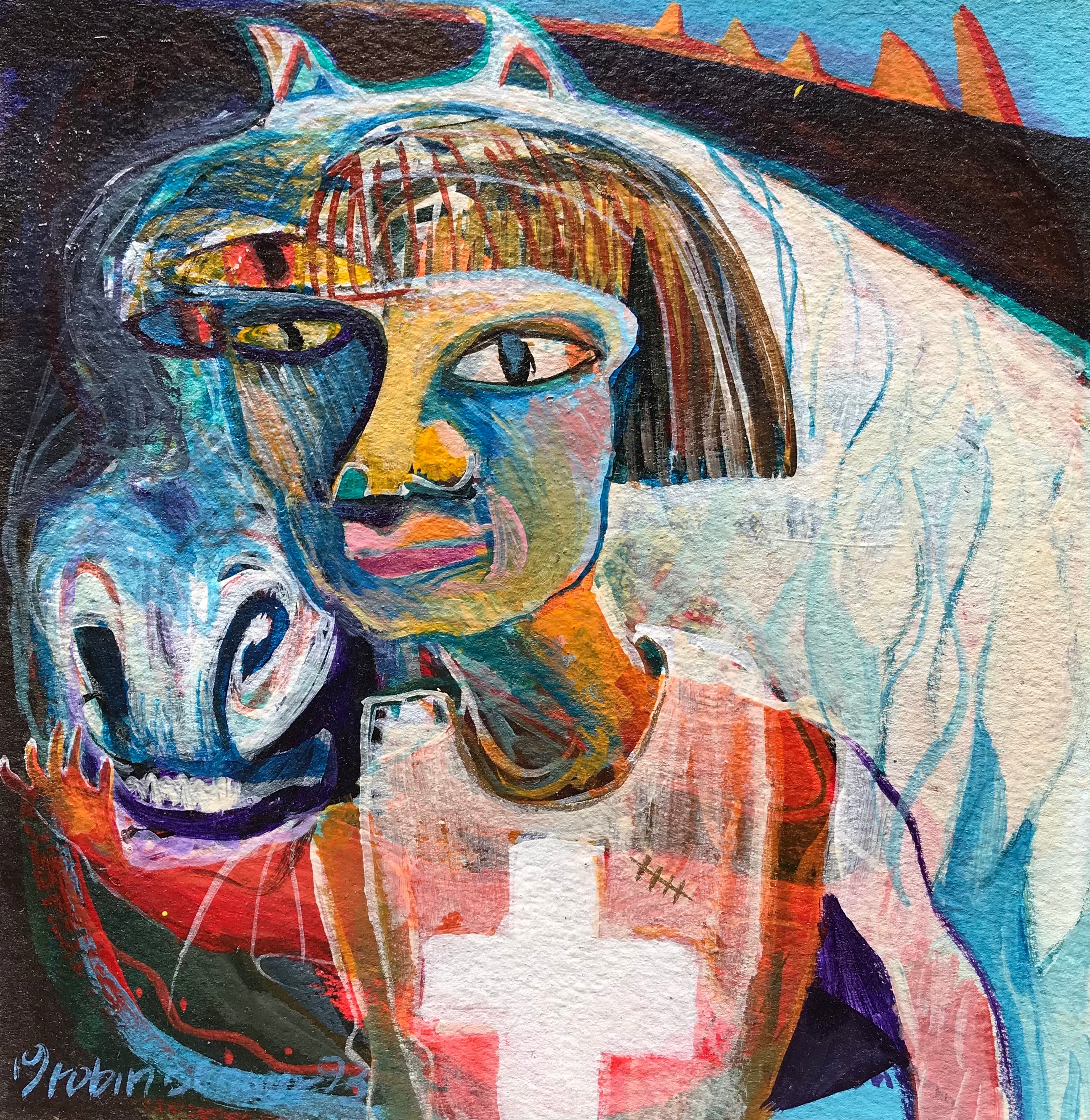 This is an original acrylic on handmade paper. It measures about 6.5 inches by 6.5 inches and is unframed