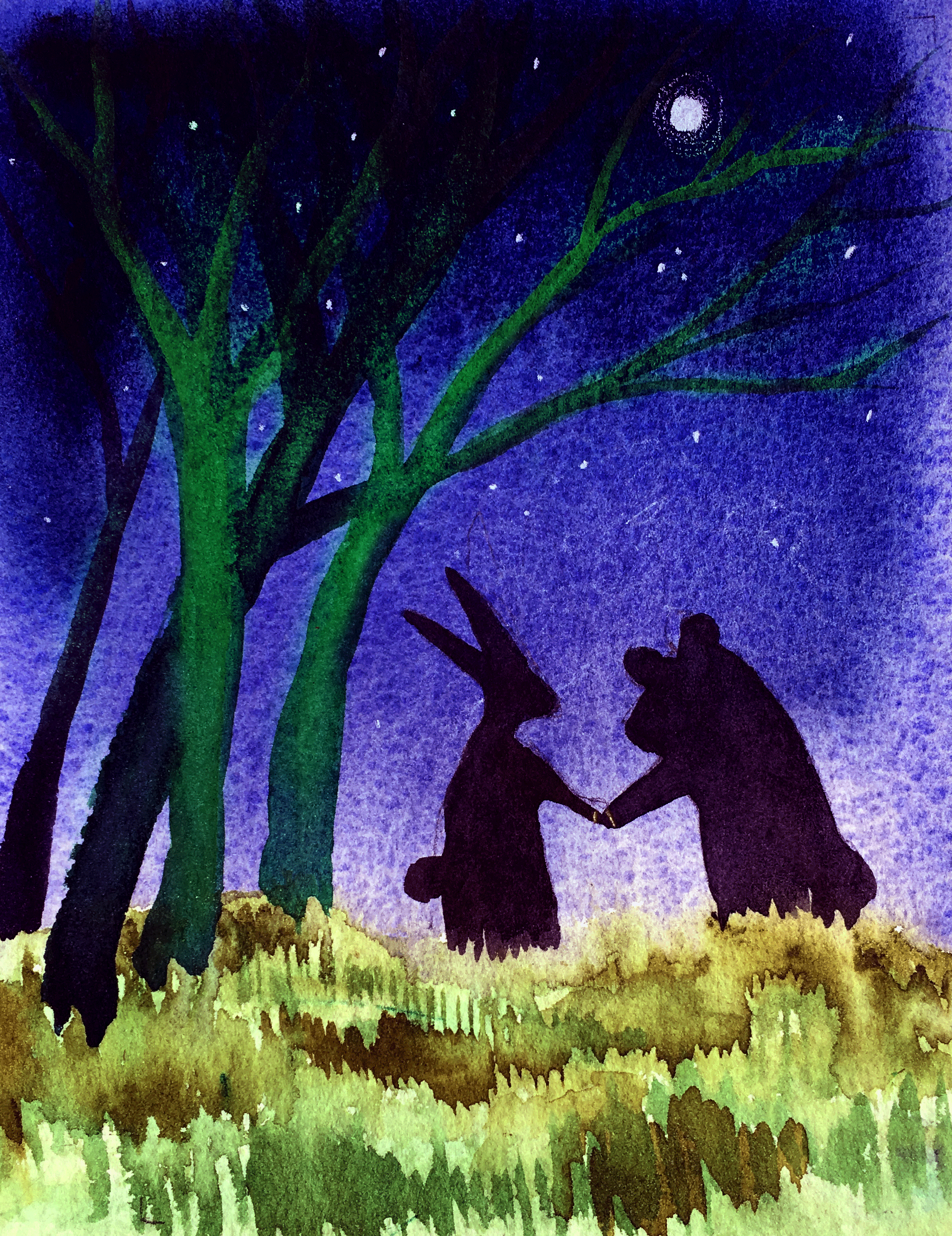 A rabbit and a bear hold hands in the forest. Tiny gold rings are on each of their hands. This was created for the midsummer night's dream Shadow Heart Collective challenge in the summer of 2016 on Instagram. The word was 'Marriage'. Each print has Love is Love printed on the bottom. Everyone should be able to marry whomever they love.