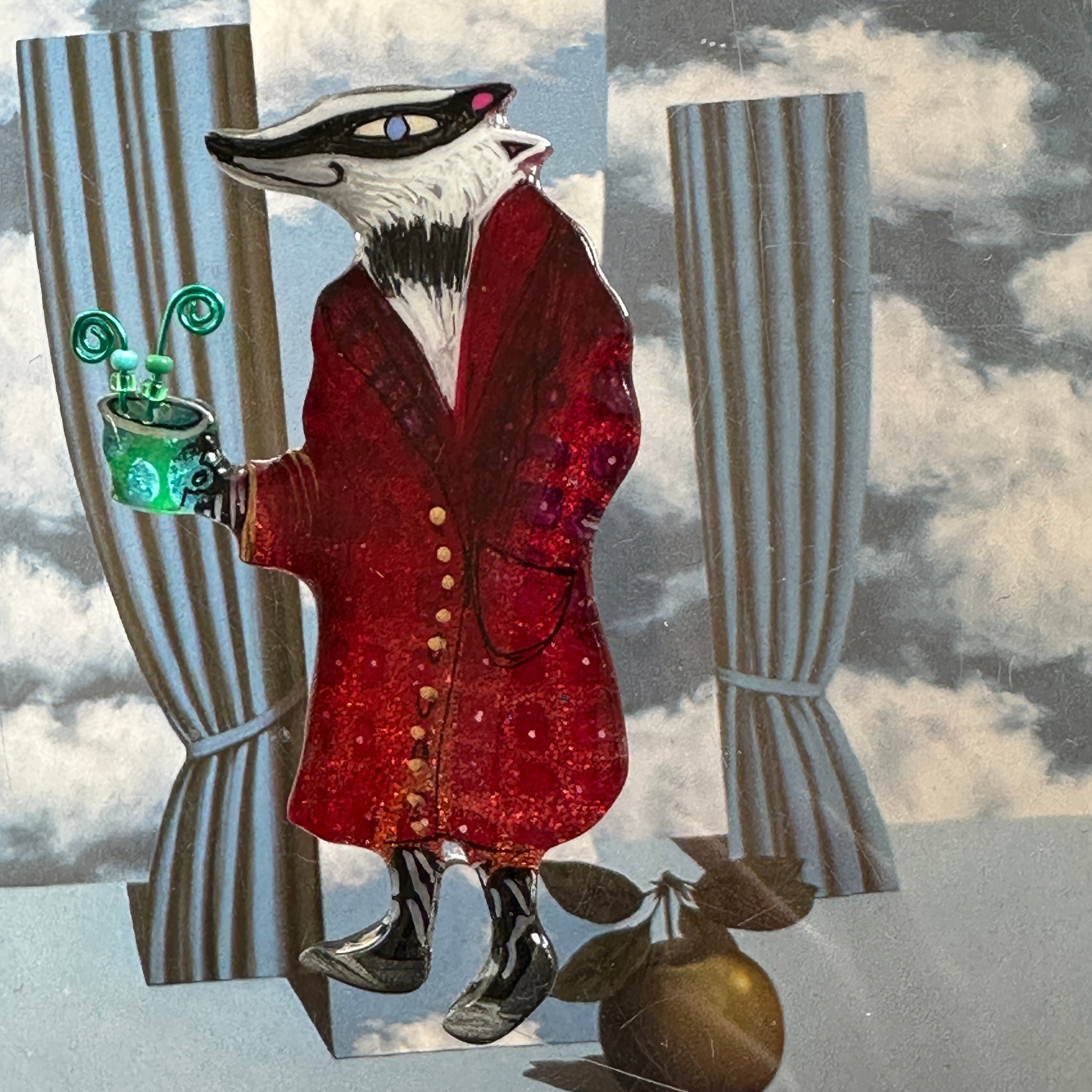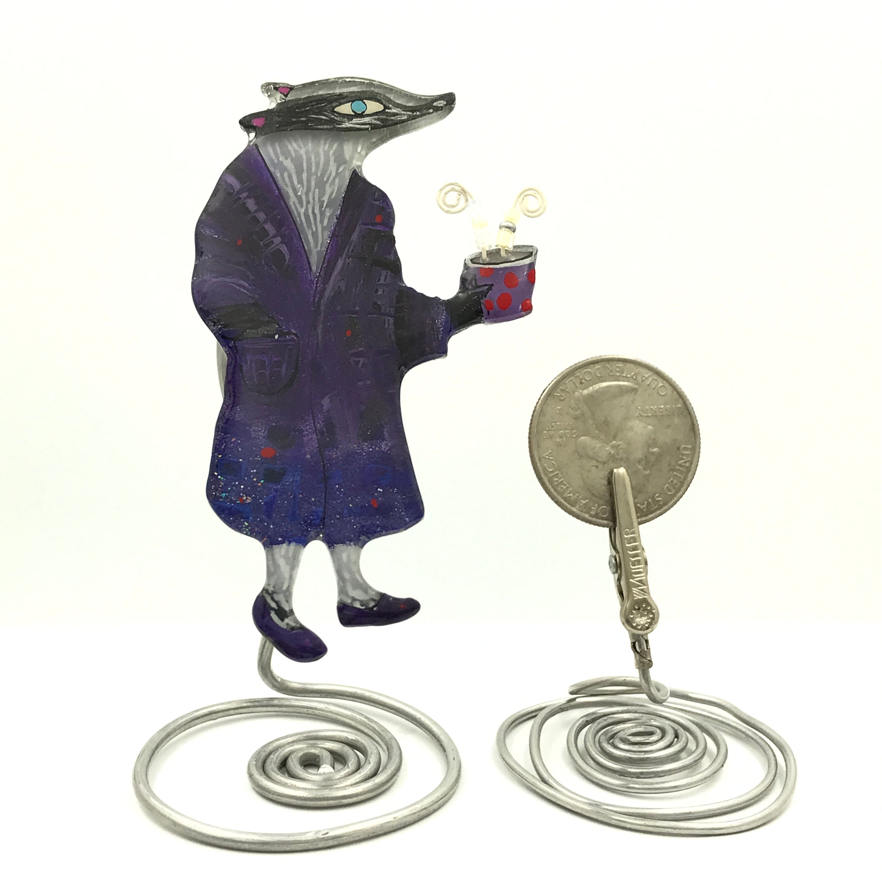 If you are pin challenged, you can have a complimentary stand that will clip on the pinback, just indicate in your special instructions. It’s a little work of art, there are lots of ways to display it.