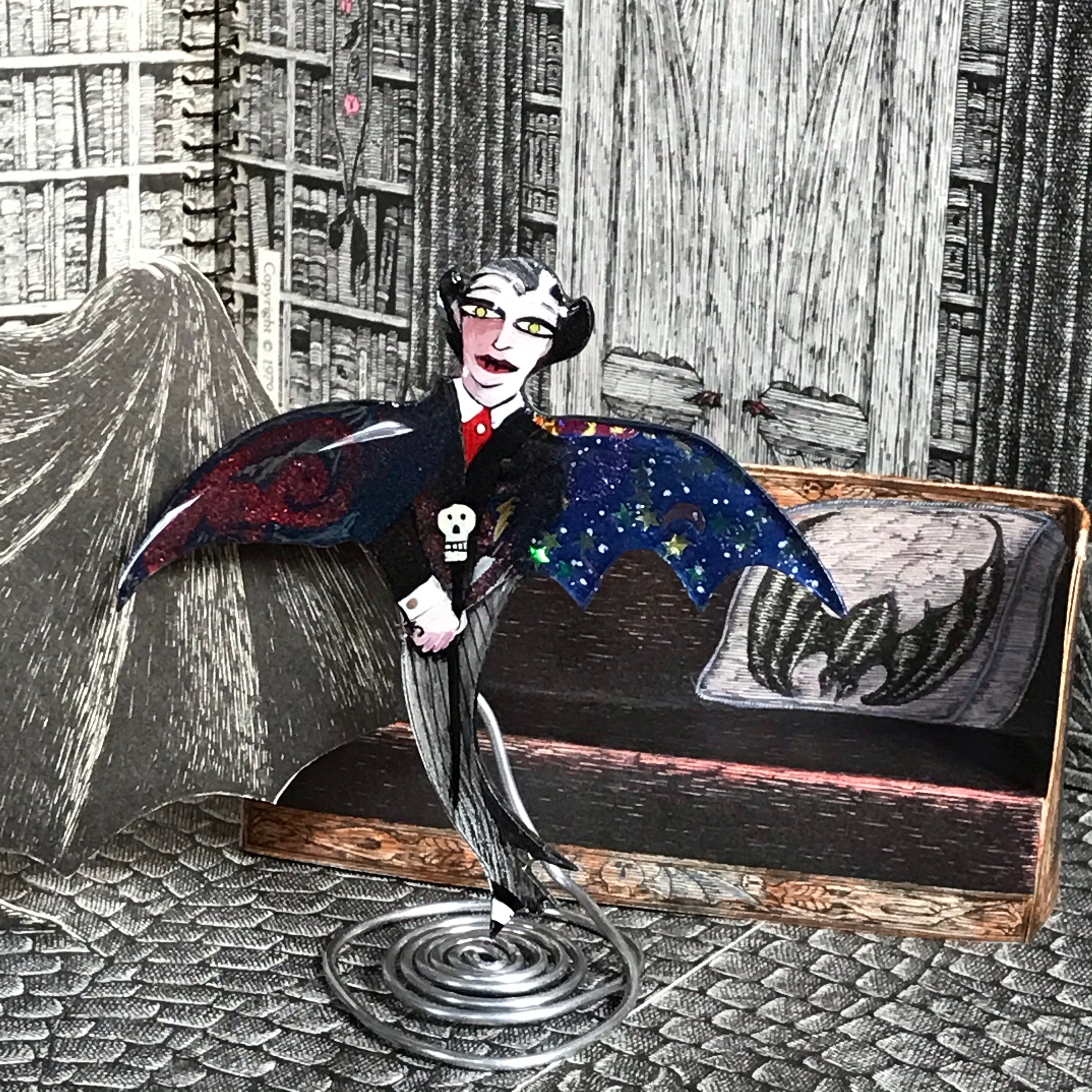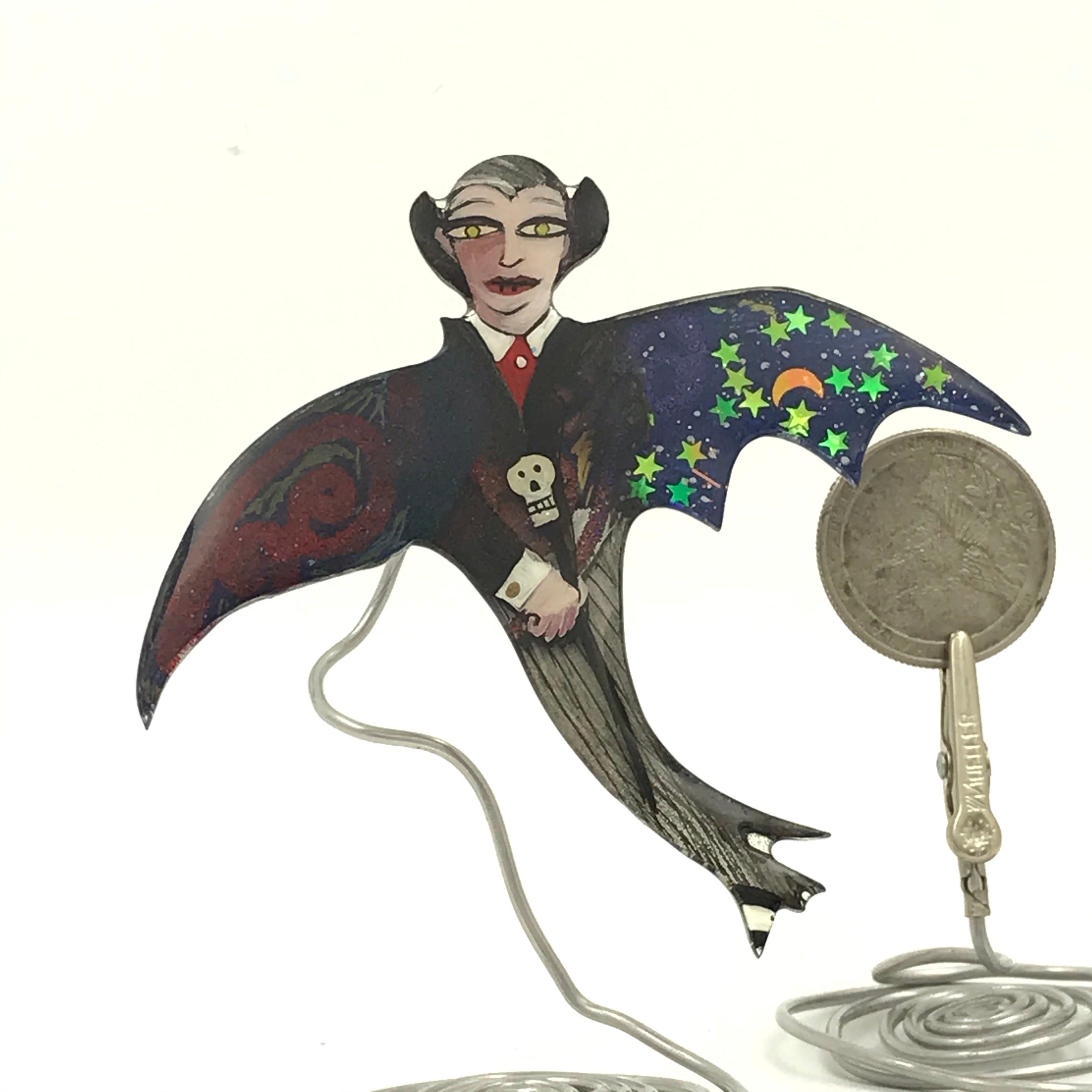 I love how I paint my Dracula pins, but I do admit they are more Count Chocula than Bram Stoker's Dracula:) I created the shape to show his shapeshifting ability to go from bat to human form.