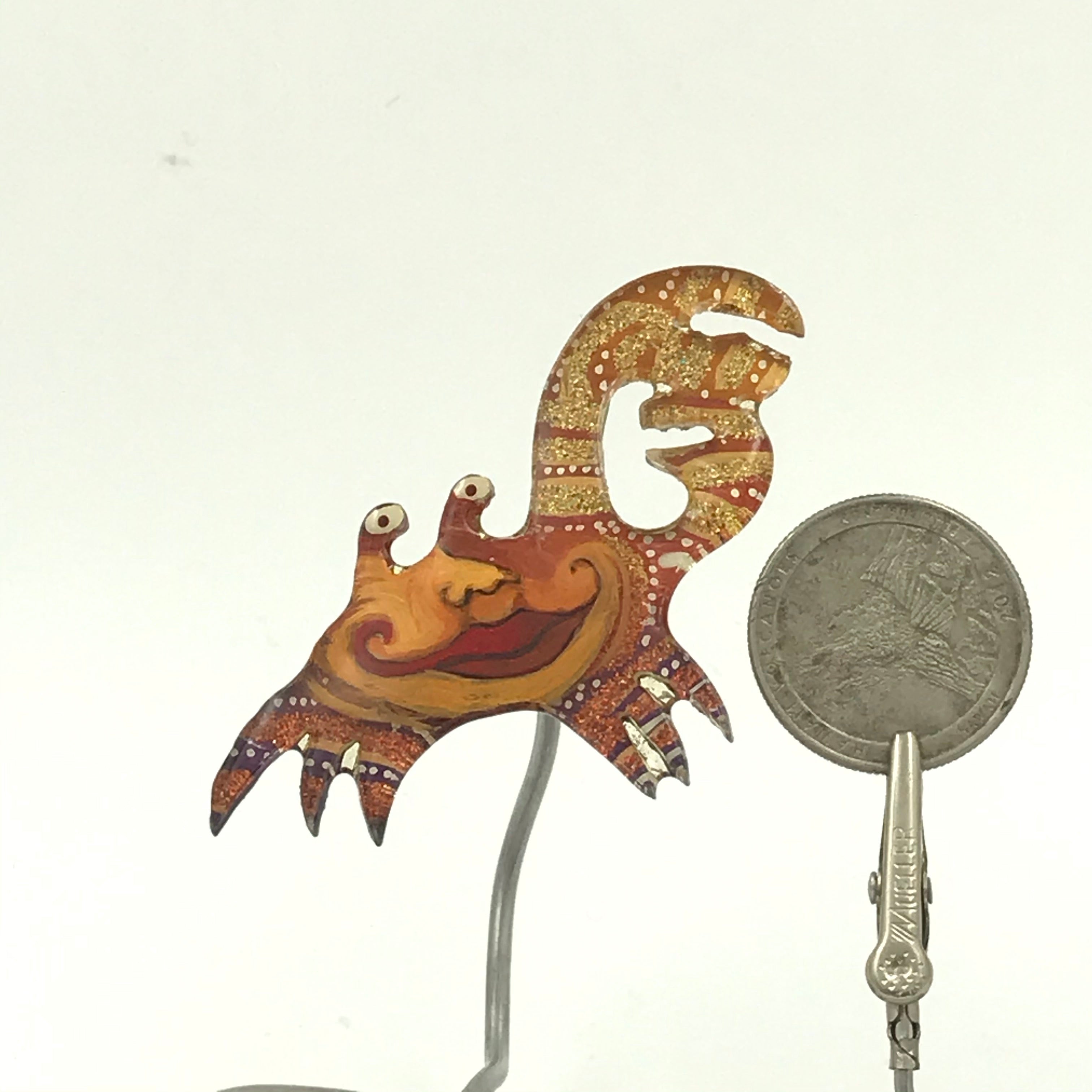 If you are pin challenged, you can have a complimentary stand that will clip on the pinback, just indicate in your special instructions. It’s a little work of art, there are lots of ways to display it.