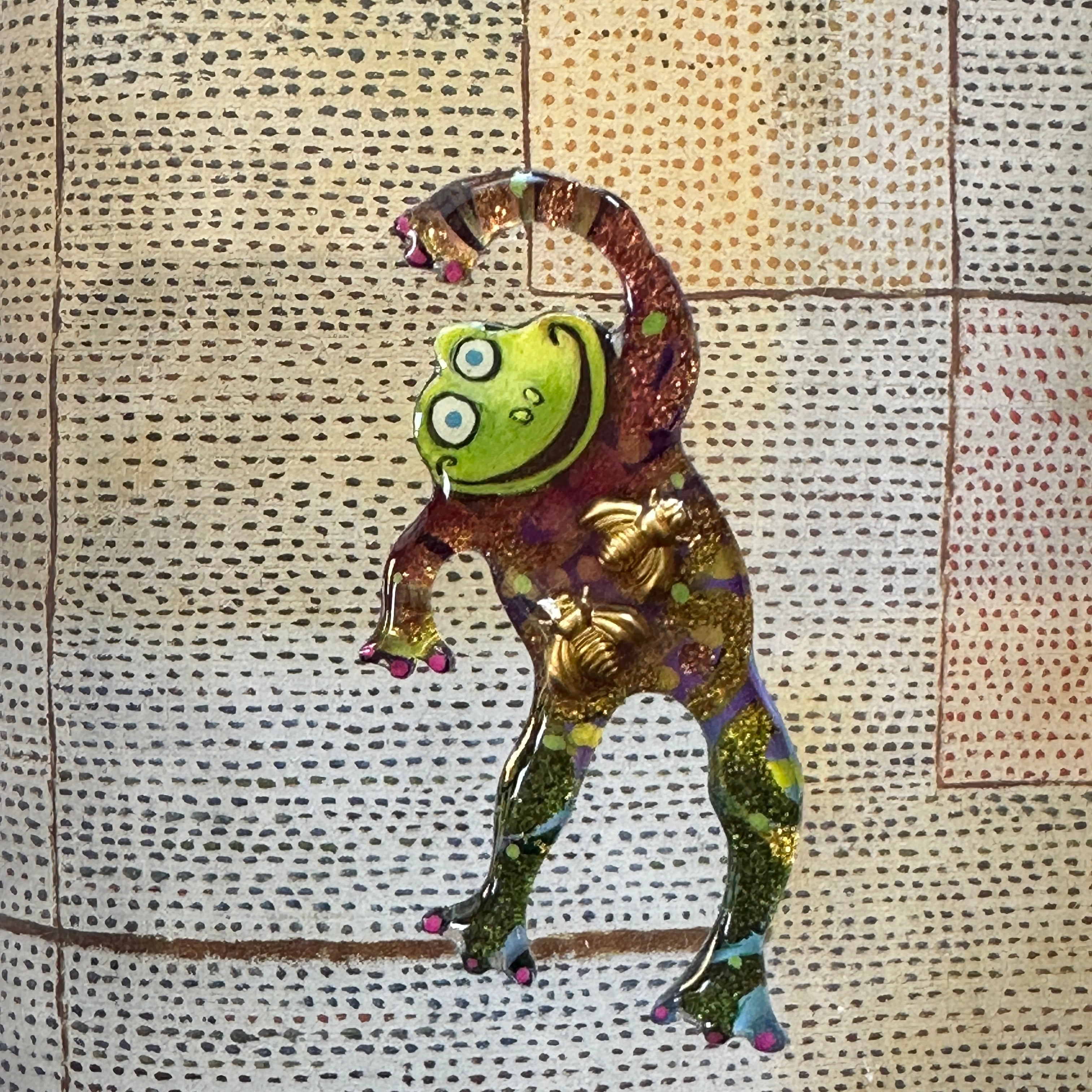 If you are pin challenged, you can have a complimentary stand that will clip on the pinback, just indicate in your special instructions. It’s a little work of art, there are lots of ways to display it.
