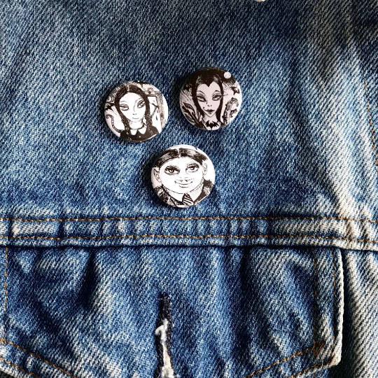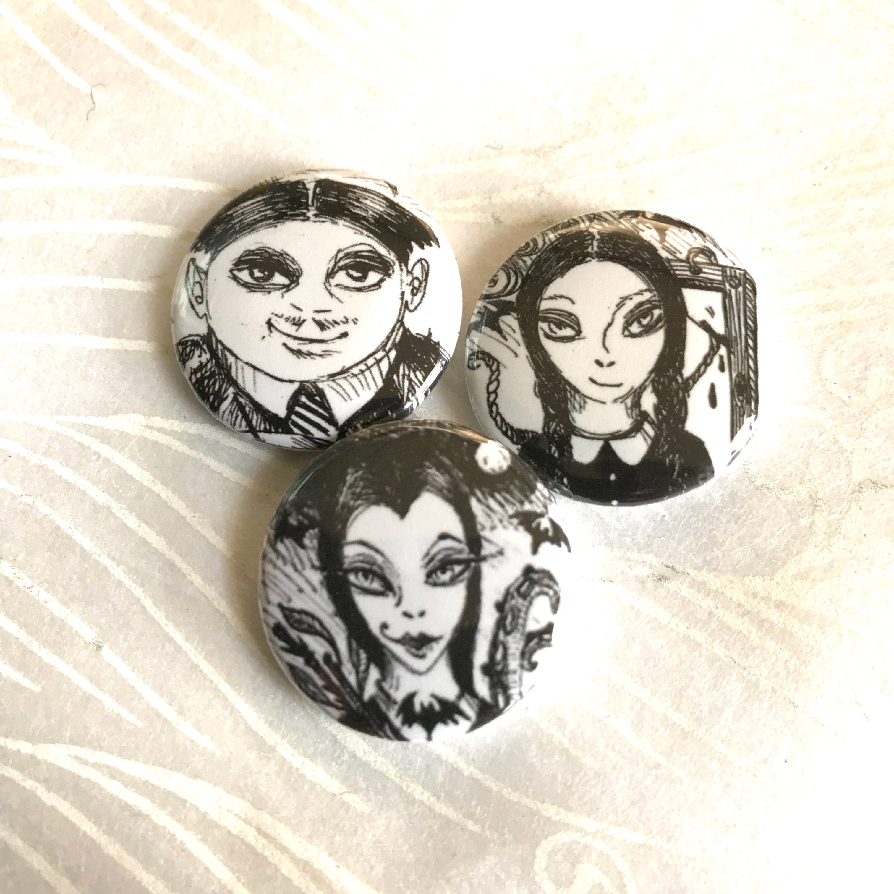 They're teeny tiny spooky.  Gomez, Morticia and Wednesday, reseen and drawn by me, Robin Senour.  They are a mere one inch in diameter.